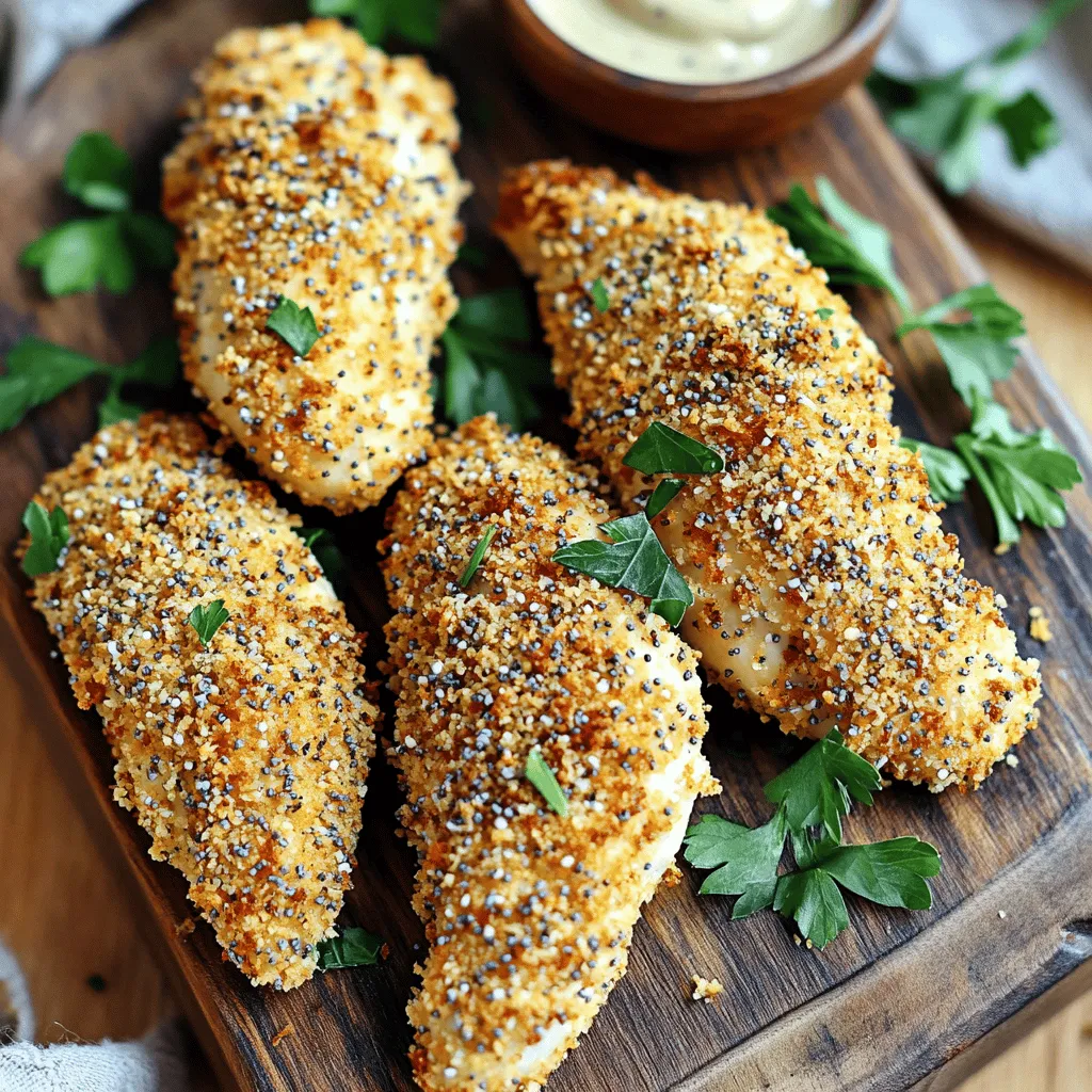 - 1 pound boneless chicken tenders - 1 cup panko breadcrumbs - 2 tablespoons everything bagel seasoning The main ingredients for this dish are simple yet flavorful. Boneless chicken tenders are the star. They cook quickly and stay juicy. The panko breadcrumbs add a nice crunch. Everything bagel seasoning brings all the flavors together. It has garlic, onion, sesame seeds, and poppy seeds. This mix makes each bite tasty and fun. - 1/2 cup all-purpose flour - 2 large eggs, beaten - Cooking spray Next, we need the coating essentials. All-purpose flour gives the chicken a base layer. It helps the egg and breadcrumbs stick. Beaten eggs act as glue for the breadcrumbs. They make sure every piece is well-covered. Cooking spray is key for crispiness. It helps the chicken turn golden brown in the air fryer. - Salt - Freshly ground black pepper Finally, we have the seasoning. A pinch of salt enhances the chicken's natural taste. Freshly ground black pepper adds a mild heat. Together, they boost the overall flavor of the dish. Set your air fryer to 400°F (200°C). Preheating helps the chicken cook evenly. This step is key for great results. - In one shallow dish, mix together: - 1/2 cup all-purpose flour - A pinch of salt - Freshly ground black pepper - In a second bowl, add: - 2 large eggs, beaten - In a third bowl, combine: - 1 cup panko breadcrumbs - 2 tablespoons everything bagel seasoning Take one chicken tender. First, dip it into the flour mixture. Make sure it is coated well. Shake off any extra flour. Next, dip it into the beaten eggs. Cover it fully so the breadcrumbs stick. Finally, press it into the panko mixture. Ensure a thick and even coating. Repeat this for all chicken tenders. Place the coated chicken tenders in a single layer in the air fryer basket. Do not overcrowd them. Lightly spray the tenders with cooking spray. Cook them at 400°F (200°C) for 10-12 minutes. Flip the tenders halfway through cooking. This helps them brown evenly. They are done when golden brown and reach an internal temperature of 165°F (75°C). Once cooked, let them cool for a few minutes before serving. Enjoy the crispy goodness! To get that perfect crispiness, cooking spray is key. A light spray helps the breadcrumbs turn golden and crunchy. Be sure to coat each tender lightly. This small step makes a big difference. Prevent overcrowding your air fryer basket. If you place too many tenders at once, they won’t cook evenly. Instead, cook in batches. This way, every piece gets the hot air needed for that nice, crispy finish. For dipping, I love ranch or honey mustard. These sauces pair well with the tasty, crunchy chicken. You can also try a spicy aioli for a kick. For presentation, garnish the chicken tenders with fresh herbs. Chopped parsley or dill adds color and flavor. Arrange them on a platter for a beautiful display. One common mistake is breading adherence. If the chicken is too wet, the crumbs won’t stick. Make sure to shake off excess flour and egg. Another issue is cooking time. Undercooking leaves the chicken raw inside. Overcooking makes it dry. Use a meat thermometer to check for doneness. The chicken should reach 165°F (75°C) for safe eating. {{image_4}} You can change the bagel seasoning to suit your taste. Try adding garlic powder or onion powder for a new twist. If you like heat, add some cayenne pepper or chili flakes to the mix. This will give your tenders a spicy kick. Experimenting with different herbs, like dill or parsley, can also add fresh flavor. Want to switch up the protein? You can use turkey tenders or tofu instead of chicken. They both work well with the same coating. If using turkey, cook for about 12-15 minutes. For tofu, use firm tofu and cook for 10-12 minutes. Make sure to press the tofu to remove excess moisture for the best results. Pair your tenders with a variety of sides for a complete meal. Try serving them with roasted veggies, rice, or a fresh salad. These sides add color and nutrition. For meal prep, you can cook extra tenders and pack them with your favorite sides. This makes for quick lunches or dinners during the week. To keep your chicken tenders fresh, store them in the fridge. Place them in an airtight container. This helps them stay juicy and tasty. Make sure they cool down before sealing to avoid steam build-up. You can keep them for up to three days in the fridge. To reheat and keep the crispiness, use your air fryer again. Set it to 350°F (175°C). Heat for about 5-7 minutes. This will help them regain their crunch. If you don’t have an air fryer, you can use the oven. Place them on a baking sheet and cover with foil. Bake at 350°F (175°C) for 10-15 minutes. Check them to ensure they are hot all the way through. If you want to freeze your cooked tenders, let them cool completely first. Then, wrap them tightly in plastic wrap. Place them in a freezer-safe bag or container. This keeps them safe from freezer burn. They can stay frozen for up to three months. To thaw, move them to the fridge overnight. Reheat them in the air fryer or oven for the best results. To check if your chicken tenders are done, use a meat thermometer. The internal temperature should reach 165°F (75°C). This ensures they are safe to eat. If you don’t have a thermometer, cut into a tender. The meat should be white, with no pink inside. Juices should run clear. This way, you can be sure you cooked them right. Yes, you can use regular breadcrumbs, but they change the texture. Panko breadcrumbs are lighter and crispier. They give the chicken tenders a nice crunch. Regular breadcrumbs are finer and may not create the same effect. If you want that extra crunch, stick with panko. It makes a big difference in the final dish. No, the air fryer is not a must. You can bake or fry the chicken tenders too. Baking will take longer, about 20-25 minutes at 400°F (200°C). Frying will give you a crispy texture but adds more oil. The air fryer cooks quickly and keeps things light. C