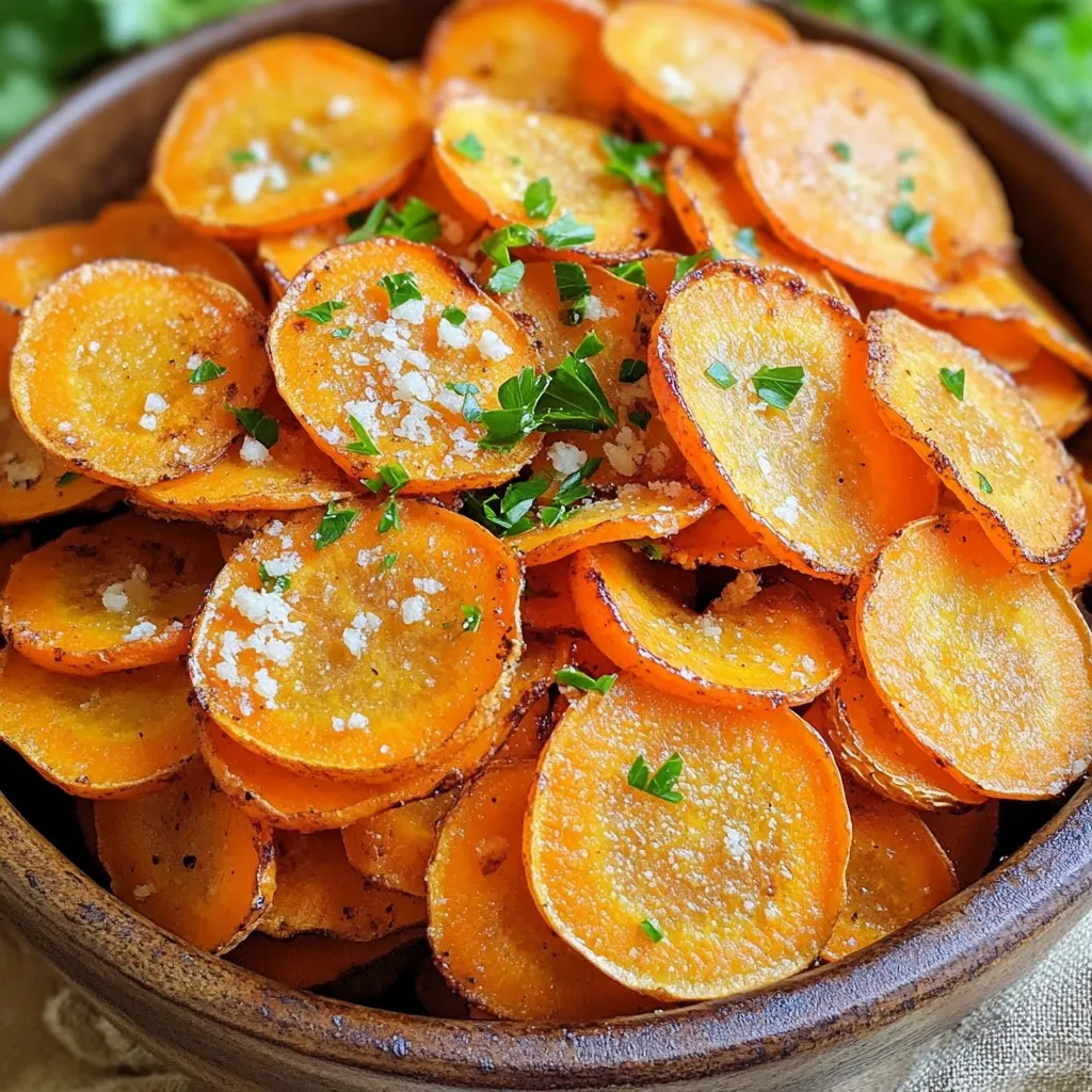 - 4 large carrots, peeled and sliced into thin rounds - 2 tablespoons extra virgin olive oil - 3 cloves garlic, finely minced - 1/4 cup freshly grated Parmesan cheese - 1 teaspoon garlic powder - 1/2 teaspoon smoked paprika - Sea salt and freshly ground black pepper, to taste - Fresh parsley, finely chopped (for garnish) When I make Air Fryer Garlic Parmesan Carrot Chips, I focus on fresh ingredients. Start with four large carrots. Peel them and slice them into thin rounds. Thin slices cook better and get crispier. Next, I use extra virgin olive oil. Two tablespoons coat the carrots well. Olive oil adds flavor and helps the spices stick. Garlic is a key player in this recipe. I use three cloves, finely minced, to get that strong flavor. For an extra garlic kick, I add one teaspoon of garlic powder. Parmesan cheese brings a rich taste. A quarter cup of freshly grated cheese adds the perfect savory touch. Smoked paprika gives a hint of warmth. Just half a teaspoon is enough to elevate the flavor. Don't forget the seasoning! Sea salt and freshly ground black pepper make a big difference. Use them to taste. Finally, I like to add fresh parsley for color and freshness. It makes the dish look more appealing. Gather these ingredients, and you’re ready to make a delicious snack that everyone will love! First, set your air fryer to 375°F (190°C). Let it heat for about 5 minutes. Preheating helps your carrot chips cook evenly. This step is key for that perfect, crispy bite. Grab a large mixing bowl. Add your sliced carrots, olive oil, minced garlic, garlic powder, smoked paprika, sea salt, and black pepper. Mix it well. Make sure every slice is coated in the oil and spices. This seasoning gives the carrots a burst of flavor. Now, it’s time for the cheese! Sprinkle the freshly grated Parmesan over your seasoned carrot slices. Toss the mixture again. You want the cheese to cling to the carrots. This will add a savory taste and help them get crispy. First, layer the carrot slices in the air fryer basket. Make sure they sit in a single layer. This helps them cook evenly and get crispy. If you have too many, cook them in batches. Keeping them apart is key for that perfect crunch. Set your air fryer to 375°F (190°C). Cook the carrot chips for 15 to 18 minutes. It's important to shake the basket halfway through. This action promotes even browning. You will know they are done when they turn golden brown and feel crisp. Once cooked, take the carrot chips out of the air fryer. Let them cool for a minute or two. This short cooling time will make them extra crispy. For added flavor, sprinkle more Parmesan cheese and fresh parsley on top. Enjoy your tasty treat right away! {{image_4}} To get the best results, preheat your air fryer to 375°F (190°C). This step helps your carrot chips cook evenly. Spread the carrot slices in a single layer. Overlapping them can lead to uneven cooking. If you have a lot of carrots, it's better to cook them in batches. For crispy chips, make sure to coat your carrot slices well. Use olive oil and spices to enhance the flavor. The key is to shake the basket halfway through cooking. This action helps the chips brown evenly. Watch closely as they cook; they are ready when golden brown and crispy. Serve your garlic Parmesan carrot chips hot for the best taste. They make a great snack or side dish. You can pair them with dips like hummus or ranch. For a fresh touch, sprinkle extra parsley on top just before serving. Enjoy these delicious chips with friends or family! Want to kick up the heat? Try adding cayenne pepper or crushed red pepper flakes. Start with 1/4 teaspoon and adjust to your taste. This will make your carrot chips sizzle with flavor. The heat pairs well with the garlic and Parmesan, making each bite exciting. You can swap Parmesan for other cheeses. Try using Pecorino Romano for a sharper flavor. Feta cheese adds a tangy twist. For a creamy touch, consider goat cheese. Each cheese gives a new taste, so feel free to experiment. Fresh herbs can elevate your carrot chips. Add thyme or rosemary for a fragrant touch. You can mix dried herbs like oregano or basil into the oil. This adds depth and aroma that enhances the overall flavor. Don't be shy to try your favorite herbs! Carrot chips stay fresh for about 3 to 5 days when stored in an airtight container. Keep them at room temperature for the best crunch. If they get soft, you can re-crisp them in the air fryer for a few minutes. Yes, you can use baby carrots! Just slice them thinly for even cooking. You might need to adjust the cooking time since they are smaller. Keep an eye on them as they cook. These chips pair well with dips like hummus or ranch dressing. You can also serve them alongside sandwiches or as a crunchy side to salads. The flavors of garlic and parmesan make them a great snack on their own, too! This blog post shared a simple recipe for tasty garlic Parmesan carrot chips made in an air fryer. You learned the key ingredients, from fresh carrots to the right seasonings. I outlined steps to help you cook these chips for the best crispiness. In summary, this easy recipe is fun to make and share. Feel free to try the variations for extra flavor. Enjoy your cooking adventure!