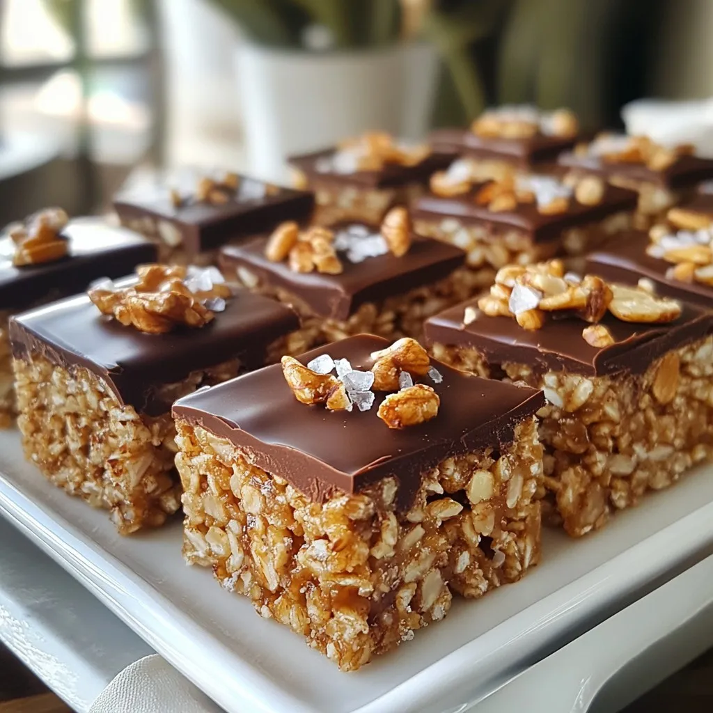 To make the Award Winning Homemade Crunch Bars, gather these simple ingredients. Each one plays a key role in the taste and texture of the bars. - 2 cups crispy rice cereal - 1 cup smooth peanut butter - 1 cup natural honey (or maple syrup for a vegan option) - 1 cup dark chocolate chips - 1/2 cup chopped nuts (like almonds or walnuts) - 1 tsp vanilla extract - A pinch of fine sea salt These ingredients are easy to find. They blend together to create a treat that is both crunchy and sweet. The crispy rice cereal adds a nice crunch, while the peanut butter provides a creamy base. Honey or maple syrup gives a touch of sweetness, and dark chocolate adds richness. Nuts bring extra texture and flavor. Using high-quality chocolate chips makes a big difference. They melt smoothly and taste great. You can also mix in your favorite nuts for a personal touch. Make sure you have everything ready before you start. This way, you can enjoy the process and create your delicious bars with ease. {{ingredient_image_2}} To start, grab an 8x8 inch baking dish. Line it with parchment paper, leaving some overhang on the sides. This overhang helps you lift the bars out later. Using parchment paper is key. It prevents sticking and makes cleanup easy. Next, heat the peanut butter and honey in a medium saucepan. Use low heat so it doesn’t burn. Stir consistently until the mixture is smooth. A well-combined mixture will look glossy and creamy. Once it’s ready, remove it from heat. Add the vanilla extract and a pinch of sea salt for extra flavor. In a large mixing bowl, add the crispy rice cereal and chopped nuts. Pour the warm peanut butter mixture over this. It’s important to mix evenly. Use a spatula or wooden spoon to coat every piece of cereal. This ensures each bite is tasty. Now, transfer the mixture to your prepared baking dish. Use the back of a rubber spatula to press it down firmly. Compacting the mixture helps the bars hold together. Make sure to spread it evenly, so each bar has the same thickness. For the chocolate, use a microwave-safe bowl. Add the dark chocolate chips and heat in 30-second bursts. Stir between each interval. This prevents overheating, which can ruin your chocolate. You want it to be smooth and shiny when done. Once your chocolate is melted, pour it over the pressed rice cereal mixture. Use a spatula to spread it evenly. For an extra touch, you can sprinkle a few flakes of sea salt on top. This adds a nice contrast to the sweet chocolate. To let the bars set, place the baking dish in the refrigerator for at least 1 hour. This helps the chocolate harden and the bars firm up. After chilling, use the parchment overhang to lift the bars out. Cut them into squares or rectangles for serving. Make sure to use a sharp knife for clean cuts. For award-winning crunch bars, the right ratio of ingredients matters. Use 2 cups of crispy rice cereal to 1 cup of peanut butter and honey. This blend gives you a perfect crunch. If you add too much peanut butter, your bars may crumble. To avoid crumbling, press the mixture firmly into your baking dish. Use a spatula to pack it down well. This step helps the bars hold their shape when you cut them. A great way to serve your crunch bars is on a pretty platter. Drizzle melted chocolate on top for added flair. You can also sprinkle some chopped nuts for extra crunch. If you want to package them as gifts, wrap each bar in decorative parchment paper. Tie them with a ribbon for a nice touch. This makes them perfect for birthdays or holidays. One common mistake is overheating the chocolate. Heat it in short bursts and stir often. This way, you get a smooth melt without burning. Another mistake is not pressing the mixture firmly enough. If you don’t press it down, the bars may fall apart. Use the back of a rubber spatula to ensure they are compact and sturdy. Pro Tips Tip 1 - Use Fresh Ingredients: Always use fresh peanut butter and high-quality chocolate chips to enhance the flavor of your crunch bars. Tip 2 - Customize Your Nuts: Experiment with different types of nuts or seeds to find your favorite combination, adding extra crunch and flavor. Tip 3 - Storage Tips: Store your crunch bars in an airtight container in the refrigerator for up to two weeks to keep them fresh. Tip 4 - Perfecting the Chocolate Layer: For a shiny finish, temper the chocolate before pouring it over the bars for a professional look. {{image_4}} To make vegan crunch bars, swap honey for maple syrup. This keeps the bars sweet and plant-based. You can also use almond butter or sunflower seed butter instead of peanut butter. Both give nice flavors. For chocolate, choose dairy-free dark chocolate chips. These changes keep your bars tasty and vegan-friendly. You can add fun flavors to your crunch bars. Try mixing in shredded coconut for a tropical touch. A pinch of cinnamon can also add warmth and spice. For nuts, think about using pecans or hazelnuts. Each nut brings its own unique flavor. You can create a crunch bar that fits your taste perfectly. If you need nut-free bars, simply leave out the nuts. Use pumpkin seeds or sunflower seeds for crunch. For gluten-free options, pick gluten-free crispy rice cereal. You can also use gluten-free oats. These swaps make the bars safe for those with allergies. It’s easy to adapt this recipe for everyone! To keep your crunch bars fresh, store them in an air-tight container. This prevents moisture from making them soft. I recommend using a glass or plastic container with a secure lid. Place a piece of parchment paper between the bars to avoid sticking. For best results, keep the container in the fridge. This will help maintain texture and taste. The cool environment stops the chocolate from melting and keeps the bars firm. You can keep these bars for about two weeks in the fridge. If stored properly, they stay tasty and crunchy. Look out for signs of spoilage. If they smell off or have a change in color, it’s time to toss them. You can freez