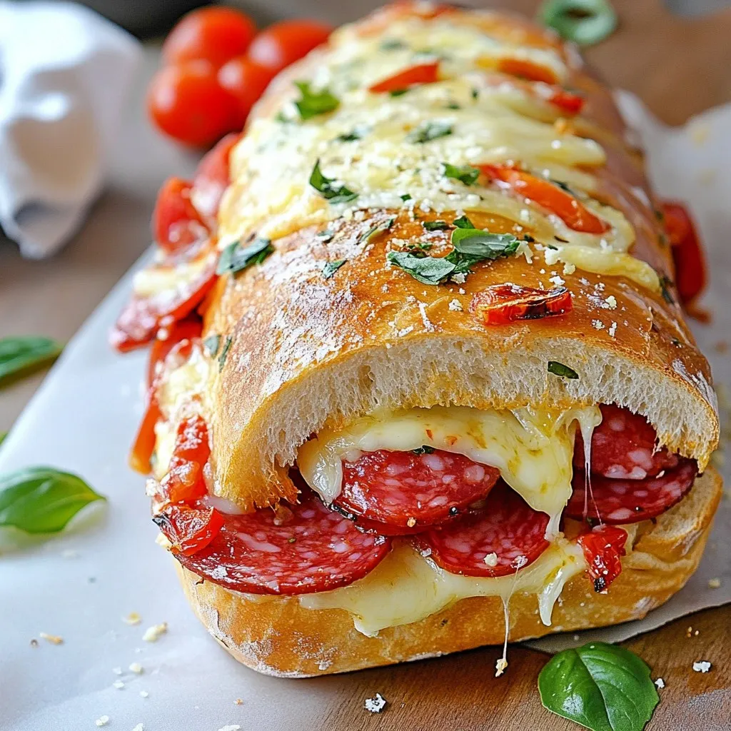 A deliciously layered sandwich featuring Italian meats, provolone cheese, and fresh basil, baked to perfection.