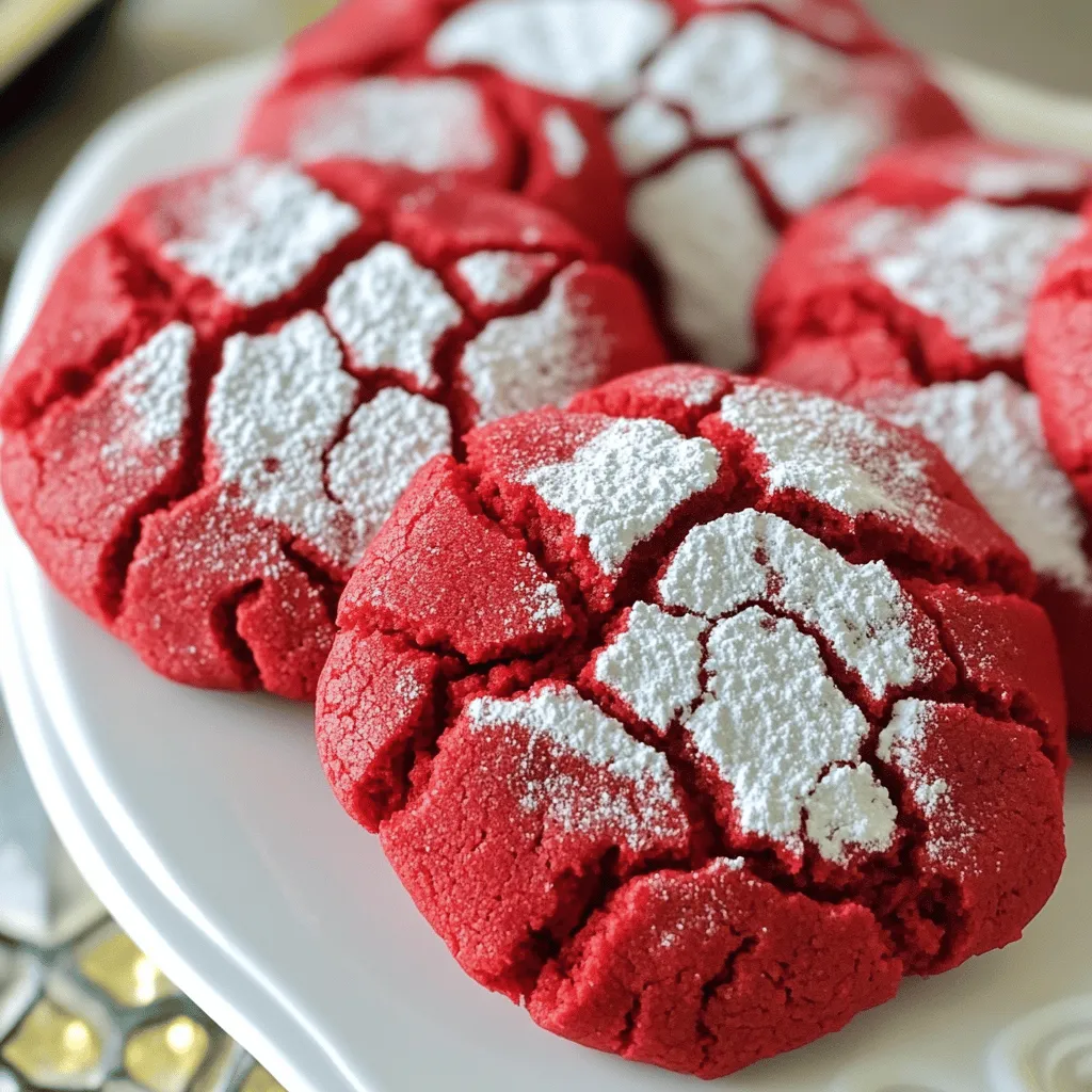 To make the best bakery-style red velvet crinkle cookies, gather these key ingredients: - 1 and 1/2 cups all-purpose flour - 1/2 cup unsweetened cocoa powder - 1 teaspoon baking powder - 1/2 teaspoon baking soda - 1/4 teaspoon salt - 1/2 cup unsalted butter, softened - 1 cup granulated sugar - 1 large egg - 1 tablespoon red gel food coloring - 1 teaspoon vanilla extract - 1/2 cup powdered sugar, for rolling Each ingredient plays a vital role. The flour gives structure to the cookie. Cocoa powder adds rich chocolate flavor. Baking powder and baking soda help the cookies rise. Salt enhances the sweetness. Softened butter creates a creamy texture. Sugar sweetens and helps with the crinkle look. The egg binds the mixture together. Red gel food coloring gives the cookie its signature hue. Vanilla extract adds depth to the flavor. The powdered sugar is key for that beautiful, crinkled finish. It coats the dough balls and creates a lovely contrast against the red. Now that you have your ingredients ready, you're one step closer to making these delightful cookies! To make red velvet crinkle cookies, start by gathering your ingredients. You need flour, cocoa powder, and sugar. Don’t forget the egg and red food coloring too. This recipe takes about an hour from start to finish. First, preheat your oven to 350°F (175°C). This ensures your cookies bake evenly. Line a baking sheet with parchment paper. In a bowl, mix the dry ingredients. Whisk together flour, cocoa powder, baking powder, baking soda, and salt. Set this bowl aside. In a separate bowl, beat the softened butter and granulated sugar. Use a mixer on medium speed until it’s fluffy. This takes about 2-3 minutes. Next, add the egg, red food coloring, and vanilla extract. Mix until everything is smooth. Then, slowly add the dry mix to the wet mix. Stir gently until blended. The dough should feel thick and sticky. Now, wrap the dough in plastic wrap. Chill it in the fridge for about 30 minutes. This step helps the cookies keep their shape when baking. After chilling, scoop out tablespoon-sized portions of dough. Roll each piece into a ball in your hands. Next, roll the dough balls in powdered sugar. Make sure they are fully coated. This sugar gives the cookies their signature crinkle look. Finally, place the dough balls on the baking sheet. Space them about 2 inches apart to allow them to spread. Now your dough is ready for the oven! To get those beautiful crinkles, coat your dough balls in powdered sugar. Make sure each ball is fully covered. This sugar will create a lovely contrast with the red color. Bake them at 350°F for 10-12 minutes. Watch for the tops to crack and look soft. This tells you they are done! Store your cookies in an airtight container. This keeps them soft and fresh. Place parchment paper between layers to prevent sticking. If you need to keep them longer, freeze them. Just make sure they are in a safe, sealed bag. One common mistake is overmixing the dough. This can lead to tough cookies. Mix just until the dry and wet ingredients combine. Another error is skipping the chilling step. Chilling helps the cookies hold their shape. Make sure to chill the dough for at least 30 minutes. {{image_4}} You can change the red velvet flavor to chocolate or vanilla. For chocolate, use more cocoa powder. Replace some flour with cocoa powder to keep the texture right. For vanilla, skip the cocoa and add more vanilla extract. You can also add a bit of almond extract for a twist. Each flavor keeps the soft texture and crinkle look, but offers a new taste. Add-ins can make these cookies even better. You can toss in chocolate chips for extra sweetness. Dark chocolate pairs well with the red velvet flavor. Nuts like walnuts or pecans add a nice crunch. You can also use white chocolate chips for a fun contrast. Just mix them in when you're adding the dry ingredients. You can make these cookies festive for the holidays. For Valentine’s Day, shape the dough into hearts. Use pink or white food coloring for a sweet touch. During Christmas, add peppermint extract or crushed candy canes. For Halloween, use orange food coloring and add some spooky sprinkles. These fun ideas make your cookies special for any occasion. To keep your cookies fresh, store them in an airtight container. This helps keep moisture in and air out. Place parchment paper between layers to prevent sticking. If you use a cookie jar, make sure it has a tight seal. Keep them at room temperature, away from heat and light. They’ll stay fresh for about a week. Freezing cookies is easy! To freeze your red velvet crinkle cookies, let them cool completely first. Then, arrange them in a single layer on a baking sheet. Freeze for about an hour until firm. Once firm, place them in a freezer bag. Remove as much air as possible before sealing. They can last up to three months in the freezer. To enjoy your frozen cookies, let them thaw at room temperature for about 30 minutes. If you prefer them warm, preheat your oven to 350°F (175°C). Place the cookies on a baking sheet and heat for 5-7 minutes. This will give you that fresh-baked taste again! Enjoy them with milk or your favorite drink. You will know the cookies are done when the edges are firm. They should look slightly soft in the middle. The tops will have that beautiful crinkle effect. If you touch the edges, they should feel set. Bake for about 10 to 12 minutes at 350°F. Yes, you can use liquid food coloring, but gel is better. Gel gives a richer color. It also requires less liquid, so your dough stays thick. If you use liquid, add a little more flour to keep the right texture. These cookies pair great with a glass of milk or hot chocolate. You can also serve them on a bright platter. A light dusting of powdered sugar adds a nice touch. They look festive and inviting! Absolutely! You can make the dough in advance. After mixing, wrap it in plastic. Chill it in the fridge for up to 3 days. When you’re ready, just scoop, r