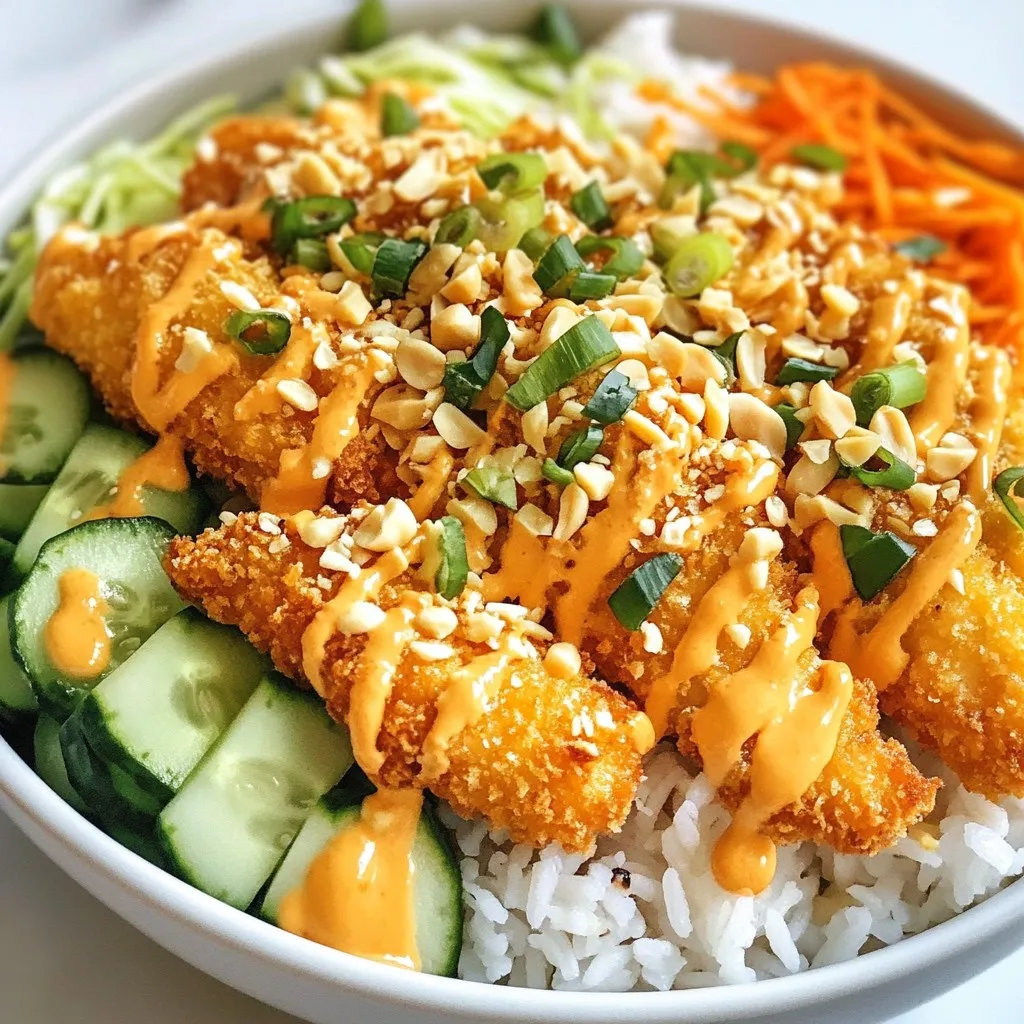 A vibrant bowl featuring crispy chicken, fresh vegetables, and a spicy Bang Bang sauce.