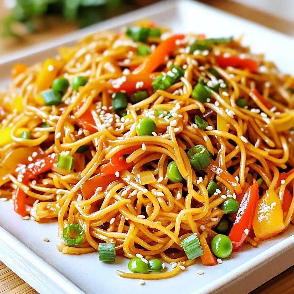 To make a great chow mein, you need a few key items. These ingredients create the classic taste that beats takeout. - 8 ounces chow mein noodles - 2 tablespoons sesame oil - 1 cup shredded carrots - 1 cup bell pepper, sliced (any color) - 1 cup snap peas - 1 small onion, thinly sliced - 3 cloves garlic, minced - 1 tablespoon fresh ginger, grated - ¼ cup soy sauce - 2 tablespoons oyster sauce (or vegetarian alternative) - 1 tablespoon hoisin sauce - 1 teaspoon sugar - ½ teaspoon black pepper Chow mein noodles are the base. They soak up all the flavors. Fresh vegetables add color and crunch. The sauces give it a rich taste. Garnishes can take your chow mein to the next level. They add flavor and style to your dish. - Green onions, sliced - Sesame seeds - Fresh herbs Green onions add a fresh bite. Sesame seeds give a nice crunch. Fresh herbs brighten the dish. Use these garnishes to impress your guests. {{ingredient_image_2}} Start by boiling a large pot of salted water. Once the water bubbles, add 8 ounces of chow mein noodles. Cook them for about 4-5 minutes. You want them tender but firm to the bite. After cooking, drain the noodles. Rinse them under cold water. This step helps prevent stickiness. Set them aside for later. Next, heat 2 tablespoons of sesame oil in a large wok over medium-high heat. When the oil shimmers, add your thinly sliced onion, 1 cup of shredded carrots, and 1 cup of sliced bell pepper. Sauté these veggies for 3-4 minutes. They should soften and turn bright in color. Now, add 1 cup of snap peas, 3 cloves of minced garlic, and 1 tablespoon of grated ginger. Stir-fry for 1-2 minutes. The garlic should smell great, and the veggies need to stay crisp-tender. Gently toss the cooked chow mein noodles into the vegetable mix in the wok. Make sure everything is evenly distributed. In a small bowl, mix together ¼ cup of soy sauce, 2 tablespoons of oyster sauce (or a vegetarian option), 1 tablespoon of hoisin sauce, 1 teaspoon of sugar, and ½ teaspoon of black pepper. Pour this sauce over the noodles and vegetables. Use tongs or spatulas to toss everything together. Cook for another 2-3 minutes. This step helps the flavors meld and gives the noodles a slight crispiness. To make your chow mein taste like it came from a restaurant, focus on sauces and oils. Use high-quality sesame oil for a nutty flavor. For sauces, combine soy sauce, oyster sauce, and hoisin sauce. These add depth and richness. Balancing flavors is key. Add sugar to enhance sweetness and black pepper for heat. A touch of fresh ginger brings warmth. Adjust these to your taste for the best result. Stir-frying is the heart of chow mein. Start with a hot wok or pan. High heat cooks food quickly and keeps it crisp. Add your oil and let it shimmer before cooking. When stir-frying, keep the food moving. This prevents burning and helps it cook evenly. Cook in small batches if needed. This way, you keep the heat up and your veggies stay bright and crunchy. Pro Tips Use Fresh Ingredients: For the best flavor and texture, opt for fresh vegetables and high-quality sauces. This ensures your chow mein tastes vibrant and delicious. Don’t Overcook the Noodles: Follow the package instructions carefully and avoid overcooking the chow mein noodles. They should be tender but still have a slight bite to them. Customize Your Veggies: Feel free to experiment with different vegetables based on your preference or what you have on hand. Broccoli, bok choy, or mushrooms work great in chow mein. Adjust the Sauce to Taste: Taste the sauce mixture before adding it to the wok. Adjust the soy sauce or hoisin sauce to your liking for a more personalized flavor profile. {{image_4}} You can add different proteins to your chow mein. Chicken, beef, or tofu all work well. - For chicken, cut it into thin strips. Cook it for about 5-7 minutes before adding the veggies. - For beef, use flank steak or sirloin. Cook it quickly for 3-5 minutes until just browned. - For tofu, press it to remove water. Cut it into cubes and stir-fry for about 4-5 minutes until golden. These choices let you customize the dish. Choose what you like best! Feel free to mix in seasonal veggies. You can tailor the dish to what you enjoy. - Broccoli adds a nice crunch. Just steam it lightly before adding. - Mushrooms bring a rich flavor. Sauté them with the onions. - Zucchini can add a fresh taste. Slice it thin and toss it in. This way, you can make chow mein your own. Adjust the recipe based on what’s in season or what you have at home. Enjoy being creative! To keep your Better-Than-Takeout Chow Mein fresh, follow these steps: - Refrigeration tips for leftovers: - Let the chow mein cool to room temperature. - Store it in an airtight container. - It can last in the fridge for up to 3 days. - Freezing for long-term storage: - Freeze chow mein in a freezer-safe container. - It keeps well for up to 2 months. - Make sure to label the container with the date. To enjoy your chow mein later, reheating is key: - Best practices to maintain texture: - Add a splash of water to the chow mein before reheating. - This helps steam it and keeps it moist. - Recommended methods for reheating: - Use a skillet over medium heat. - Stir frequently until heated through. - You can also microwave it in short bursts, stirring in between. This way, your chow mein stays tasty and enjoyable! Yes, you can easily make chow mein gluten-free. For noodles, look for rice noodles or gluten-free chow mein noodles. They cook well and taste great. For sauces, use tamari instead of soy sauce. Tamari is a gluten-free alternative. Always check labels to ensure no gluten is hidden in other sauces. To make chow mein vegetarian, switch to vegetarian sauces. Use soy sauce, hoisin sauce, and a vegetarian oyster sauce. You can find these at many grocery stores. Add more veggies too! Consider using mushrooms, broccoli, or zucchini for extra flavor and nutrients. This will keep your dish hearty and satisfying. Homema