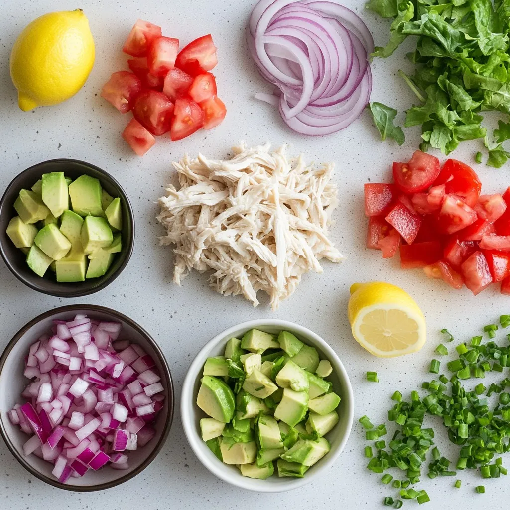 To make a great BLT Chicken Salad, gather these fresh ingredients: - 2 cups cooked chicken, shredded - 4 slices of crispy turkey bacon, crumbled - 1 large ripe tomato, diced - 1 creamy avocado, diced - 1 cup crunchy romaine lettuce, chopped - 1/4 cup red onion, finely diced - 1/2 cup ranch dressing - 1 tablespoon freshly squeezed lemon juice - Salt and freshly cracked black pepper to taste - Fresh chives, finely chopped (for garnish) Each ingredient brings its own special taste. The cooked chicken offers protein and heartiness. Turkey bacon gives a crispy, smoky note. Tomatoes add a juicy burst, while avocado lends creaminess. Romaine lettuce provides crunch, and red onion gives a slight bite. The ranch dressing, mixed with lemon juice, ties all the flavors together. Use fresh ingredients for the best taste. A ripe avocado and a firm tomato make a big difference. If you want to make it lighter, you can swap the ranch dressing for a yogurt-based option. This salad is not only tasty but also colorful and fun to eat! {{ingredient_image_2}} - In a large mixing bowl, combine the shredded chicken, crumbled turkey bacon, diced tomato, creamy diced avocado, crunchy chopped romaine lettuce, and finely diced red onion. Mix gently to combine all the ingredients evenly. This step is key. You want to make sure every bite is full of flavor. - In a separate small bowl, whisk together the ranch dressing and freshly squeezed lemon juice until the mixture is smooth and well blended. This adds a zesty brightness to the dressing. Bright flavors make the salad exciting. The lemon juice wakes up the ranch. - Pour the ranch dressing mixture over the chicken and vegetable combination in the large bowl. Gently toss everything together until each ingredient is evenly coated with the creamy dressing. Coating everything well ensures that you get that rich flavor in every bite. - Season the salad with salt and freshly cracked black pepper to taste. Taste and adjust the seasoning as needed to enhance the flavors. This is where you can make it your own. Adjust the salt and pepper to match your taste. - Serve the salad immediately, garnished with a sprinkle of finely chopped fresh chives for a burst of color and flavor. For a chilled option, cover the bowl and place it in the refrigerator for about 30 minutes before serving. This allows the flavors to meld beautifully. Serving it fresh keeps the salad crisp. If you chill it, the taste will deepen and blend nicely. - Choosing the right chicken: Use cooked chicken that is juicy and tender. You can use rotisserie chicken for convenience. Shred it into bite-sized pieces for easy eating. - Cooking bacon to crispy perfection: Cook turkey bacon until it is crispy and golden. You can bake it in the oven or pan-fry it. This adds a nice crunch to your salad. - Mixing fresh ingredients: Always use fresh produce. Ripe tomatoes and creamy avocados make a big difference. Chop them just before mixing to keep them fresh and vibrant. - Alternative dressings to try: While ranch is tasty, you can explore other dressings. Try a tangy vinaigrette or a creamy avocado dressing for a twist. - Homemade dressing options: Making your own dressing is easy. Combine olive oil, vinegar, and herbs for a fresh taste. A splash of lemon juice brightens up any dressing. - Presentation tips for serving: Serve the salad in individual bowls. This adds an elegant touch. Top each bowl with a slice of fresh avocado or a lemon wedge for color. - Pairing ideas for a complete meal: Pair your salad with crusty bread or a light soup. This makes a satisfying meal. You can also serve it with chips for extra crunch. Pro Tips Use Fresh Ingredients: Opt for the freshest chicken, ripe tomatoes, and perfectly ripe avocados to enhance the overall flavor of your salad. Crisp Bacon for Extra Crunch: Ensure your turkey bacon is crispy before adding it to the salad; this adds a delightful crunch that complements the other textures. Chill for Flavor: Allow the salad to chill in the refrigerator for at least 30 minutes before serving to let the flavors meld beautifully. Customize Your Dressing: Feel free to experiment with different dressings like blue cheese or a light vinaigrette to give your salad a unique twist. {{image_4}} If you want to change things up, there are great options. You can switch the chicken for grilled tofu or chickpeas. Both add protein but keep it plant-based. For bacon, try crispy tempeh or smoked paprika. They give a nice flavor without meat. You can also add or swap veggies to your taste. Consider adding diced cucumber for crunch. You can also use bell peppers for a sweet twist. Fresh herbs like cilantro or basil can brighten the salad. If you're looking for low-carb or keto options, you can skip the ranch dressing. Instead, use a creamy avocado dressing or oil and vinegar. They keep it light and tasty. You can also replace romaine lettuce with spinach or kale for more nutrients. For a dairy-free option, look for vegan ranch dressings. They taste good and fit various diets. You can also mash avocados to create a creamy base. This gives you flavor without dairy. When you need to serve more, it's easy to adjust this recipe. Just double or triple the ingredients. Use 4 cups of chicken and 8 slices of bacon for a big crowd. Keep the other amounts the same for balance. If you want to modify ingredients, think about flavors. If you add more chicken, you might need extra dressing. Always taste and adjust to find the right mix. This way, everyone enjoys your BLT Chicken Salad! After making your BLT Chicken Salad, you can store leftovers easily. - Storing in the refrigerator: Place the salad in an airtight container. It will keep well for up to three days in the fridge. Just make sure to seal it tightly to keep it fresh. If you want to serve it again, give it a quick mix before enjoying. - Freezing options for chicken salad: Freezing is not the best choice for this salad because of the avocado and dressing. If y