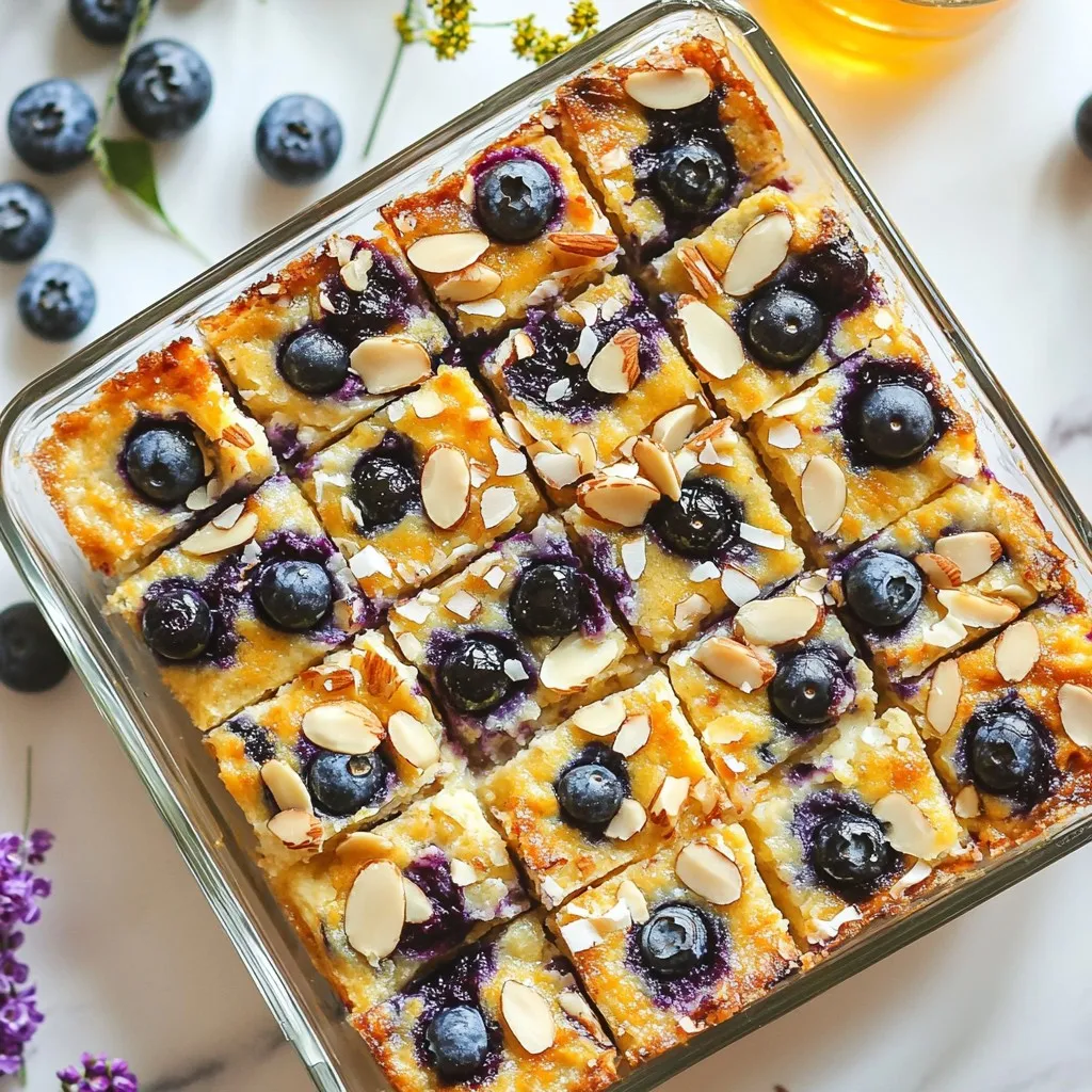 Serve your breakfast bake warm for the best experience. It tastes great fresh from the oven. Top it with sliced almonds, shredded coconut, or some extra blueberries. You can also drizzle a bit of honey on top for a special touch.