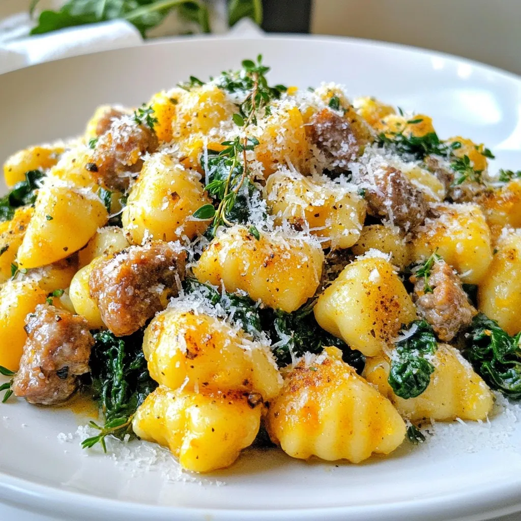 – Mixing Gnocchi with Sausage: Add the cooked gnocchi to the pan with sausage. Stir in 1 cup of chopped fresh spinach, 1 teaspoon of fresh thyme, and ½ teaspoon of nutmeg.