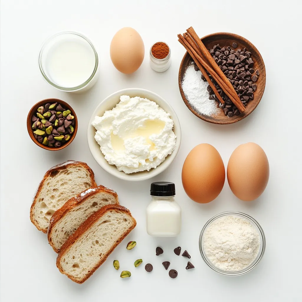 For extra flavor, ground cinnamon adds warmth. Eggs and milk help bind everything together. The unsalted butter is key for cooking. It makes the toast golden and adds a rich taste. Mini chocolate chips give a fun surprise in each bite. Lastly, chopped pistachios add a nice crunch on top.