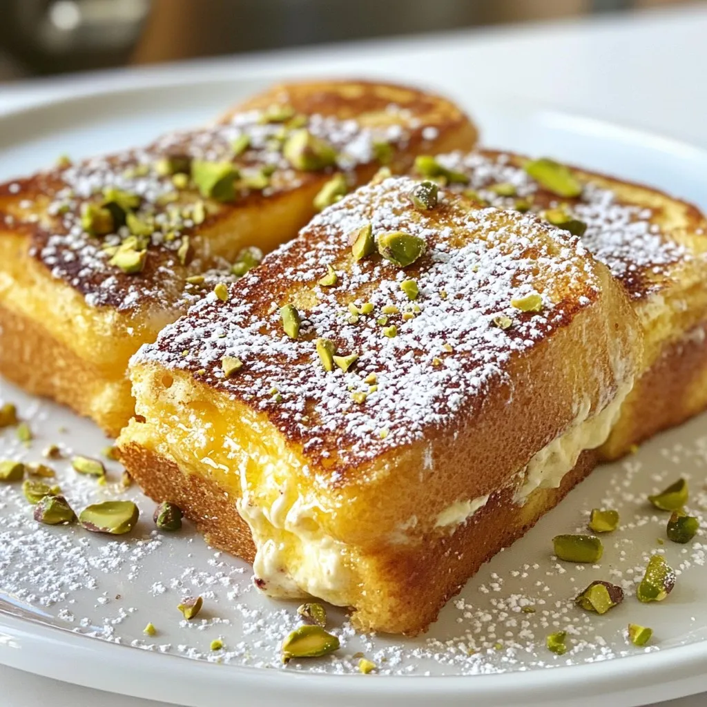 A delicious twist on traditional French toast, filled with a creamy cannoli mixture and topped with powdered sugar and pistachios.