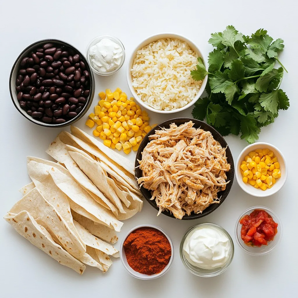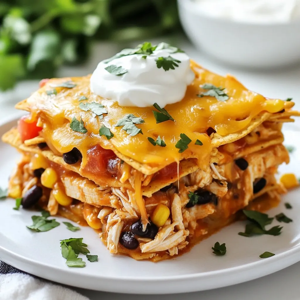 - 2 cups cooked chicken, shredded - 1 can (15 oz) black beans, rinsed and drained - 1 cup corn kernels (can be fresh, frozen, or canned) - 1 cup cooked rice (white or brown) - 1 can (10 oz) diced tomatoes with green chilies - 2 cups shredded Mexican cheese blend - 1 teaspoon ground cumin - 1 teaspoon chili powder - Salt and pepper to taste - 4 large flour tortillas, cut into strips - 1/2 cup sour cream (for serving) - Fresh cilantro, chopped (for garnish) When making Cheesy Chicken Burrito Casserole, gather your ingredients first. This helps streamline the cooking process. Start with cooked chicken, which adds protein and flavor. You can use rotisserie chicken for ease. Next, grab a can of black beans. Rinsing them helps remove excess sodium. Corn kernels add sweetness and texture. Use fresh, frozen, or canned, depending on what you have. Next, you need cooked rice. White or brown rice works well, so choose what you prefer. Diced tomatoes with green chilies bring moisture and spice. Look for a can that has no added sugar or preservatives. You’ll also need a Mexican cheese blend. This adds creaminess and a melty top layer. Don’t forget the spices: ground cumin and chili powder. They give the dish warmth and aroma. Season to your taste with salt and pepper. For the base, cut flour tortillas into strips. They create layers and hold the filling. Finally, have sour cream ready for serving. It balances the flavors. Chopped fresh cilantro adds freshness and a nice pop of color as a garnish. With these ingredients, you’re set to create a filling and tasty casserole that everyone will love! {{ingredient_image_2}} - Preheat the oven to 350°F (175°C). - In a large bowl, mix the cooked chicken, black beans, corn, cooked rice, and diced tomatoes. - Add ground cumin, chili powder, salt, and pepper. Stir well to combine. - Lightly grease a 9x13 inch casserole dish. - Place half of the tortilla strips at the bottom of the dish. - Spoon half of the chicken mixture over the tortillas. Spread it evenly. - Add another layer with the rest of the tortilla strips. - Top with the second half of the chicken mixture, filling any gaps. - Finish with the remaining tortilla strips and sprinkle the rest of the cheese on top. - Cover the dish with aluminum foil and bake for 25 minutes. - After 25 minutes, remove the foil. Bake for an extra 15 minutes. - This step helps the cheese become bubbly and golden. - Let the casserole cool for a few minutes before slicing. - Garnish with fresh cilantro before serving. Enjoy with sour cream for extra flavor! To make your Cheesy Chicken Burrito Casserole perfect, focus on even seasoning. Mix your spices well into the filling. Taste it before layering. This way, every bite bursts with flavor. After baking, let the casserole cool for a few minutes. This helps it set. It also makes for clean slices when you cut it. No one wants a messy plate! Garnish your casserole with fresh cilantro for a pop of color. It adds a nice touch and freshness. A dollop of sour cream on top brings creamy goodness. Guests can add it to their liking. For a great presentation, serve the casserole on a colorful platter. Use whole cilantro leaves for extra flair. Place sour cream on the side for guests, so they can add it as they wish. A beautiful dish makes for a more enjoyable meal! Pro Tips Use Rotisserie Chicken: For a quicker prep time, consider using store-bought rotisserie chicken. It adds great flavor and saves you from cooking your chicken from scratch. Customize Your Beans: Feel free to swap black beans for pinto or kidney beans based on your preference. Each type of bean brings its own unique flavor and texture to the dish. Layering is Key: Ensure even distribution of flavors by layering the ingredients properly. This allows each bite to be packed with deliciousness, avoiding a dry or bland layer. Spice it Up: Adjust the spice level by adding jalapeños or hot sauce to the chicken mixture. This allows you to cater the dish to your heat tolerance. {{image_4}} You can easily change this dish to fit your needs. For a gluten-free option, use gluten-free tortillas. They hold up well and taste great. You can also make this casserole vegetarian. Simply swap the chicken for a mix of black beans and veggies like bell peppers or zucchini. This keeps the flavor while making it meat-free. Let’s talk about flavors! You can mix up the cheese. Instead of just Mexican cheese blend, try using pepper jack for some heat. You can also add different spices. A pinch of smoked paprika can add a nice twist. Or, try some cayenne pepper if you like it spicy. Get creative and make this dish your own! To keep your cheesy chicken burrito casserole fresh, follow these steps: - Refrigeration: Allow the casserole to cool down for about 30 minutes. Cover it tightly with plastic wrap or foil. It will stay good in the fridge for up to 3 days. - Freezing: For long-term storage, cut the casserole into portions. Wrap each piece in plastic wrap and then in foil. Place them in a freezer bag. This way, it can last for up to 3 months. To enjoy your leftovers, reheating is key. Here’s how to do it: - Best methods: The oven is the best choice for reheating. Preheat it to 350°F (175°C). Place the casserole in an oven-safe dish, cover it with foil, and heat for about 20 minutes. This keeps the texture nice and prevents it from drying out. - Time-saving tips: If you're short on time, the microwave works too. Heat a single portion on high for 1 to 2 minutes. Check if it’s hot all the way through. If not, heat in 30-second bursts until warm. Can I prepare this casserole ahead of time? Yes, you can prepare this casserole ahead. Just make it up to the baking step and cover it. Store it in the fridge for up to 24 hours. When you're ready, bake it straight from the fridge. You may need to add a few extra minutes to the baking time. What are the best sides to serve with it? Serve this casserole with a fresh salad or some tortilla chips