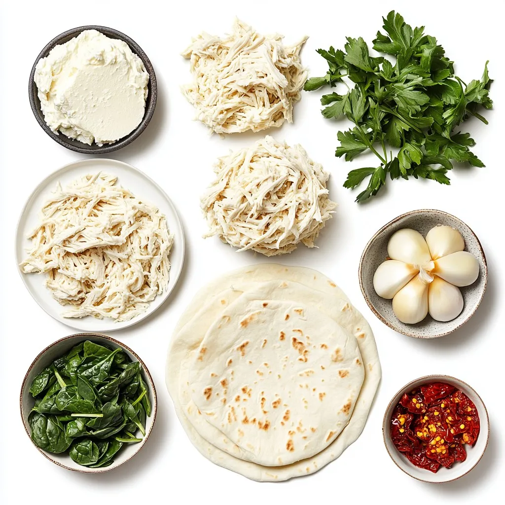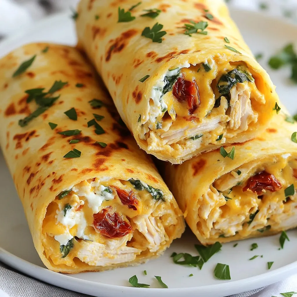 - 2 cups cooked chicken, shredded - 1 cup shredded mozzarella cheese - 1/2 cup cream cheese, softened - 4 large flour tortillas - 3 cloves garlic, minced - 1/2 cup fresh spinach, chopped - 1/4 cup sun-dried tomatoes, diced - 1/4 teaspoon red pepper flakes (optional) - Salt and pepper to taste - 2 tablespoons olive oil - Fresh parsley for garnish Gather these ingredients before you start. Having everything ready makes cooking easy and fun. The cooked chicken should be shredded well to mix nicely with the cheese. I love using mozzarella for its meltiness. Cream cheese adds a rich and creamy feel. Using fresh spinach not only adds color but also boosts nutrition. Sun-dried tomatoes bring a tangy flavor that pairs well with garlic. If you enjoy a bit of heat, add red pepper flakes. Don’t forget to season with salt and pepper to make the flavors pop. Olive oil helps achieve that perfect golden crust on the wraps. Finally, fresh parsley adds a nice touch when you serve. These simple ingredients come together to create a flavorful meal that's sure to impress! {{ingredient_image_2}} 1. First, grab a large mixing bowl. Combine 2 cups of cooked chicken with 1 cup of shredded mozzarella cheese. 2. Add in 1/2 cup of softened cream cheese, 3 cloves of minced garlic, 1/2 cup of chopped spinach, and 1/4 cup of diced sun-dried tomatoes. 3. Sprinkle in salt, pepper, and 1/4 teaspoon of red pepper flakes if you want some heat. 4. Mix everything well until the filling is creamy and evenly blended. 1. Heat a large skillet over medium heat. Add 2 tablespoons of olive oil and swirl it around to coat the pan. 2. Once the oil is shimmering, place a flour tortilla in the skillet. 3. Spoon a generous portion of the chicken mixture into the center of the tortilla. Don’t overfill it! 4. Fold the sides in and tightly roll the tortilla from the bottom up to make a secure wrap. 5. Cook the wrap for 2-3 minutes on each side until golden brown and crispy. Make sure the filling is heated through. 6. Repeat with the remaining tortillas and filling, adding more oil to the skillet as needed. 1. After cooking, let the wraps cool for about a minute on a cutting board. 2. Carefully slice each wrap in half diagonally for a nice look. 3. Garnish with freshly chopped parsley to add color and freshness. 4. Serve the wraps warm for the best taste and texture! Arrange them on a rustic wooden board or on individual plates. For extra flavor, serve with a dipping sauce like creamy ranch or zesty garlic aioli. A small side salad adds a colorful touch too! - Monitoring cooking time: Cook the wraps for 2-3 minutes on each side. This helps the tortillas get crispy and the filling warm. - Tips for crispy tortillas: Use medium heat and add oil to the skillet. This creates a nice crunch on the outside. - Customizing the filling flavors: Add your favorite spices or herbs. You can try cumin or cilantro for a fresh twist. - Overfilling the wrap: Less is more! If you add too much filling, the wrap may burst open while cooking. - Not heating through the filling: Ensure the chicken and cheese melt well. This gives the wrap its creamy texture. - Cooking at too high a temperature: High heat can burn the tortilla before the inside is warm. Keep it steady and moderate. - Ideal accompaniments: Serve with a side salad for freshness. A simple mix of greens works well. - Best dipping sauces: Try creamy ranch or zesty garlic aioli. These add extra flavor to each bite. - Side salad ideas: A bright tomato and cucumber salad pairs nicely. The crunch and coolness complement the warm wraps. Pro Tips Use Rotisserie Chicken: For a quick and easy option, consider using store-bought rotisserie chicken to save time on cooking and shredding. Customize Your Fillings: Feel free to add other vegetables like bell peppers or mushrooms, or substitute different cheeses based on your preferences. Check Your Tortilla Size: Ensure you are using large tortillas to accommodate a generous filling without tearing when rolling. Serve with Dipping Sauces: Elevate the dish by pairing the wraps with a variety of dipping sauces such as salsa, ranch, or a spicy aioli for enhanced flavor. {{image_4}} You can switch up the proteins in these wraps. Try using turkey or beef instead of chicken. This change can add a new taste. For those who want dairy-free options, vegan cheese works great. You can also use dairy-free cream cheese for a creamy texture. Adding different vegetables can boost the flavor. Consider bell peppers, zucchini, or mushrooms. These will add crunch and color to your wraps. Don’t forget to spice things up! You can add herbs like oregano or basil for extra flavor. If you want spicier wraps, toss in more red pepper flakes or add jalapeños. Experimenting with different cheeses can make your wraps unique. Try sharp cheddar or pepper jack for a fun twist. If you need gluten-free options, look for gluten-free tortillas. Many brands offer tasty alternatives that work well. For those on a low-carb diet, you can use lettuce wraps instead of tortillas. This keeps the flavor without the carbs. Vegetarian adaptations are also easy. Just replace the chicken with more veggies or beans. This keeps the dish filling and tasty without meat. To store your cheesy garlic chicken wraps, first let them cool. Place the wraps in an airtight container. This helps keep them fresh. You can store them in the fridge for up to three days. If you want to enjoy them later, you can also freeze them. The best way to reheat wraps is in a skillet. Heat the skillet over medium heat. Place the wraps in the skillet. Cook for about two to three minutes on each side. This method keeps the wraps crispy. You can also use a microwave, but it may make them soft. If you want to freeze the wraps, do it right after making them. Wrap each one in plastic wrap, then place them in a freezer bag. This keeps them fresh for up to three months. When you’re ready to eat, thaw them overnight in the fridge. Reheat them in 