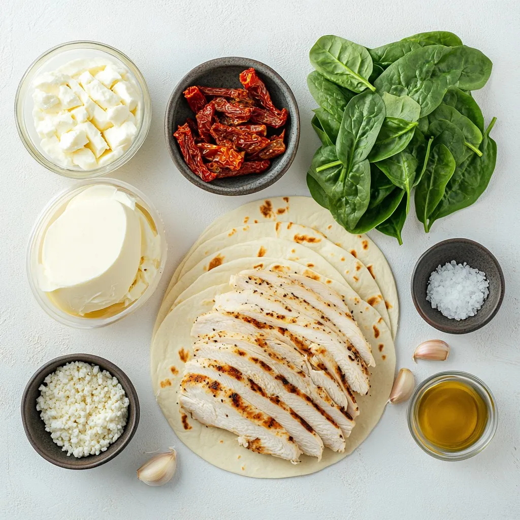 Flour tortillas are soft, making them easy to roll. Fresh spinach adds color and nutrients. Sun-dried tomatoes give a sweet and tangy punch. Together, these ingredients create a balance of flavors and textures in each wrap.