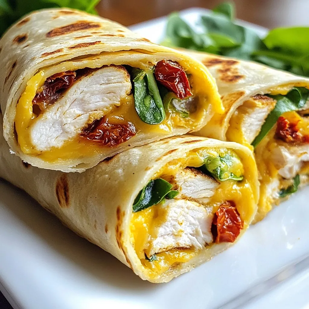 - 2 grilled chicken breasts, thinly sliced - 1 cup shredded mozzarella cheese - 1/2 cup cream cheese, softened to room temperature - 2 tablespoons garlic, finely minced - 1 teaspoon Italian seasoning The main ingredients create a rich and tasty base for your wraps. Grilled chicken adds protein and texture. Mozzarella and cream cheese give a creamy and cheesy taste. Garlic adds a strong flavor that pairs well with chicken. Italian seasoning brings warmth with herbs that make each bite special. - 4 large flour tortillas (10-inch size) - 1 cup fresh spinach leaves, washed and dried - 1/4 cup sun-dried tomatoes, chopped into small pieces Flour tortillas are soft, making them easy to roll. Fresh spinach adds color and nutrients. Sun-dried tomatoes give a sweet and tangy punch. Together, these ingredients create a balance of flavors and textures in each wrap. - Olive oil, for grilling - Salt and freshly cracked black pepper, to taste Olive oil helps the wraps get a nice golden brown color. Salt and pepper enhance all the flavors. These simple ingredients bring everything together, making your meal even more delightful. {{ingredient_image_2}} To start, grab a mixing bowl. Add the softened cream cheese, minced garlic, Italian seasoning, and a pinch of salt and pepper. You want to mix it all together well. Use a fork or a spatula. Keep stirring until the mix is smooth. This step is key for a creamy filling. Now, take a large flour tortilla. Spread a generous layer of the cream cheese mixture on it. Make sure to cover the whole surface. Next, layer on the thin slices of grilled chicken. Add the shredded mozzarella cheese next. Then, sprinkle the fresh spinach leaves and sun-dried tomatoes on top. Distribute each ingredient evenly. This way, every bite has great taste. Preheat your skillet on medium heat. Drizzle in some olive oil and let it warm up. Once hot, place each wrap seam-side down on the skillet. Cook them for about 3-4 minutes. You want the bottoms to turn a golden brown and crispy. Flip the wraps and cook for another 3-4 minutes. Check that the other side is also crisp and that the cheese has melted inside. After cooking, transfer the wraps to a cutting board. Let them cool for a moment, then slice each wrap diagonally. This will make them look great! To roll the tortillas tightly, start by adding the filling in the center. This way, you can fold the sides in first. Then, begin to roll from the bottom up. Pull the tortilla snugly around the filling as you go. This helps keep everything inside. If you find your wraps are tearing, try warming the tortillas slightly. Warm tortillas are easier to work with. To ensure the filling stays intact, don't overstuff your wraps. A little filling goes a long way. Make sure to spread the cream cheese mixture evenly. This helps the filling stick and keeps it from spilling out. For grilling, I recommend using olive oil. It adds flavor and helps the wraps brown nicely. Make sure to coat the skillet lightly. Too much oil can lead to sogginess. To avoid sogginess, let the cooked wraps rest for a minute before slicing. This helps the steam escape. If you notice your wraps are getting too soft, check the heat. Medium heat works best for crisping without burning. These wraps pair well with a variety of sides. Try serving them with a bowl of marinara sauce for dipping. Garlic dipping sauce also works great. For garnishing, fresh basil leaves add a nice touch. A sprinkle of parsley can brighten up the plate too. You can also serve the wraps on a colorful platter to make them look even more inviting. Pro Tips Chill the Wraps: For an extra crispy texture, refrigerate the assembled wraps for about 15 minutes before grilling. This helps them hold their shape better while cooking. Experiment with Cheeses: Feel free to mix different cheeses such as cheddar or pepper jack for added flavor. Each cheese brings a unique taste to the wraps. Use Fresh Ingredients: Fresh spinach and high-quality sun-dried tomatoes can significantly enhance the flavor profile of your wraps, making them more vibrant and delicious. Perfect Grilling Temperature: Ensure your skillet is at medium heat to avoid burning the wraps while ensuring that the cheese melts perfectly. {{image_4}} You can switch up the protein in these wraps. Instead of chicken, try: - Grilled shrimp - Tofu for a vegetarian option - Sliced turkey for a lighter choice For dairy-free options, consider using: - Vegan cream cheese - Nutritional yeast for a cheesy flavor - Plant-based cheese shreds To make your wraps even tastier, add some spices or sauces. Here are a few ideas: - Red pepper flakes for heat - A drizzle of balsamic glaze for sweetness - Your favorite hot sauce for a kick Adding extra vegetables can boost flavor and nutrition. Think about: - Bell peppers for crunch - Avocado for creaminess - Zucchini for a fresh taste Switching tortilla types can change the meal's vibe. You might try: - Whole wheat tortillas for more fiber - Low-carb options like lettuce wraps for a lighter meal Experiment with these variations to find your perfect Cheesy Garlic Chicken Wrap! To keep your Cheesy Garlic Chicken Wraps fresh, store them in the fridge. Place the wraps in an airtight container. This helps prevent them from drying out. You can also wrap them tightly in plastic wrap. This method works well, too. If you want to save them for later, freezing is a great option. Wrap each wrap in aluminum foil. Then, place them in a freezer bag. Remove as much air as you can before sealing. This helps avoid freezer burn. When it's time to eat, you want those wraps crispy again. The best method is to use a skillet. Heat the skillet on medium. Add a little olive oil to keep them from sticking. Cook the wraps for about 3-4 minutes on each side. Keep an eye on them to get that golden brown look. If you prefer the oven, preheat it to 375°F. Bake for 10-12 minutes. This will make them warm and crispy. In the fridge, these wraps last about 3-4 day