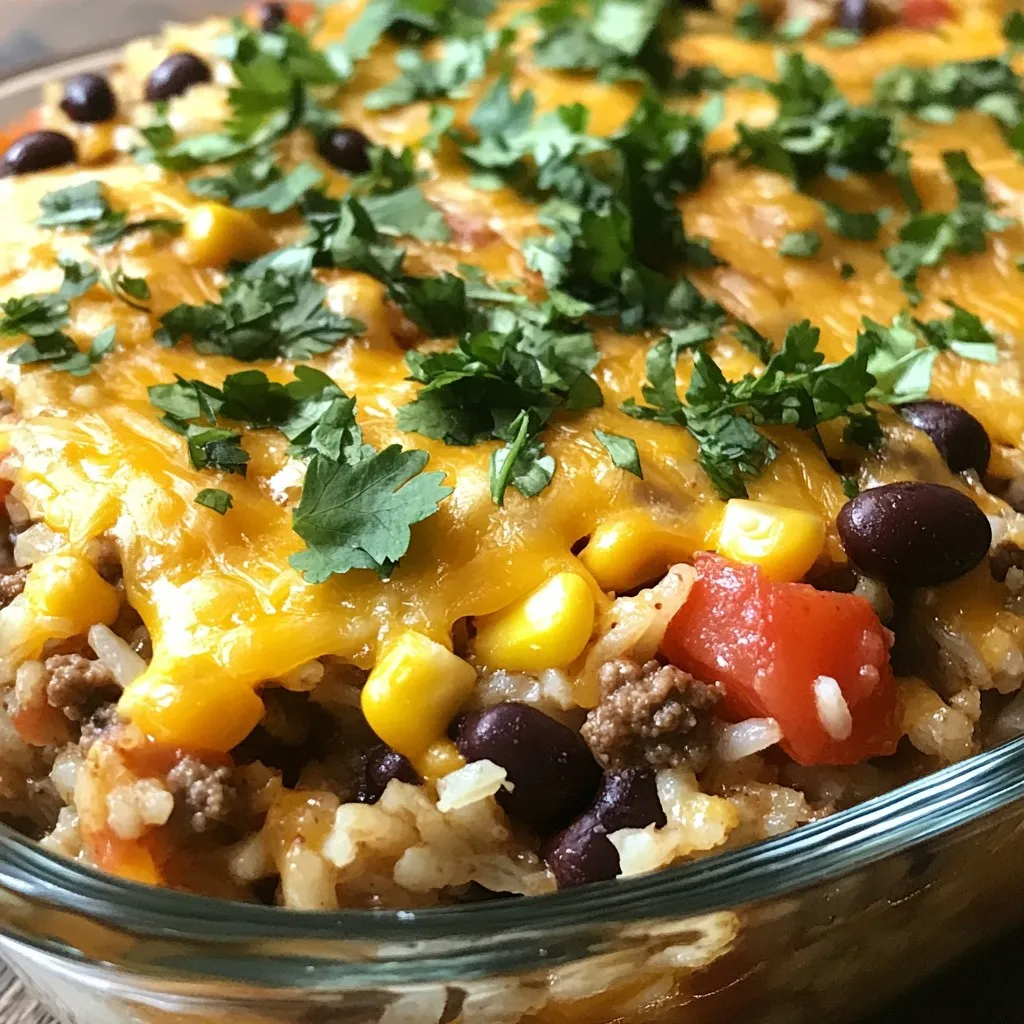 A hearty and cheesy casserole featuring ground beef, rice, and beans.