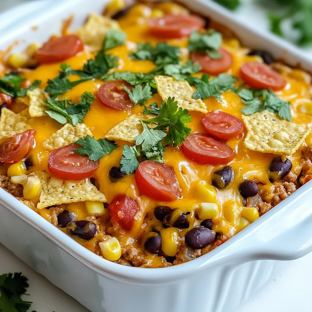 A delicious and hearty casserole featuring ground beef, black beans, corn, and plenty of cheese, topped with crunchy tortilla chips.