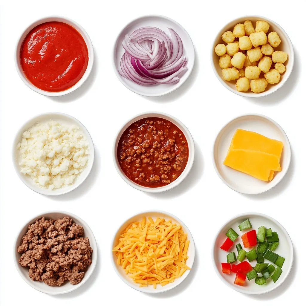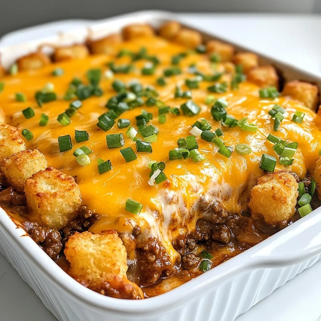 A hearty and cheesy casserole featuring ground beef, chili, and crispy tater tots.