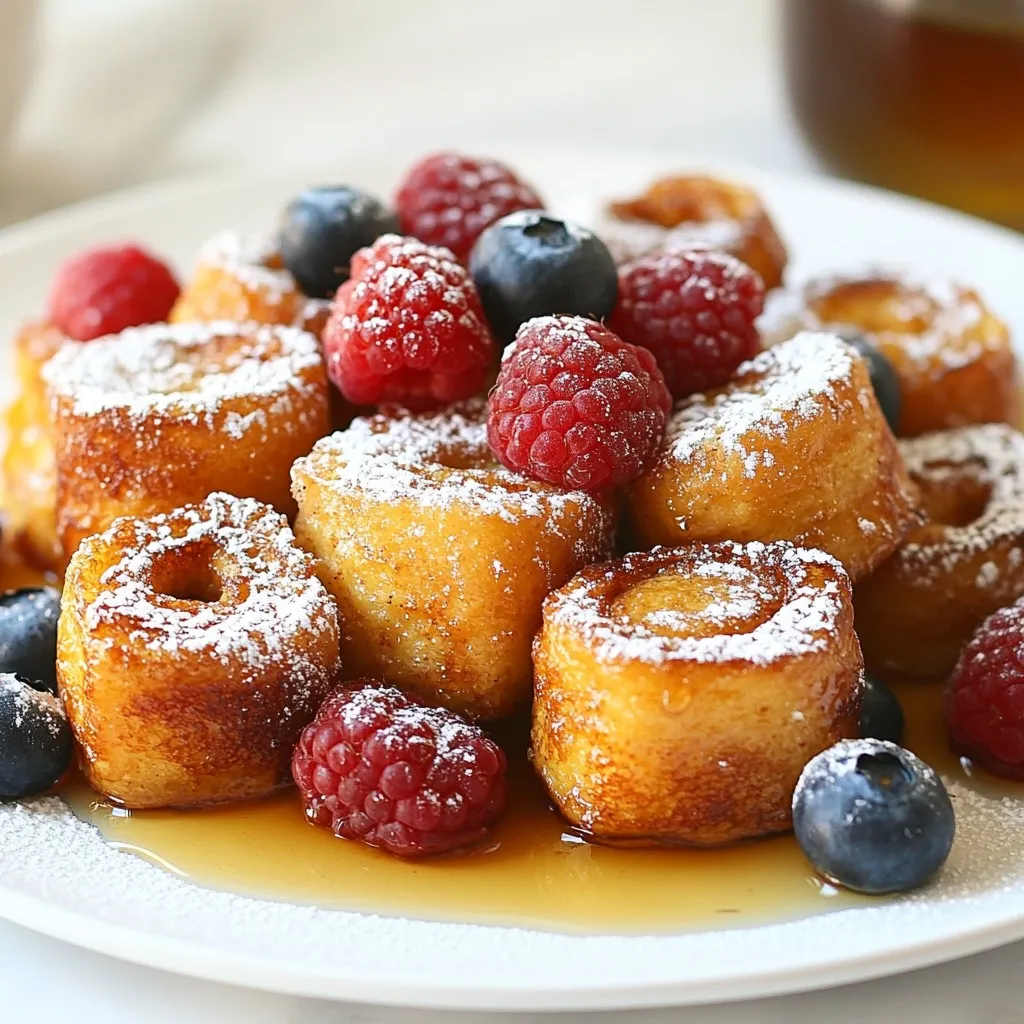 Serve your cinnamon roll French toast bites warm. Arrange them on a nice platter for a lovely look. Add fresh berries like raspberries and blueberries for color and taste. A drizzle of maple syrup on top makes it even better. You can also serve them with a small pitcher of syrup. This way, everyone can add their own. Enjoy them with a cup of coffee or tea for a sweet breakfast treat!