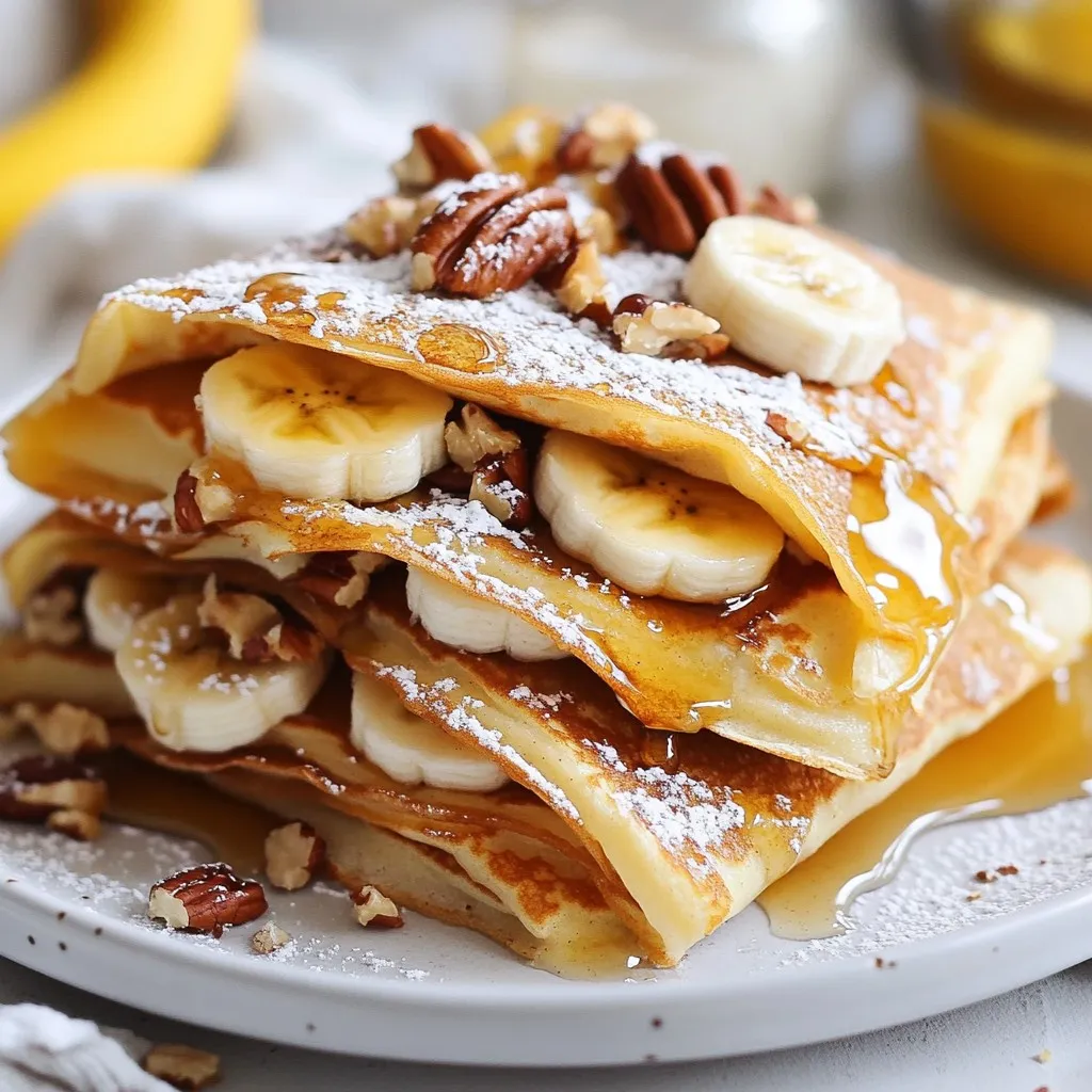 • Serve: Arrange the filled crepes on a serving plate. Top generously with sliced bananas, a sprinkle of chopped pecans if using, and a lavish drizzle of maple syrup.