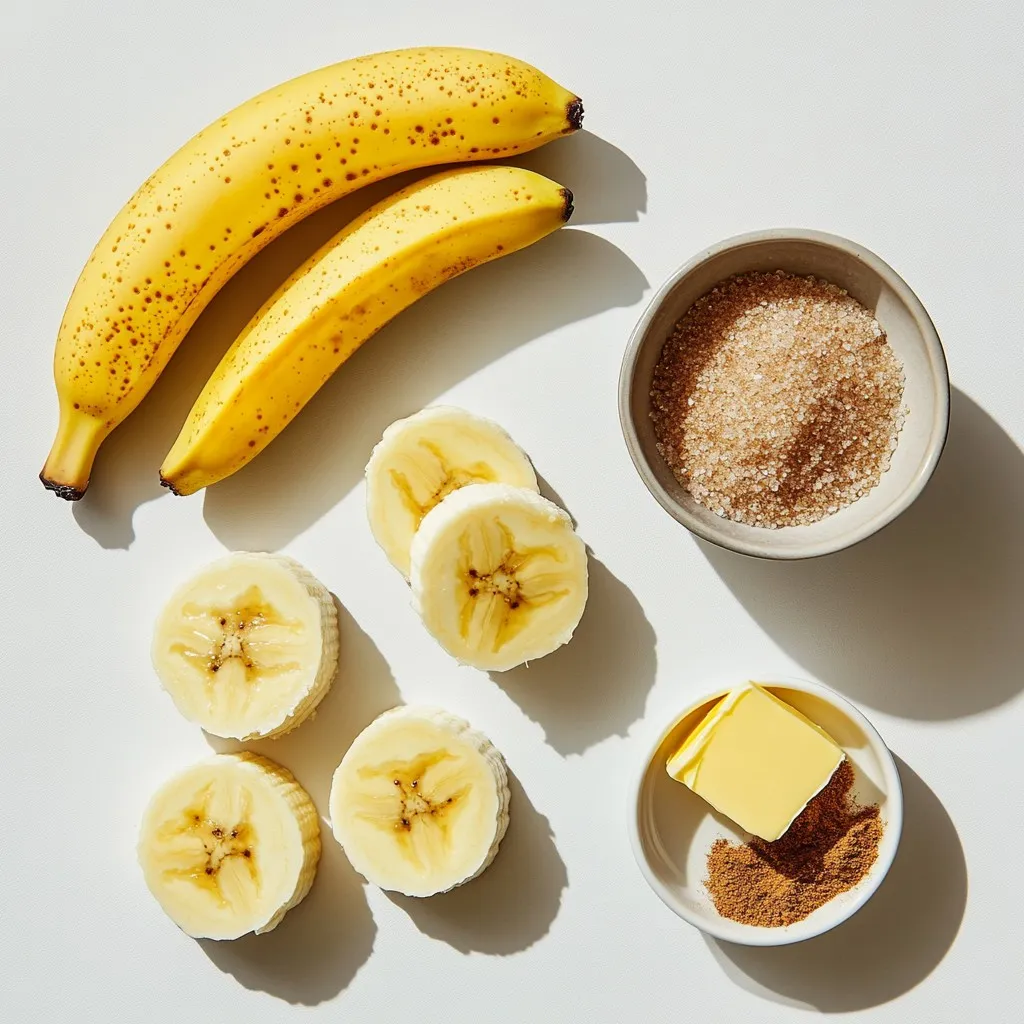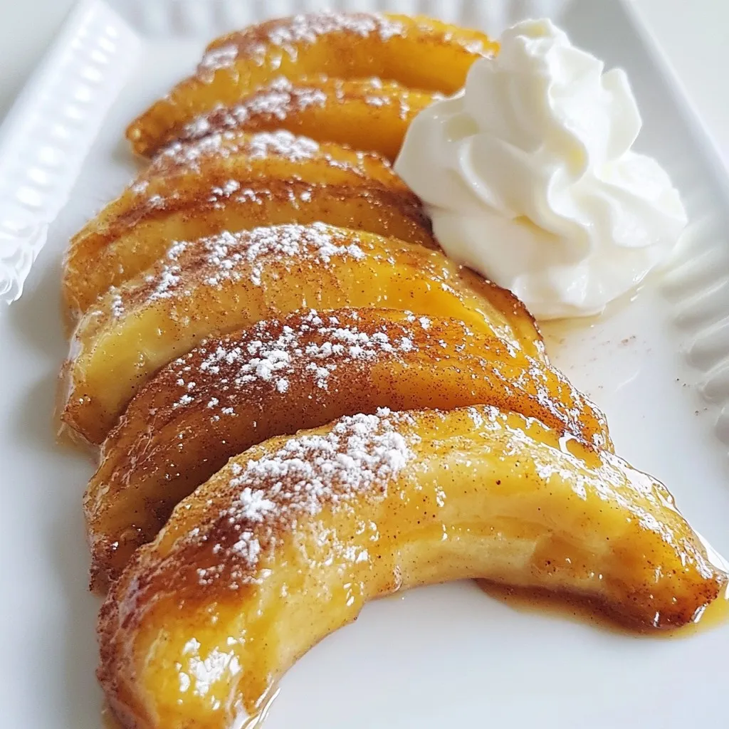 - 2 ripe bananas, sliced into 1/2-inch rounds - 2 tablespoons unsalted butter - 3 tablespoons packed brown sugar - 1 teaspoon ground cinnamon - A pinch of salt - Optional toppings: Whipped cream or vanilla ice cream To make Cinnamon Sugar Pan Fried Bananas, you need just a few ingredients. First, grab two ripe bananas. The riper the bananas, the sweeter they will be. Slice them into rounds that are about half an inch thick. Next, you need some unsalted butter. You will use two tablespoons to help cook the bananas and add richness. For sweetness and flavor, gather three tablespoons of packed brown sugar. This will caramelize beautifully when heated. You also need one teaspoon of ground cinnamon. This spice gives the dish its warm, comforting taste. Lastly, add a pinch of salt. This little bit enhances the flavors and balances the sweetness. If you want to take it up a notch, consider optional toppings. Whipped cream or vanilla ice cream pairs perfectly with the warm bananas. These ingredients come together to create a delightful treat that feels special and tastes amazing. {{ingredient_image_2}} In a small bowl, combine three tablespoons of brown sugar, one teaspoon of ground cinnamon, and a pinch of salt. Mix them well until they blend nicely. This mixture adds a sweet and spicy flavor to our dish. Next, place a large skillet over medium heat. Add two tablespoons of unsalted butter to the pan. Let it melt slowly, keeping an eye on it. You want the butter to foam slightly, but do not let it turn brown. That can change the taste. Once the butter is melted, add the sliced bananas to the skillet. Make sure to lay them out in a single layer. Cook them for about one to two minutes. You want them to soften but still hold their shape. Now, sprinkle half of your cinnamon sugar mixture over the bananas. Using a spatula, gently flip the bananas to coat them in sugar. Let them cook for another one to two minutes. This will help them caramelize and turn a lovely golden brown. Carefully take the bananas out of the skillet and place them on a serving plate. Sprinkle the remaining cinnamon sugar mixture over the warm bananas. This extra touch intensifies the flavor and makes them even more delicious. Enjoy your warm cinnamon sugar pan-fried bananas right away. For an extra treat, add a fluffy dollop of whipped cream or a scoop of vanilla ice cream. This makes your dessert even more special and fun to eat! For the best taste, use ripe bananas. They should be yellow with a few brown spots. This ripeness means they are sweet and soft. Overripe bananas will be mushy, while underripe bananas will not taste as good. You want bananas that are firm yet can be easily sliced. This balance gives your dish great flavor and texture. When cooking, keep the heat at medium. If the butter gets too hot, it will brown. Brown butter has a nutty taste, which can change the flavor of your dish. Watch the butter closely. When it foams but does not brown, it's ready. This careful step ensures your bananas cook perfectly without any burnt taste. Serve your pan-fried bananas warm. They are delicious on their own, but toppings can make them even better. Try adding a scoop of vanilla ice cream or a dollop of whipped cream. This adds creaminess and richness to the dish. You can also drizzle the leftover melted butter from the pan over the bananas for extra flavor. A sprinkle of extra cinnamon can make your dish look fancy and taste amazing! Pro Tips Choose the Right Bananas: Opt for ripe bananas that are slightly speckled for the best flavor and sweetness. Monitor the Heat: Keep the skillet on medium heat to avoid burning the sugar while caramelizing the bananas. Experiment with Spices: Try adding a pinch of nutmeg or vanilla extract to the cinnamon sugar for a unique twist. Serving Suggestions: For an extra indulgent experience, serve with a drizzle of chocolate sauce or a sprinkle of chopped nuts. {{image_4}} You can make your cinnamon sugar pan-fried bananas even better. Try adding nuts like walnuts or almonds. They give a nice crunch. You can also add other fruits. Sliced strawberries or apples can bring new flavors. Mix and match to find your favorite. Want to change up the taste? Try adding spices like nutmeg or allspice. A pinch can make a big difference. Nutmeg adds warmth, while allspice brings a hint of sweetness. Don't be afraid to play around. You might create your new favorite treat! You can make this treat a bit healthier. Use coconut oil instead of butter for a lighter option. For less sugar, try using honey or maple syrup. These swaps can lower calories while keeping the flavor. Enjoy a tasty dessert without the guilt! To keep your cinnamon sugar pan-fried bananas fresh, store them in an airtight container. Place them in the fridge. They will stay tasty for up to two days. Make sure to let them cool to room temperature before sealing them up. This way, you prevent extra moisture that can make them mushy. When you're ready to enjoy leftovers, reheat them on the stove for the best taste. Use a small pan over low heat. Add a little butter to the pan to help with flavor. Heat for about 2-3 minutes until warm. This keeps the bananas soft and tasty, without losing their charm. Can you freeze cinnamon sugar pan-fried bananas? Yes, but they may change in texture. If you want to freeze them, place the bananas in a single layer on a baking sheet. Freeze for a few hours, then transfer them to a freezer bag. They can last up to a month. When you’re ready to use them, thaw them in the fridge overnight. They may not be as firm, but they will still taste great! You can use frozen bananas, but they change texture. Fresh bananas keep their shape and firmness when cooked. Frozen ones become mushy. If you use frozen, thaw them first. Drain any extra liquid. This helps avoid a soggy dish. If you want a dairy-free option, use coconut oil or vegan butter. Both give a nice flavor. You can also use olive oil for a different taste. Just m