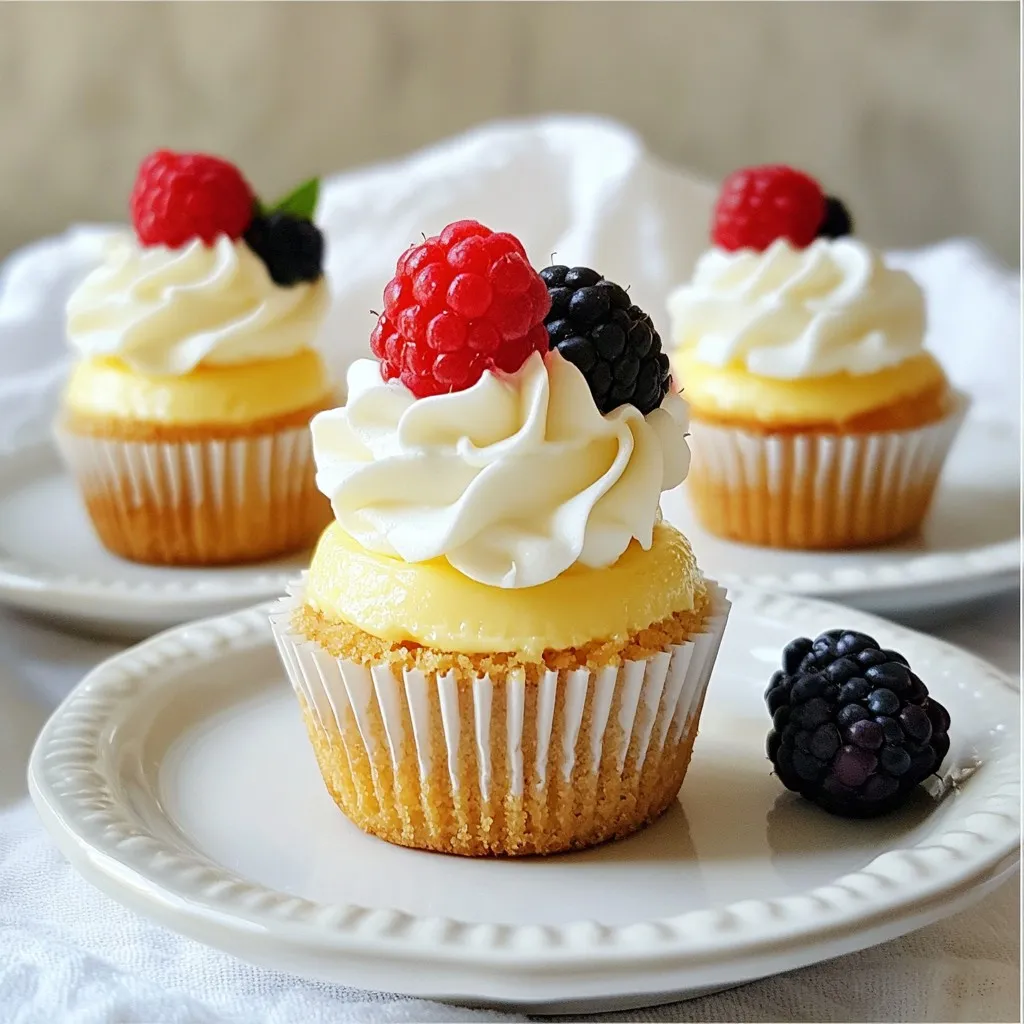 - 1 cup graham cracker crumbs - 2 tablespoons granulated sugar - 1/4 cup unsalted butter, melted - 16 ounces cream cheese, softened to room temperature - 1/2 cup granulated sugar - 1/4 cup sour cream - 2 large eggs, at room temperature - 1 teaspoon pure vanilla extract - Zest of 1 lemon (optional, for a fresh citrus note) - Selecting the best cream cheese: Always choose full-fat cream cheese. It gives the best flavor and texture. Check for a smooth and soft package. This helps your batter mix well. - Choosing the right granulated sugar: Use standard granulated sugar. It dissolves easily, which is key for smooth cheesecakes. Avoid brown sugar or alternatives, as they can change the taste. - Importance of using room temperature eggs: Eggs mix better when they are at room temperature. This helps create a creamy filling. Take them out of the fridge about 30 minutes before you bake. {{ingredient_image_2}} Preheating your oven is very important. A steady temperature helps bake the cheesecakes evenly. Set your oven to 325°F (163°C) before you start mixing. This way, when you place the mini cheesecakes in, they will bake perfectly. To make the crust, you need graham cracker crumbs, sugar, and butter. In a medium bowl, mix 1 cup of graham cracker crumbs and 2 tablespoons of granulated sugar. Then, pour in 1/4 cup of melted butter. Stir it well until all the crumbs are coated. This mixture should look like wet sand. For the filling, you want it creamy and smooth. Start with 16 ounces of softened cream cheese in a large bowl. Use an electric mixer to beat it until it’s smooth. Next, add 1/2 cup of granulated sugar slowly. Mix well after each addition. Then, blend in 1/4 cup of sour cream. Now, add 2 large eggs one at a time. Mix each egg in well before adding the next. Finally, add 1 teaspoon of pure vanilla extract and lemon zest if you like. This will give your filling a fresh taste. It’s time to bake! Carefully pour the cheesecake batter over the crust in each liner. Fill them about 3/4 full. Place the muffin tin in the oven and bake for 18-20 minutes. The edges should be set, but the centers can still jiggle a bit. This jiggle means they will be creamy. Cooling is very important for texture. After baking, let the mini cheesecakes cool in the tin for about 10 minutes. Then, transfer them to a wire rack to cool completely. Once they are cool, refrigerate them for at least 4 hours, or overnight if you can wait. This chilling time helps them set up perfectly. - Overmixing the batter: Mixing too much adds air, which can cause cracks. Mix until just smooth. - Not chilling properly: Skipping chill time means your cheesecakes may not set. Always chill for at least four hours. - Muffin tin: A non-stick muffin tin helps the cheesecakes release easily. - Cupcake liners: Use these to prevent sticking and make serving easier. - Electric mixer: This tool helps achieve a smooth filling without lumps. - Rubber spatula: Great for scraping down the sides of the bowl. - Wire rack: Perfect for cooling the cheesecakes evenly. - Room temperature ingredients: Make sure cream cheese and eggs are at room temperature. This helps mix them smoothly. - Gentle mixing: Mix eggs in one at a time. This avoids overmixing and keeps the batter smooth. - Bake until slightly jiggly: The centers should be soft but not liquid. This ensures they will set nicely when chilled. Pro Tips Choose the Right Cream Cheese: Make sure to use full-fat cream cheese for the best flavor and texture. Low-fat versions may not yield the same creamy results. Room Temperature Ingredients: Ensure that your cream cheese, eggs, and sour cream are at room temperature before mixing. This helps create a smoother batter and prevents lumps. Don’t Overmix: When adding the eggs, mix just until incorporated. Overmixing can introduce too much air, causing the cheesecakes to crack during baking. Perfect Cooling: Allow the cheesecakes to cool in the tin for 10 minutes before transferring them to a wire rack. This prevents them from breaking apart and ensures they set properly. {{image_4}} You can easily change the flavor of your mini cheesecakes. Here are a few ideas: - Chocolate: Add 1/2 cup of melted chocolate to the filling. This gives a rich and creamy chocolate taste. - Pumpkin: Mix in 1 cup of pumpkin puree and 1 teaspoon of pumpkin spice. This brings a warm, fall flavor. - Berry: Fold in 1 cup of fresh or frozen berries. Blueberries, strawberries, and raspberries all work well. Each flavor creates a unique treat that everyone will love. You can also mix flavors for even more fun! The crust adds a nice crunch. You can switch it up for different tastes: - Oreo Crust: Use crushed Oreo cookies instead of graham crackers for a chocolatey twist. - Gingersnap Crust: If you like a spicy kick, try gingersnap cookies. They add warmth and flavor. - Almond Flour Crust: For a gluten-free option, use almond flour mixed with melted butter. It’s nutty and delicious. Experimenting with crusts makes your cheesecakes even more special! Toppings can take your mini cheesecakes to the next level. Here are some fun ideas: - Whipped Cream: A dollop of whipped cream adds a light, airy touch. - Fresh Fruit: Top with sliced strawberries, blueberries, or raspberries for color and sweetness. - Fruit Sauce: Drizzle with raspberry or chocolate sauce for a sweet and pretty finish. These toppings make your mini cheesecakes look and taste amazing! To keep your mini cheesecakes fresh, place them in an airtight container. If you have extra room, cover them with plastic wrap. This step helps keep moisture in and prevents drying. For best results, store them in the fridge. These mini cheesecakes will last up to five days in the fridge. If you want to save them longer, freeze them. They can stay fresh for up to three months in the freezer. Just remember to wrap them well to avoid freezer burn. If you want to warm up your mini cheesecakes, do it slowly. Preheat your oven to 300°F (150°C).
