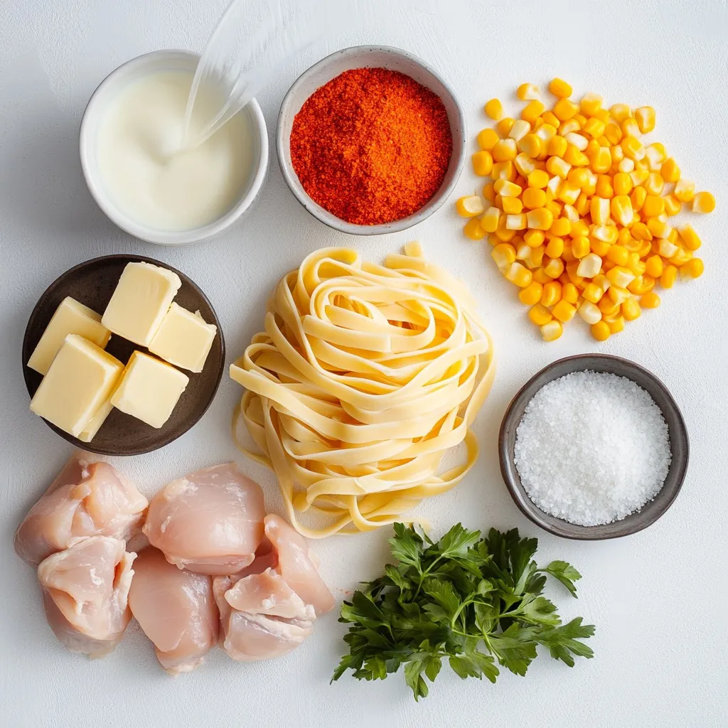 Gather these ingredients and tools to make your Cowboy Butter Chicken Pasta. Each item plays a key role in creating a rich, flavorful dish. The chicken adds protein, while the fettuccine serves as a perfect base. The butter and spices create a creamy sauce that ties everything together. Don’t forget the cheese and corn for extra taste and texture!