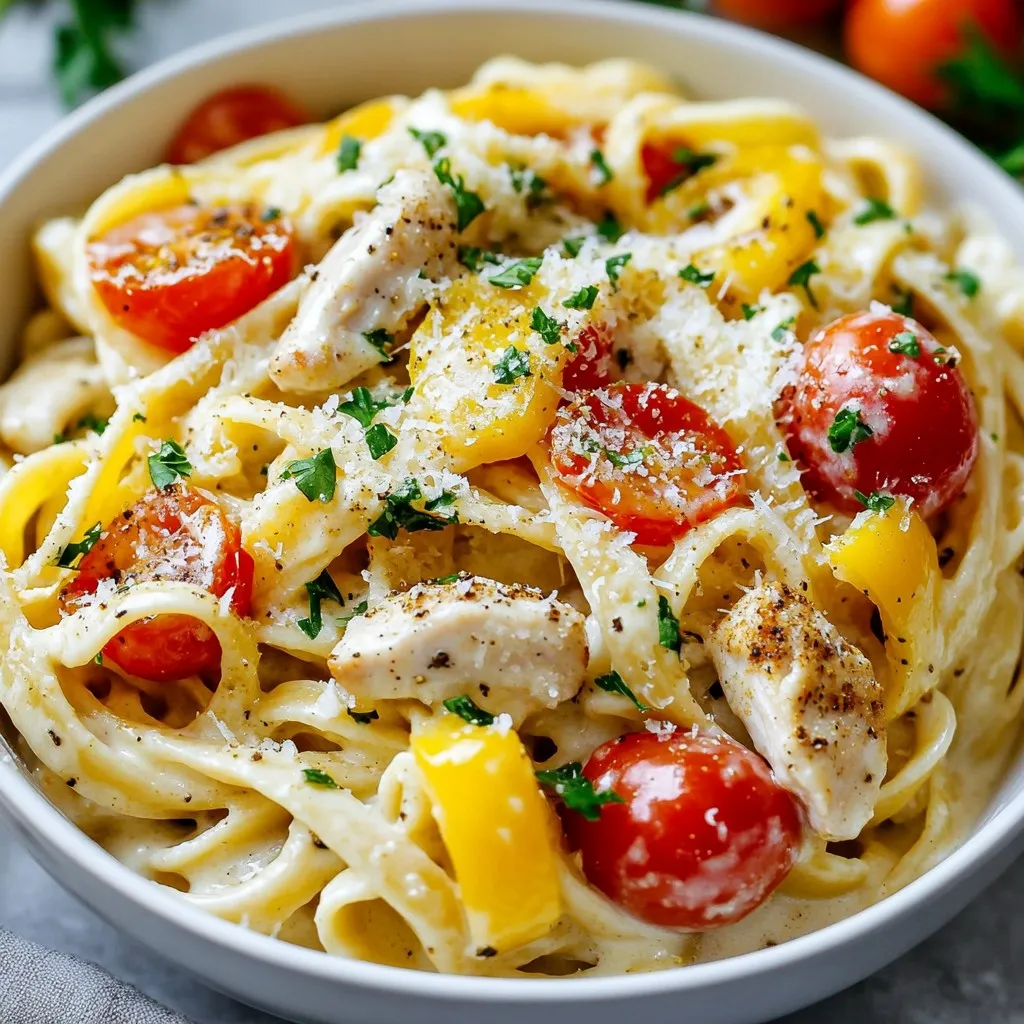 A delicious and creamy pasta dish featuring Cajun seasoned chicken, bell peppers, and cherry tomatoes.
