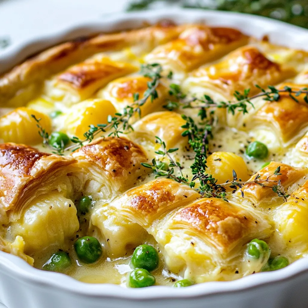 A comforting pot pie filled with creamy chicken, gnocchi, and vegetables, topped with golden puff pastry.