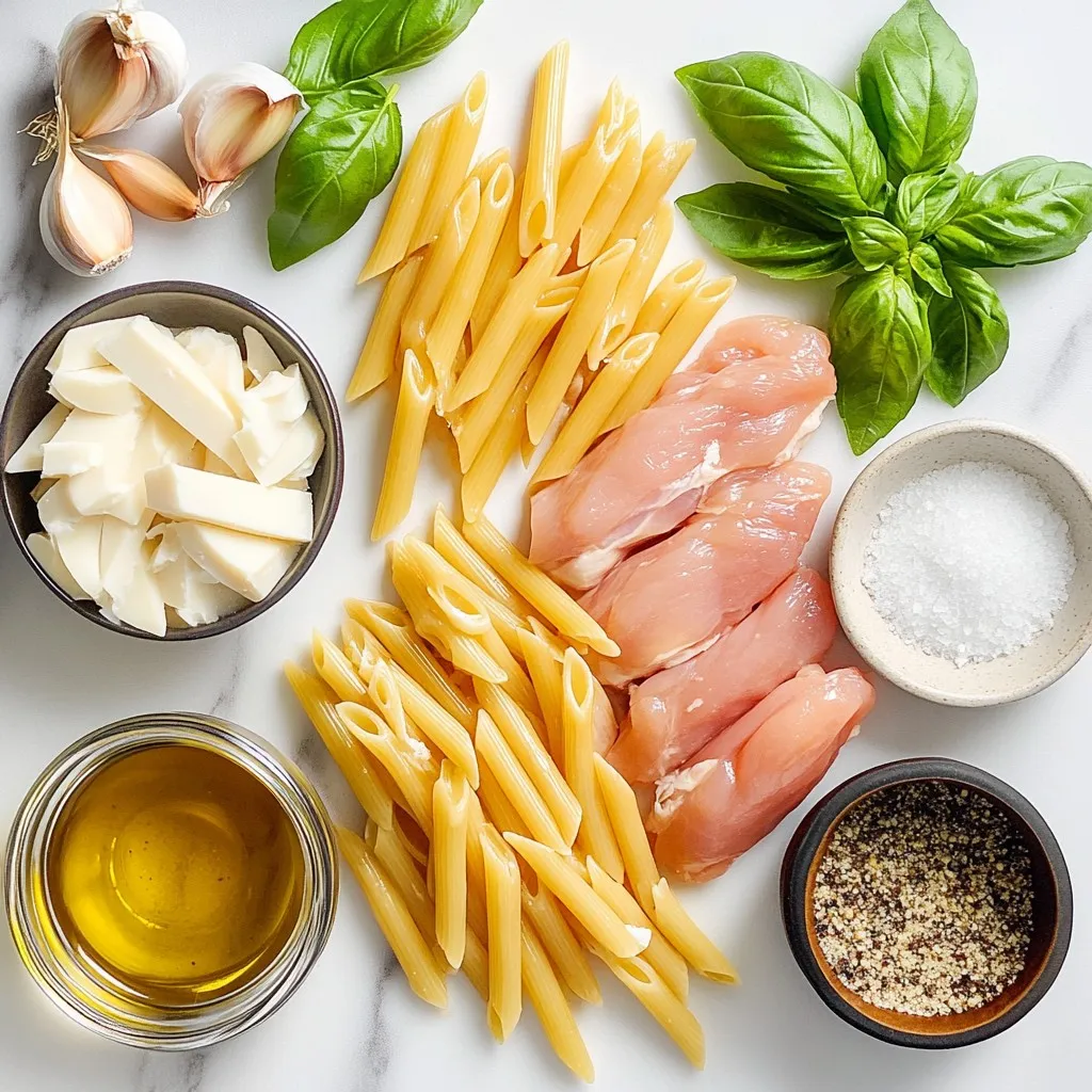 Gather these ingredients first. The penne pasta serves as the base and holds the creamy sauce well. Chicken breast gives protein and heartiness. Heavy cream adds richness while Parmesan cheese brings a savory depth.
