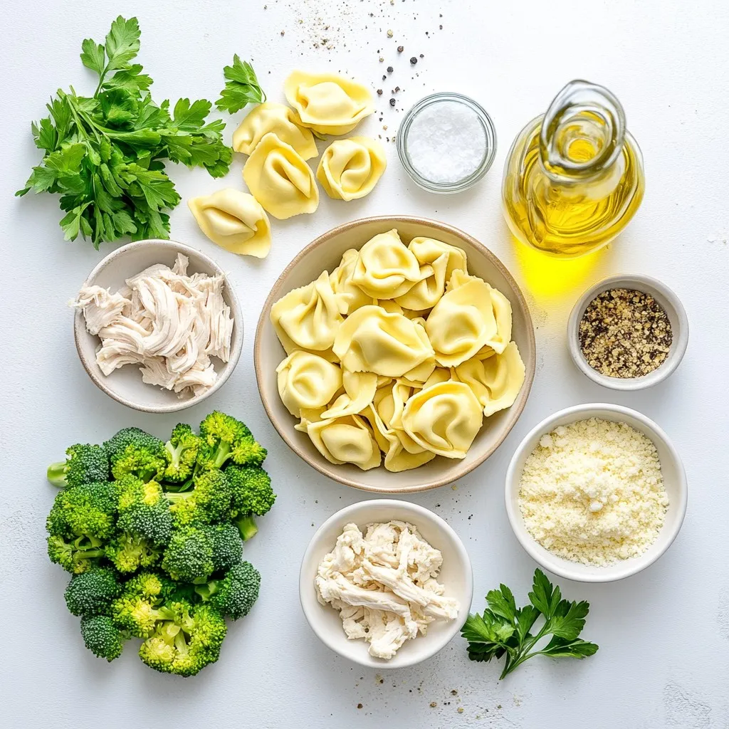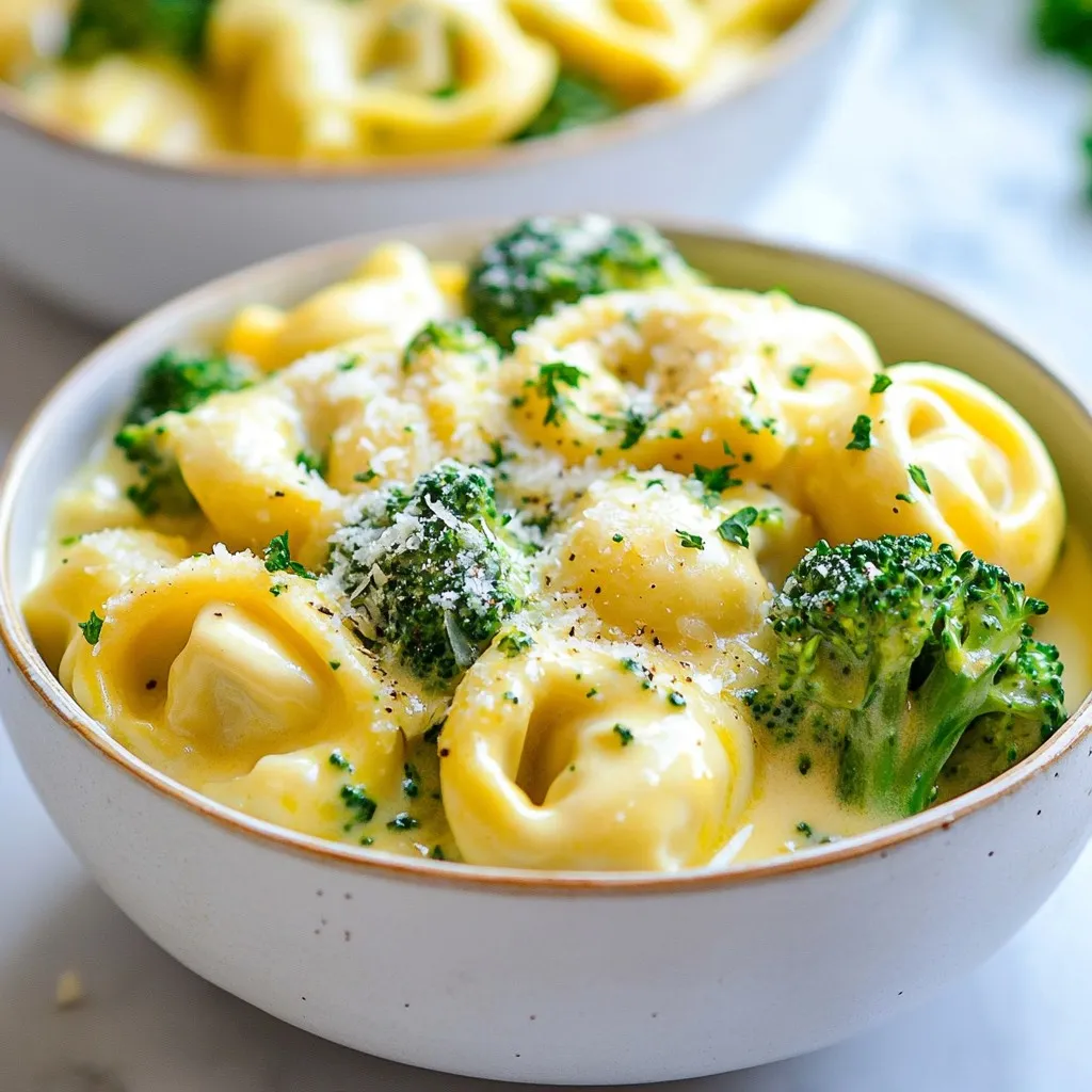 A delicious and creamy pasta dish featuring cheese tortellini, shredded chicken, and fresh broccoli in a rich sauce.
