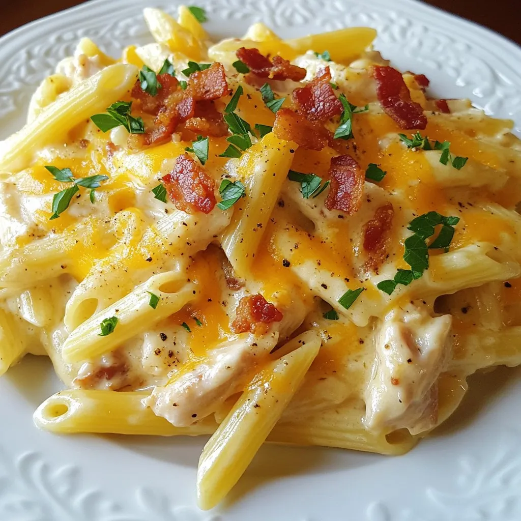 - 8 oz penne pasta - 1 lb chicken breasts, diced into bite-sized pieces - 1 tablespoon olive oil - 1 packet ranch seasoning mix - 1 cup cream cheese, softened to room temperature - 1 cup chicken broth (preferably low-sodium) - 1 cup shredded sharp cheddar cheese - 1/2 cup cooked bacon bits (can substitute with turkey bacon for a lighter option) - 1/2 cup green onions, sliced finely - 1/2 teaspoon garlic powder - Salt and pepper to taste - Fresh parsley, chopped, for garnish Creating a great meal starts with the right ingredients. For this creamy crack chicken penne, you will need penne pasta, chicken breasts, and some key seasonings. The ranch seasoning mix brings a unique flavor that makes this dish special. Cream cheese and cheddar cheese create that rich, creamy texture we love. You can use bacon bits for a savory crunch, but feel free to swap in turkey bacon if you prefer a lighter option. Green onions add a fresh taste and vibrant color. Don't forget garlic powder, salt, and pepper. These ingredients help to enhance all the flavors. Finally, fresh parsley is perfect for garnish. It adds a nice pop of color and a hint of freshness. Each ingredient plays a role in making this dish a flavorful dinner delight. Gather these items, and you’ll be ready to create a meal your family will love! {{ingredient_image_2}} 1. Start by bringing a large pot of salted water to a boil. This water will help cook the pasta. 2. Add 8 oz of penne pasta to the boiling water. Cook it until it is al dente, about 8-10 minutes. 3. Once the pasta is done, drain it well. Be sure to save a small cup of pasta water to use later if needed. 1. In a large skillet, heat 1 tablespoon of olive oil over medium heat. Wait until it shimmers before adding chicken. 2. Add 1 lb of diced chicken breasts to the skillet. Season it with 1/2 teaspoon garlic powder, salt, and pepper to taste. 3. Sauté the chicken for about 7-10 minutes. Stir occasionally until the chicken is browned and fully cooked, reaching 165°F (75°C). 1. Sprinkle 1 packet of ranch seasoning mix over the cooked chicken. Stir it well to coat the chicken evenly. 2. Lower the heat to medium-low. Add 1 cup of softened cream cheese and 1 cup of chicken broth to the skillet. 3. Stir continuously until the cream cheese melts and mixes with the broth, forming a smooth sauce. 4. Gradually mix in 1 cup of shredded sharp cheddar cheese. Keep stirring until it melts. If the sauce is too thick, add a splash of the reserved pasta water. 1. Carefully fold in the cooked penne pasta and 1/2 cup of cooked bacon bits. Make sure every piece of pasta is coated well with the sauce. 2. Cook the mixture for an additional 2-3 minutes. This helps heat everything through. 3. Stir in 1/2 cup of sliced green onions, mixing them evenly into the pasta. 4. Taste the dish and adjust the seasoning with more salt and pepper, if needed. - How to check chicken doneness: Use a meat thermometer. Chicken should reach 165°F (75°C). This ensures it's safe to eat. - Avoiding a thick sauce: If your sauce is too thick, add a splash of reserved pasta water. This keeps the sauce creamy and smooth. Stir well to blend. - Keeping pasta from sticking: Stir the pasta immediately after draining. A little olive oil helps keep it from clumping together. - Presentation ideas for serving: Serve in shallow bowls for a nice look. Add extra bacon bits and green onions on top for texture. A sprinkle of parsley adds color. - Pairing with sides or salads: Serve with a fresh green salad or garlic bread. These sides balance the creamy dish and add crunch. Pro Tips Perfect Pasta: Always cook the penne pasta until al dente for the best texture. It will continue to cook slightly when mixed with the sauce. Seasoning Balance: Taste your sauce before serving. Adjust the salt and pepper to ensure a well-balanced flavor. Cheese Tip: Use freshly shredded cheddar cheese instead of pre-shredded for better melting and a creamier sauce. Ingredient Swaps: Feel free to customize this dish by adding vegetables like spinach or bell peppers for extra nutrition and color. {{image_4}} You can easily change this dish to fit your needs. If you want a lighter option, try using turkey bacon instead of regular bacon. This swap keeps the flavor but cuts down on fat. You can also make the dish gluten-free by using gluten-free penne pasta. This way, everyone can enjoy it! Get creative with the flavors in this dish! You can add vegetables like spinach, bell peppers, or broccoli. These will boost nutrition and add color. You could also experiment with different cheese types. Try using pepper jack for a kick or mozzarella for a milder taste. Each change makes the dish unique and fun! To keep your creamy crack chicken penne fresh, use proper storage containers. Glass or plastic containers with tight lids work well. Let the dish cool before putting it in the fridge. This step helps it stay creamy and tasty. Aim to store it within two hours of cooking for best results. For reheating, the best methods are using the stove or microwave. If using the stove, place it in a skillet over low heat. Stir often to avoid burning. Add a splash of chicken broth or cream to keep it creamy. If using a microwave, heat in short bursts. Stir between intervals until it’s hot. Always check the temperature to ensure it heats evenly. Crack Chicken is a creamy, flavorful dish that combines chicken, ranch seasoning, and cheese. It has a rich and savory taste with hints of garlic and herbs. Many people love its creamy texture and comforting flavor. This dish often features bacon bits for added crunch and a burst of flavor. Yes, you can make this recipe ahead of time. Prepare the creamy sauce and chicken mixture without the pasta. Store it in an airtight container in the fridge for up to three days. When you are ready to serve, cook the penne pasta and mix it with the sauce. This saves time and allows the flavors to meld nicely. To add some heat, try adding crushed red pepper 