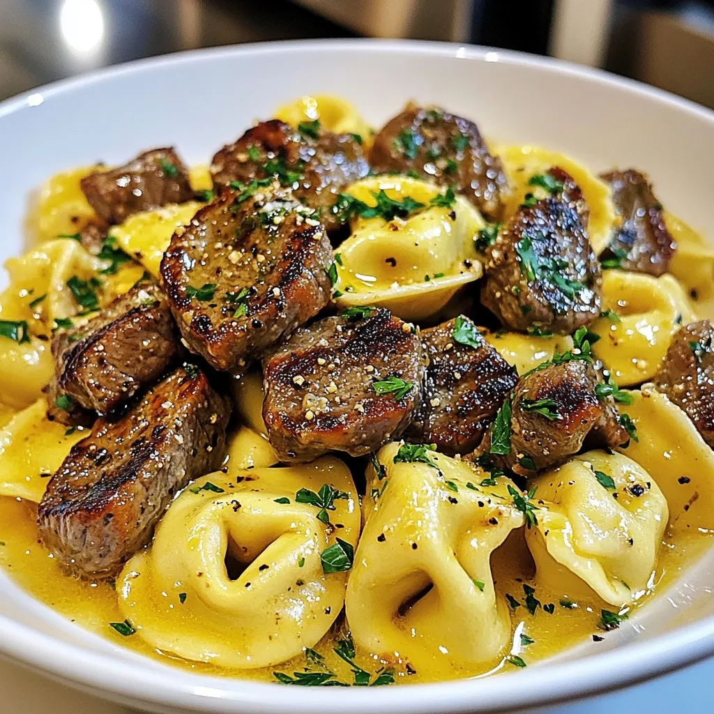 A rich and creamy pasta dish featuring tender steak and cheese tortellini in a garlic sauce.