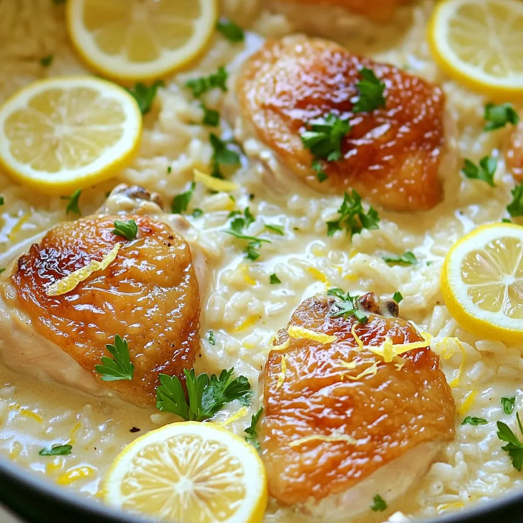 - 1 lb boneless, skinless chicken thighs - 1 cup long-grain rice (basmati or jasmine) - 4 cups chicken broth - 1 cup heavy cream - 1 medium onion, diced - 3 cloves garlic, minced - 1 tablespoon olive oil - 1 teaspoon dried oregano - Zest of 1 lemon - Juice of 1 lemon - Salt and freshly ground black pepper to taste - Fresh parsley, chopped - Lemon slices In this dish, the chicken thighs bring a rich flavor and tenderness. I often choose basmati or jasmine rice for their light texture. The chicken broth adds depth, making this meal feel complete. Heavy cream ensures a creamy consistency that envelops every bite. The onion and garlic create a fragrant base. When they sauté, they release sweet and savory notes that elevate the dish. Adding olive oil helps to cook these aromatics evenly. Dried oregano gives a warm touch, while the lemon zest and juice add brightness. Salt and pepper enhance all the flavors, making them sing. For garnishes, fresh parsley adds a pop of color and freshness. Lemon slices are a lovely touch, brightening the dish visually and flavor-wise. Each ingredient plays a role in creating this delightful one-pot meal. First, heat 1 tablespoon of olive oil in a large pot over medium heat. Once hot, add the diced onion. Sauté the onion until it turns translucent. This takes about 3 to 4 minutes. Next, add 3 cloves of minced garlic and 1 teaspoon of dried oregano. Stir well to mix. Cook for another minute until the garlic smells great. Be careful not to burn it. Now, add 1 pound of boneless, skinless chicken thighs cut into bite-sized pieces. Season the chicken with salt and freshly ground black pepper. Cook the chicken, stirring often, until it turns brown on all sides. This should take around 5 to 7 minutes. Gradually pour in 4 cups of chicken broth. Bring the mix to a gentle simmer. Next, add 1 cup of long-grain rice, the zest of 1 lemon, and the juice of 1 lemon. Stir everything well to make sure it is evenly mixed. Cover the pot with a lid and reduce the heat to low. Cook for 18 to 20 minutes. Do not lift the lid while it cooks. This keeps the steam in and helps the rice cook perfectly. Once the rice is tender, remove the pot from heat. Stir in 1 cup of heavy cream until it is fully blended. If it looks too thick, add a splash of chicken broth to thin it out. Taste the dish and add more salt and pepper if needed. Let the dish sit for about 5 minutes off the heat. This helps it thicken a bit and lets the flavors mix well. Serve the creamy lemon chicken and rice in bowls. Garnish each bowl with fresh parsley and a lemon slice for extra flavor and color. - How to ensure perfect rice texture To get fluffy rice, use long-grain rice like basmati or jasmine. Rinse the rice in cold water. This removes excess starch and helps keep the grains separate. When cooking, keep the pot covered and avoid lifting the lid. This traps steam and cooks the rice evenly. - Adjusting creaminess and seasoning For a creamier dish, stir in the heavy cream slowly. If it feels too thick, add a splash of chicken broth. Taste your dish as you go. Add salt and pepper to make the flavors pop. Small tweaks can make a big difference. - Efficient chopping techniques Use a sharp knife for quick and safe chopping. Cut the onion and garlic finely to release their flavors. For chicken, chop it into even pieces. This helps it cook evenly and quickly. - Pre-measuring ingredients for convenience Measure out all your ingredients before you start cooking. This makes your cooking process smoother. You won’t have to pause to find or measure ingredients as you go. - Balancing acidity with cream Lemon juice adds brightness but can be sharp. The heavy cream softens the acidity. Start with a little lemon juice, then add more if needed. This way, you control the tanginess. - Enhancing zest for more brightness Use fresh lemon zest to brighten the dish. Grate the zest finely to release more oils. This adds a fragrant aroma and deeper flavor without more acidity. A little zest goes a long way in enhancing your dish. {{image_4}} You can swap chicken thighs for chicken breasts. Chicken breasts are leaner and cook faster. They still taste great in this dish. If you prefer a different rice, you can use arborio or brown rice. Just remember that different rice types may change cooking times. Adding veggies can make this dish even better. Spinach or peas mix well with the creamy sauce. You can also try fresh herbs like basil or thyme. They add depth and freshness to each bite. Spices like paprika or red pepper flakes can bring some heat. If you want to make it dairy-free, use coconut milk instead of heavy cream. It keeps the dish creamy while adding a subtle sweetness. For gluten-free options, choose rice like jasmine or basmati. Always check labels for gluten-free assurance. To keep your creamy lemon chicken and rice fresh, store it in an airtight container. Make sure it cools first before sealing it up. This way, you prevent condensation, which can make the dish soggy. It lasts in the fridge for about 3 to 4 days. Always check for any strange smells or changes in color before eating. If you want to freeze your leftovers, choose a freezer-safe container. Glass or heavy-duty plastic works well. Leave some space at the top for expansion. This dish can be frozen for up to 2 months. When you're ready to eat, thaw it in the fridge overnight. You can reheat your dish in the microwave or on the stovetop. If using the microwave, heat it in short bursts. Stir in between to ensure even heating. If you use the stovetop, add a splash of chicken broth. This helps maintain the creaminess. Stir gently while warming to keep it smooth and delicious. It takes about 40 minutes to make this dish. You need 10 minutes to prep the ingredients. Cooking the chicken and rice takes about 30 minutes. Here’s a breakdown: - Prep Time: 10 minutes - Cook Time: 30 minutes This includes sautéing, simmering, and finishing with cream. Yes, you can prepare this di