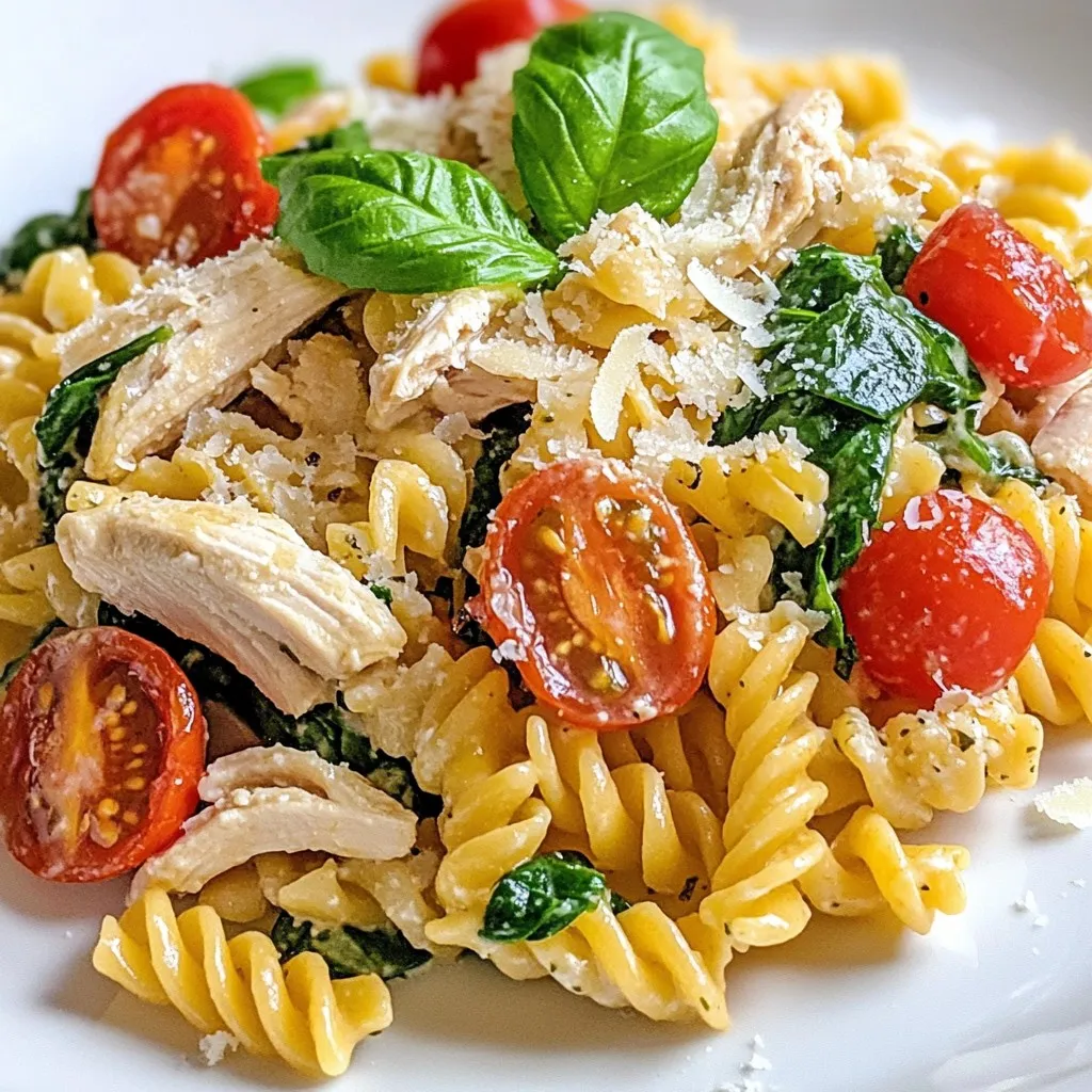 - 2 cups shredded rotisserie chicken - 12 oz pasta (fussili or penne recommended) - 1 tablespoon olive oil - 3 cloves garlic, minced - 1 medium onion, diced - 1 cup heavy cream - 1 cup chicken broth - 1 cup fresh baby spinach - 1 cup cherry tomatoes, halved - 1 teaspoon garlic powder - 1 teaspoon Italian seasoning - Salt and pepper, to taste - ½ cup grated Parmesan cheese - Fresh basil leaves, for garnish - Large pot - Skillet - Colander - Measuring cups and spoons - Tongs or spatula I love this dish because it’s quick and tasty. You can whip it up in about 30 minutes. Using rotisserie chicken makes it even easier. You get great flavor and save time. Let’s talk about the ingredients. You’ll need some pasta, like fussili or penne. They hold the sauce well. The creamy sauce needs heavy cream and chicken broth for richness. Don’t forget the garlic and onion. They give a nice depth to the dish. Fresh spinach and cherry tomatoes add color and nutrition. I always sprinkle some Parmesan cheese for extra flavor. Gather your tools too. A large pot for boiling pasta is key. A skillet helps cook the sauce. You’ll also need a colander to drain the pasta. Measured cups and spoons help keep everything precise. Tongs or a spatula will help mix it all together. Once you have everything, you’re ready to make this creamy delight! {{ingredient_image_2}} 1. Start with a large pot of water. Bring it to a boil. 2. Add a generous amount of salt to the water. This helps flavor the pasta. 3. Add 12 oz of your chosen pasta. Cook until it is al dente. 4. Once done, drain the pasta in a colander. Reserve about ½ cup of the starchy water. Set the pasta aside. 1. Heat 1 tablespoon of olive oil in a large skillet over medium heat. 2. Once hot, add a medium onion, diced. Sauté for about 2 minutes. 3. Next, add 3 cloves of minced garlic. Cook for 1 minute until it smells nice. 4. Mix in 2 cups of shredded rotisserie chicken. Pour in 1 cup of chicken broth. 5. Bring this mix to a gentle simmer. This helps the flavors blend well. 1. Lower the heat and stir in 1 cup of heavy cream. Mix until combined. 2. Season with 1 teaspoon of garlic powder, 1 teaspoon of Italian seasoning, salt, and pepper. 3. Let this simmer for 4-5 minutes. This thickens the sauce a bit. 4. Add 1 cup of fresh baby spinach and 1 cup of halved cherry tomatoes. Cook for 2-3 minutes until the spinach wilts. 5. Gently fold in the cooked pasta. Use tongs or a spatula to mix everything. 6. If the sauce is too thick, add some of the reserved pasta water. 7. Stir in ½ cup of grated Parmesan cheese. It will melt in and make it creamy. 8. Serve hot, garnished with fresh basil leaves and extra Parmesan cheese if you want. To make your sauce just right, you can adjust the thickness with pasta water. When your pasta is done, save about half a cup of the water. If your sauce is too thick, add a little of this water. It will help loosen it up and keep it creamy. For a smooth sauce, stir the heavy cream in slowly. This prevents lumps. Keep the heat low when adding cream. This way, it won't curdle. Stir often and watch for a rich, creamy consistency. When you sauté garlic, keep an eye on it. Garlic can burn fast. Add it to the pan only after the onions soften. Cook it just until you smell that lovely aroma. This will give the best flavor without any bitterness. If you want a lighter dish, skip the heavy cream. You can use half-and-half or even Greek yogurt. Both create a nice creamy blend without all the fat. This keeps the dish tasty but a bit healthier. Pro Tips Use Fresh Ingredients: Always opt for the freshest spinach and tomatoes to enhance the flavor and nutrition of your dish. Adjusting the Creaminess: If you prefer a lighter sauce, consider using half-and-half instead of heavy cream. Extra Flavor Boost: Add a squeeze of lemon juice before serving to brighten up the dish and add a zesty flavor. Perfect Pasta Cooking: Make sure to cook your pasta just until al dente, as it will continue to cook slightly when mixed with the sauce. {{image_4}} You can change up the pasta shape to fit your taste. Fussili and penne work well, but try spaghetti or shells if you like. Each shape holds the sauce differently. This can change how you enjoy your dish. You can also swap out vegetables. If you’re not a fan of spinach, use kale or broccoli instead. For a fun twist, add bell peppers or zucchini. These veggies bring new colors and flavors. Changing the protein is another great option. If you want something different, use shredded turkey or cooked sausage. You can even go meatless by adding more veggies or chickpeas. If you need gluten-free options, look for gluten-free pasta. Many brands make pasta from rice or lentils. These cook just like regular pasta, so don’t worry about taste. For a dairy-free version, use coconut cream or almond milk in place of heavy cream. Nutritional yeast can add a cheesy flavor without using cheese. This way, you can enjoy the meal while keeping it light. To keep your creamy rotisserie chicken pasta fresh, store it in an airtight container. Make sure the dish cools to room temperature before sealing it. This helps prevent condensation, which can make the pasta soggy. In the fridge, it lasts about 3 to 4 days. Always check for any off smells or changes in texture before eating leftovers. When reheating, you want to keep that creamy texture. The best way is to use a skillet. Heat on low and add a splash of chicken broth or cream to prevent drying out. Stir frequently to warm evenly. If you're in a hurry, a microwave works too. Just cover it with a damp paper towel to trap steam. For freezing, put the pasta in a freezer-safe container. It can last up to 2 months. To reheat, thaw overnight in the fridge, then follow the skillet method above. Avoid freezing it with fresh spinach or tomatoes, as they don’t freeze well. Yes, you can use store-bought rotisserie chicken. It saves time and effort. Plus, it adds great flavor. The chicke
