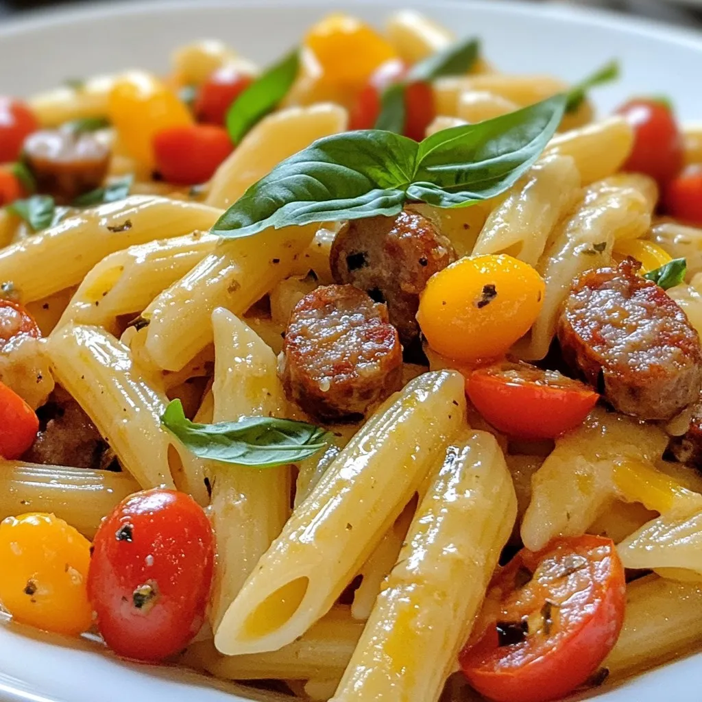 To make creamy smoked sausage pasta, gather these tasty ingredients: - 8 oz (225 g) penne pasta - 2 tablespoons extra-virgin olive oil - 12 oz (340 g) smoked sausage, sliced into bite-sized pieces - 1 medium onion, finely diced - 3 cloves garlic, finely minced - 1 red bell pepper, diced into small cubes - 1 cup cherry tomatoes, halved - 1 cup heavy cream - 1 cup freshly grated Parmesan cheese - 1 teaspoon smoked paprika - Salt and freshly ground black pepper to taste - Fresh basil leaves for garnish If you can’t find some ingredients, don’t worry! Here are some swaps you can try: - Pasta: You can use any pasta you like, such as fusilli or rigatoni. - Smoked Sausage: Try kielbasa or chicken sausage for a lighter option. - Heavy Cream: Use half-and-half or coconut cream for a different flavor. - Parmesan Cheese: Grate some Pecorino Romano or nutritional yeast for a vegan option. - Vegetables: Mix in zucchini, spinach, or mushrooms for more veggies. You’ll need some basic tools to whip up this dish: - A large pot for boiling pasta - A spacious skillet for sautéing - A colander to drain the pasta - A cutting board and knife for chopping - A cheese grater for the Parmesan These items make cooking easier, helping you create a delightful meal! {{ingredient_image_2}} To start, fill a large pot with 4 quarts of salted water. Bring it to a rolling boil. Add 8 ounces of penne pasta to the pot. Cook the pasta based on the package instructions, usually 10 to 12 minutes. You want it to be al dente. This means it should be firm when you bite into it. After cooking, drain the pasta in a colander. Set it aside while you prepare the other ingredients. Next, take a large skillet and heat 2 tablespoons of extra-virgin olive oil over medium heat. Wait until the oil shimmers. Add 12 ounces of sliced smoked sausage to the skillet. Sauté the sausage for about 5 minutes. You want it to be browned and a bit crispy. After that, remove the sausage from the skillet and set it aside. Keep the tasty fat from the sausage in the pan; it adds flavor to your dish. In the same skillet, add one finely diced medium onion. Cook it for about 2 to 3 minutes until it turns soft and translucent. Then, add 3 cloves of minced garlic and one diced red bell pepper. Sauté these for another 3 to 4 minutes. This will let the flavors blend. Now, stir in one cup of halved cherry tomatoes. Cook them until they begin to burst, which should take around 2 minutes. The juices from the tomatoes will add great taste. Now, lower the heat and pour in 1 cup of heavy cream. Stir well to mix everything. Gradually add 1 cup of freshly grated Parmesan cheese. Sprinkle in 1 teaspoon of smoked paprika as you stir. Keep stirring until the cheese melts and the sauce thickens a bit, about 2 to 3 minutes. Finally, return the browned sausage to the skillet. Add the drained penne pasta and toss everything together. Ensure the pasta is well coated in the creamy sauce. Taste it and add salt and black pepper as needed. Your creamy smoked sausage pasta is now ready to serve! To make your creamy smoked sausage pasta shine, use simple seasonings. Start with smoked paprika. This spice adds a warm, smoky flavor. Add salt and pepper to taste. Fresh herbs can boost the dish. Basil works well, but parsley is nice too. You can also sprinkle some red pepper flakes for a bit of heat. A creamy sauce needs to be smooth. To achieve this, heat the cream gently. Stir often to avoid burning. When you add Parmesan, do it slowly. This helps it melt evenly. If your sauce is too thick, add a splash of pasta water. This will loosen it up without losing flavor. How you present your dish matters! Serve the pasta in wide, shallow bowls. This lets the vibrant colors pop. For a touch of elegance, drizzle olive oil on top. Sprinkle extra Parmesan cheese for a beautiful finish. Lastly, add fresh basil leaves as a garnish. This not only looks great but adds more flavor too. Pro Tips Use Fresh Ingredients: Whenever possible, opt for fresh vegetables and high-quality sausage to enhance the overall flavor of your dish. Adjust the Creaminess: For a lighter version, substitute half the heavy cream with chicken broth or use a lighter cream alternative. Perfect Pasta Cooking: Make sure to cook the pasta just until al dente; it will continue to cook when mixed with the sauce, preventing it from becoming mushy. Customize Your Veggies: Feel free to add or substitute other vegetables, such as spinach or zucchini, to add more nutrition and flavor to the dish. {{image_4}} You can easily add more veggies to your creamy smoked sausage pasta. Try adding: - Spinach or kale for a green boost. - Zucchini, sliced thin for added crunch. - Mushrooms for a rich, earthy flavor. - Peas for a pop of sweetness. Cook these veggies with the onion and bell pepper. This adds color and nutrition. Switching up the sausage can change the dish’s flavor. You might try: - Chicken sausage for a leaner option. - Italian sausage for a spicy kick. - Turkey sausage for a lighter choice. Each type brings its own taste. Pick one that fits your mood! If you need gluten-free or dairy-free options, it's simple. Use: - Gluten-free penne pasta made from rice or corn. - Coconut cream or cashew cream instead of heavy cream. - Nutritional yeast for a cheesy flavor without dairy. These swaps keep your dish tasty while fitting your dietary needs. Enjoy your creamy smoked sausage pasta any way you like! To keep your creamy smoked sausage pasta fresh, let it cool first. Transfer the leftovers to an airtight container. Make sure to seal it tightly. Store the container in the fridge. It helps to label the container with the date. This way, you know when you made it. When you're ready to enjoy your leftovers, take them out of the fridge. You can reheat the pasta on the stove or in the microwave. If using the stove, add a splash of milk or cream to prevent it from drying out. Stir it gently over low heat until it is warm. In the microwave, 