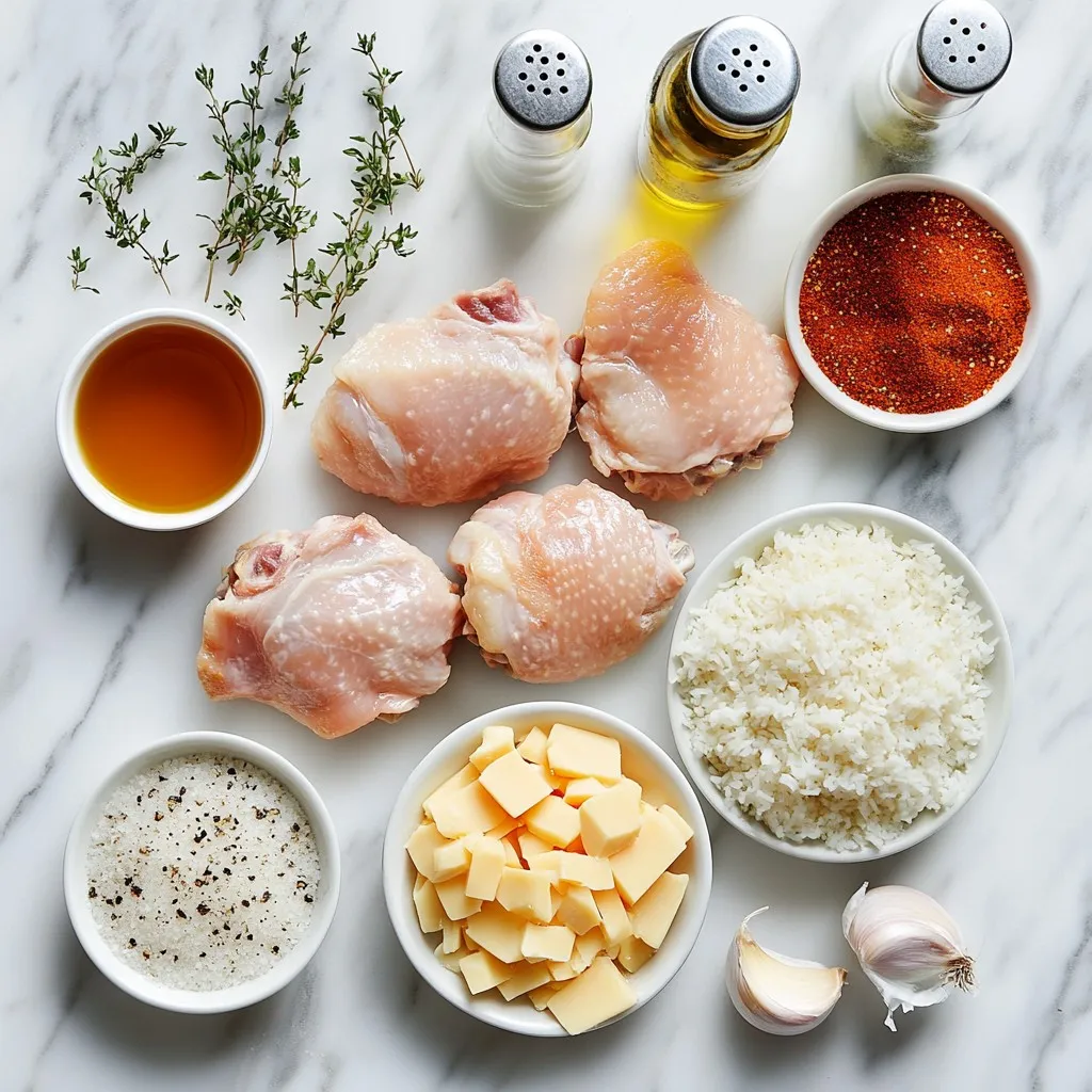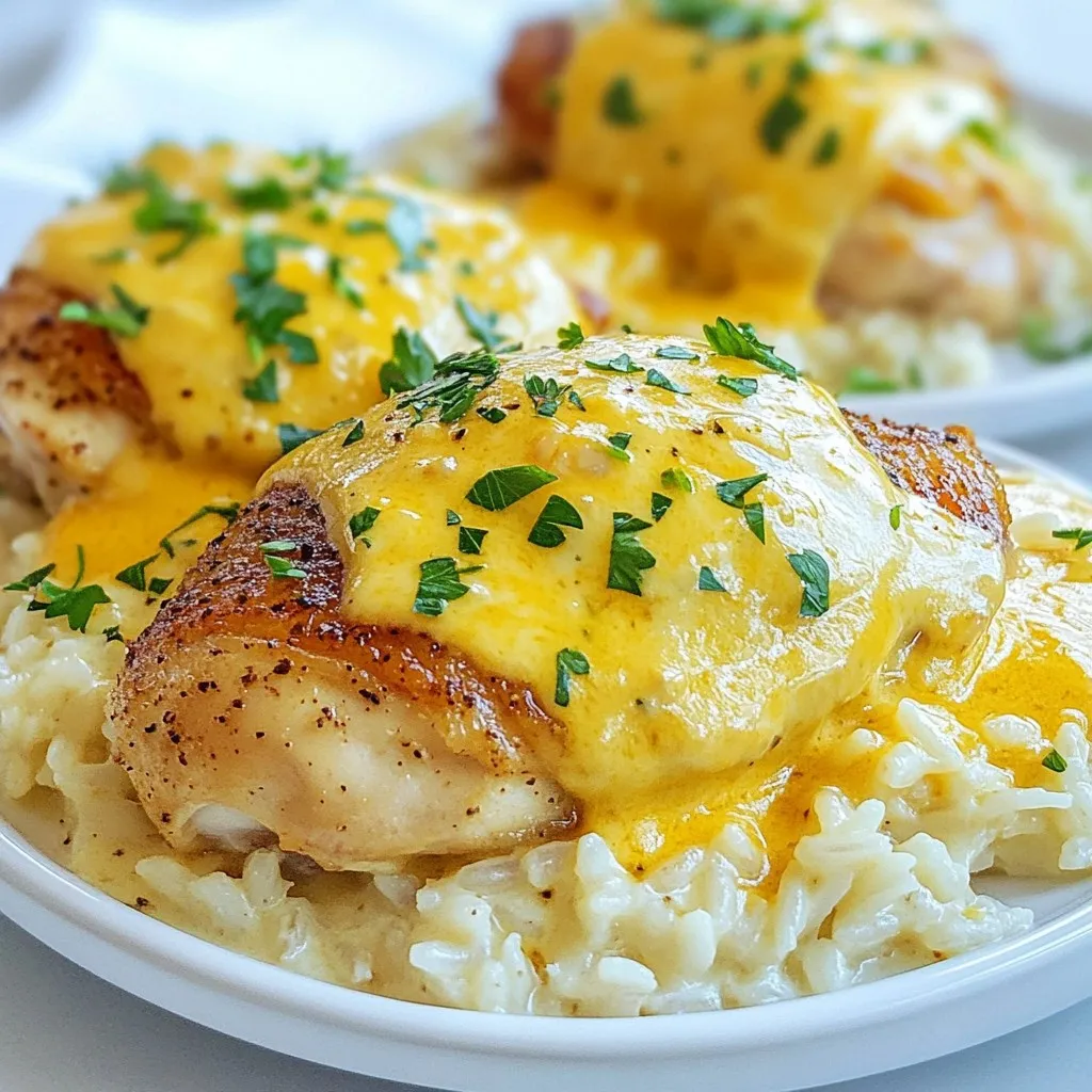 - 4 boneless, skinless chicken thighs - 1 cup long-grain rice - 2 cups low-sodium chicken broth - 1 medium onion, diced - 3 cloves garlic, minced - 1 cup heavy cream - 1 cup grated cheddar cheese - 1 teaspoon paprika - 1 teaspoon dried thyme - Salt and pepper, to taste - Fresh parsley, chopped (for garnish) To create my creamy smothered chicken and rice, I use a mix of fresh and simple ingredients. Chicken thighs bring a juicy texture, while long-grain rice absorbs flavors well. The low-sodium chicken broth adds warmth without too much salt. I love adding a diced onion and minced garlic for depth. Each brings its own sweet taste that blends so nicely. The heavy cream and cheddar make the dish rich and smooth. For seasonings, I use paprika and thyme. They enhance the chicken and rice with a warm, earthy taste. Salt and pepper balance everything out. Finally, I like to garnish with fresh parsley. It adds a pop of color and freshness to my dish. These ingredients come together to create a comforting meal that I always enjoy making and sharing. {{ingredient_image_2}} - Seasoning the chicken thighs: Begin by seasoning four boneless, skinless chicken thighs. Use salt, pepper, and paprika. Make sure to rub the spices into the meat. This step ensures a burst of flavor in every bite. - Searing the chicken for flavor: Heat two tablespoons of olive oil in a large skillet over medium-high heat. When the oil is hot, carefully add the seasoned chicken thighs. Sear each side for about 5–7 minutes until they are golden brown. The chicken should reach an internal temperature of 165°F (74°C). After searing, remove the chicken and set it aside. - Sautéing the vegetables: In the same skillet, lower the heat to medium. Add one diced onion and three cloves of minced garlic. Cook this mixture for 3–4 minutes until the onion is soft and fragrant. Stir occasionally to avoid burning. - Adding and cooking the rice: Next, add one cup of long-grain rice to the skillet. Stir well to coat the rice with oil and mix it with the onion and garlic. Let the rice cook for another 2 minutes. This step helps to enhance its flavor. - Whisking together heavy cream and cheese: While the rice cooks, take a mixing bowl and whisk together one cup of heavy cream and one cup of grated cheddar cheese. Mix until the sauce is smooth and well-combined. - Combining with rice: Once the rice is tender after about 15 minutes, stir in the creamy cheese mixture along with one teaspoon of dried thyme. Mix until everything is fully blended. - Nestling seared chicken back in: Place the seared chicken thighs back into the skillet. Ensure they are coated with the creamy rice mixture. This adds flavor and keeps the chicken moist. - Allowing flavors to meld: Let everything simmer together for an additional 5 minutes. This step allows the flavors to meld beautifully, creating a rich and comforting dish. - Ensuring chicken is cooked to the right temperature Always check the chicken's internal temperature. Use a meat thermometer to ensure it reaches 165°F (74°C). This keeps the chicken safe and juicy. - Enhancing rice flavor through sautéing Sauté the rice with onion and garlic for a few minutes. This step adds depth to the rice's taste. It helps the grains absorb the flavors when you add the broth. - Best ways to serve the dish Serve the creamy chicken and rice in shallow bowls. This lets the rice show beneath the chicken. It makes the dish look inviting and warm. - Garnishing for visual appeal Top your dish with fresh parsley. This bright green adds color and freshness. You can also sprinkle extra cheese on top for a cheesy finish. - Modifying cream and cheese ratios to taste If you want a richer dish, add more cream or cheese. For a lighter option, cut back on these ingredients. Adjust based on your family's preference. - Alternative ingredients for creaminess Try using Greek yogurt or sour cream for a tangy twist. You can also use a dairy-free cream for a different take, keeping the dish creamy and delicious. Pro Tips Season Well: Ensure to season not only the chicken but also the rice and vegetables as they cook. This enhances the overall flavor of the dish. Use Fresh Herbs: Fresh thyme or parsley can elevate the flavor profile significantly. Consider adding them at the end for a vibrant taste. Check Rice Doneness: If the rice isn't fully cooked after the suggested time, add a splash more broth and cover to steam for a few additional minutes. Make It Your Own: Feel free to customize the dish by adding vegetables like spinach or bell peppers for added nutrition and flavor. {{image_4}} You can easily change the protein in this dish. Using chicken breast instead of thighs gives a leaner option. Chicken breast cooks quickly and stays tender. If you prefer seafood, try substituting with shrimp. Shrimp cooks fast and adds a sweet flavor. Another option is tofu for a plant-based meal. Make sure to press the tofu to remove excess water before cooking. Adding veggies boosts flavor and nutrition. Spinach and peas work well in this dish. Simply stir them in during the last few minutes of cooking. They will wilt and blend into the creamy sauce. You can also use seasonal vegetables. Think about zucchini in summer or butternut squash in fall. These fresh additions make your meal colorful and tasty. Spice up the dish with different herbs and spices. For a kick, add red pepper flakes or cayenne pepper. This will give it heat without overpowering the creaminess. Fresh herbs like basil or cilantro can brighten the flavors too. Experiment with what you have on hand. Each change can turn the dish into a unique delight. To store leftovers, let the dish cool down. Place the creamy smothered chicken and rice in an airtight container. This helps keep it fresh. Use containers that seal well, like glass or plastic. They prevent moisture loss and keep flavors intact. It’s best to eat leftovers within three days for the best taste. For reheating, use a microwave o