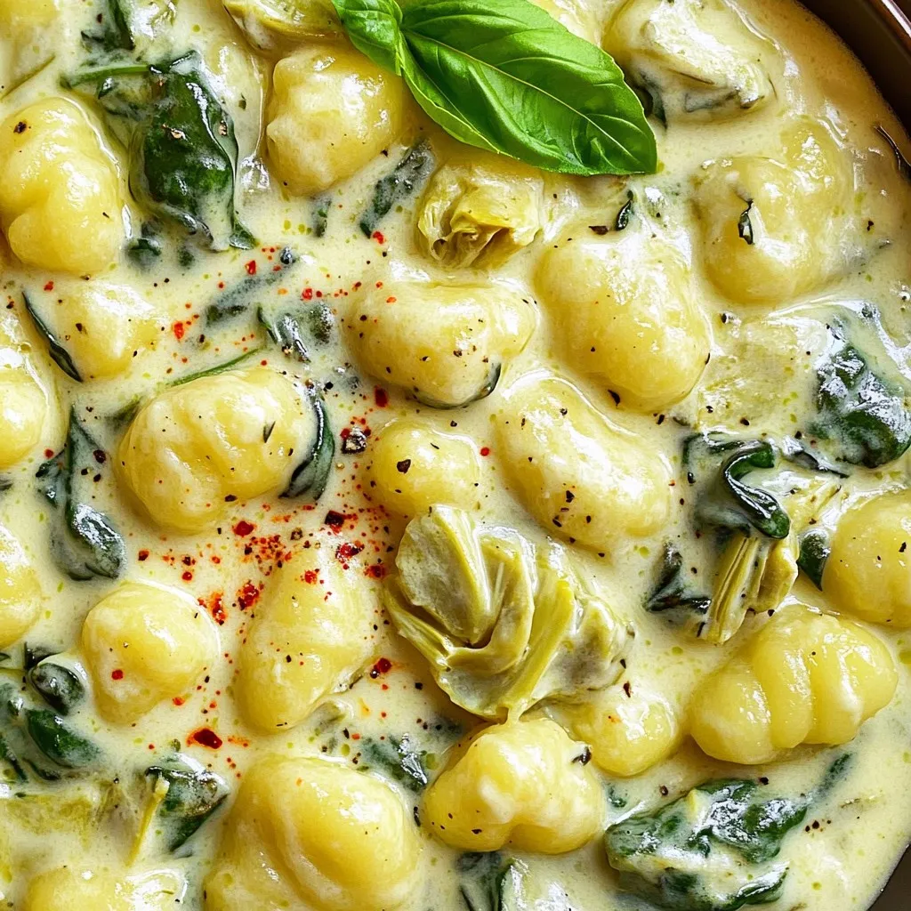 Finally, add the cooked gnocchi to the skillet. Gently fold them into the creamy sauce until each piece is coated. Let everything simmer for another 2-3 minutes. This will heat it through and blend the flavors perfectly. Serve your creamy spinach artichoke gnocchi in warm bowls, garnished with torn fresh basil or parsley leaves. Enjoy!