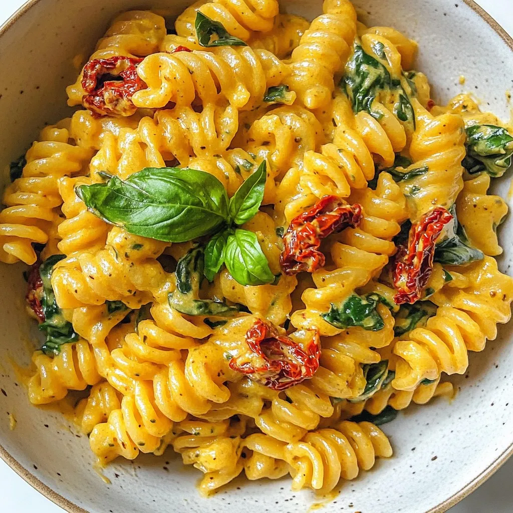 A delicious and creamy vegan pasta dish featuring sun-dried tomatoes and spinach.