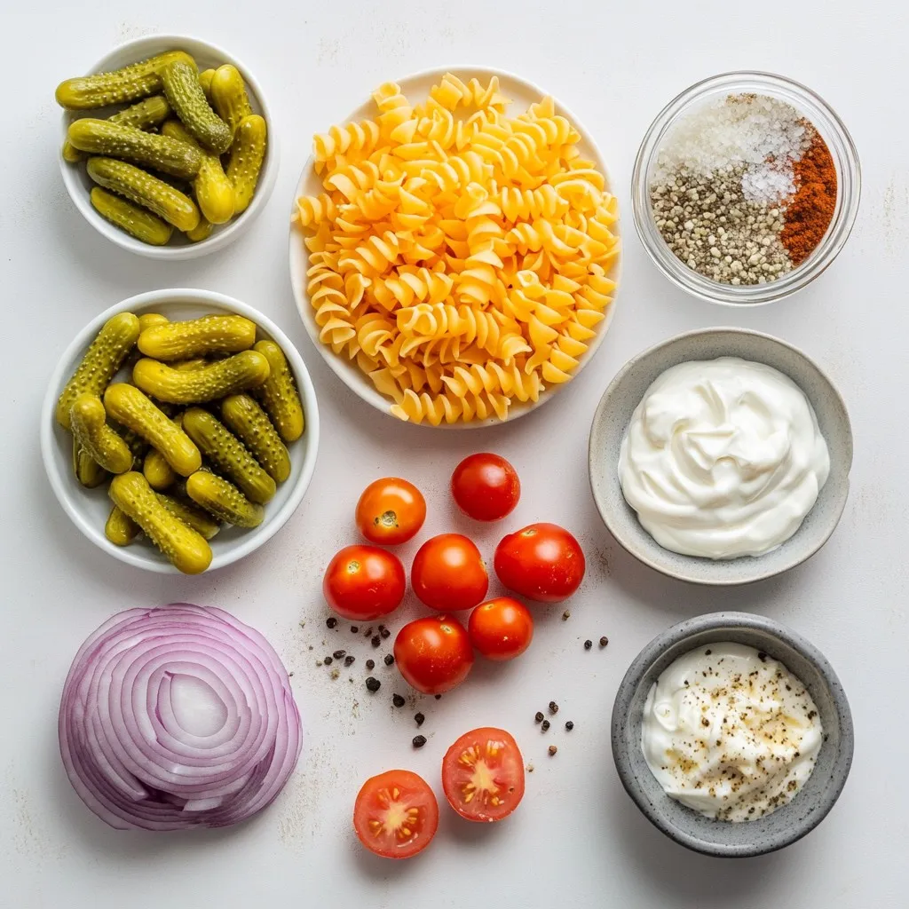 This list covers the key parts of the dish. You can choose rotini or penne for your pasta. Both work well and hold the dressing nicely. I like using dill pickles for their tangy crunch. The red onion adds a sweet bite, while the cherry tomatoes bring freshness.