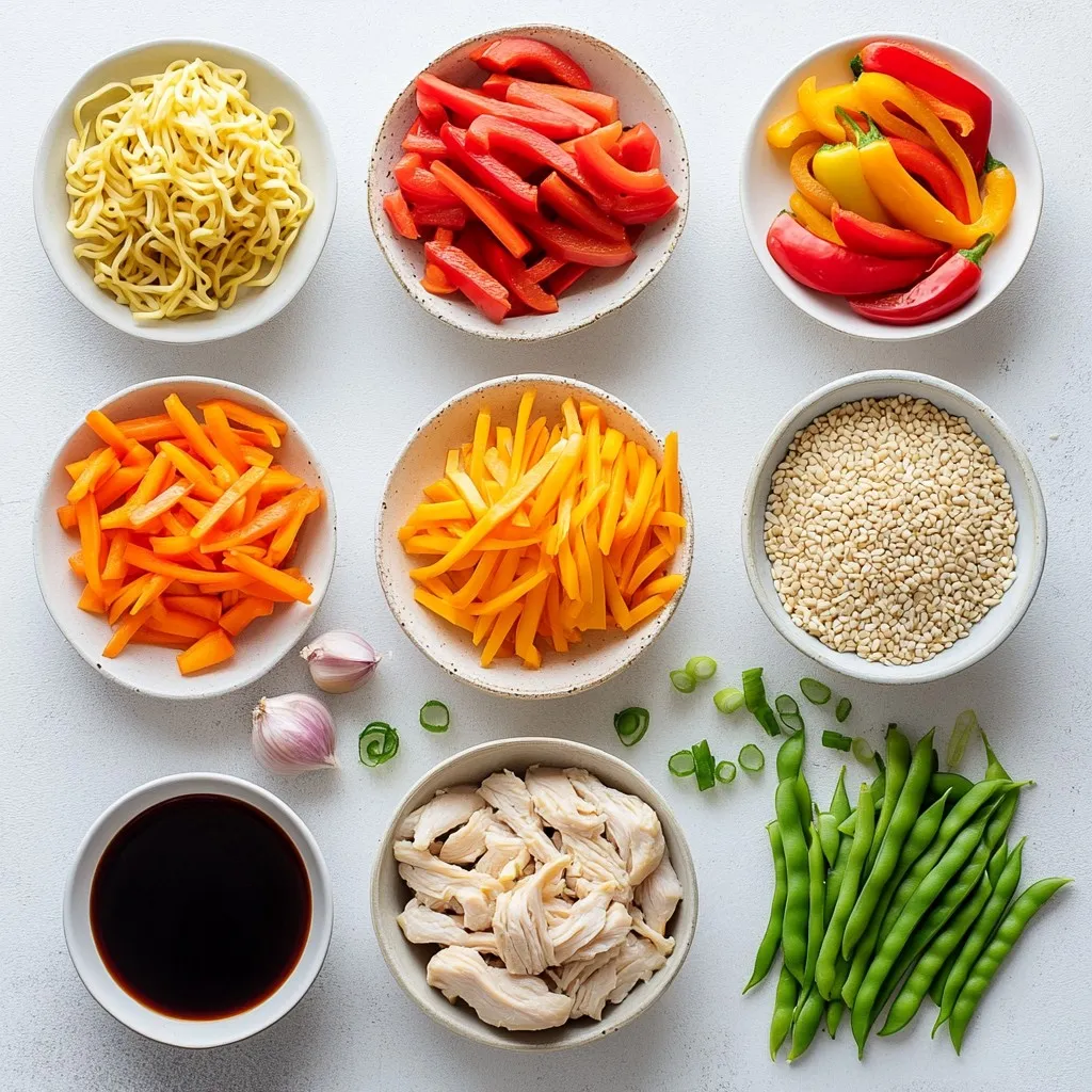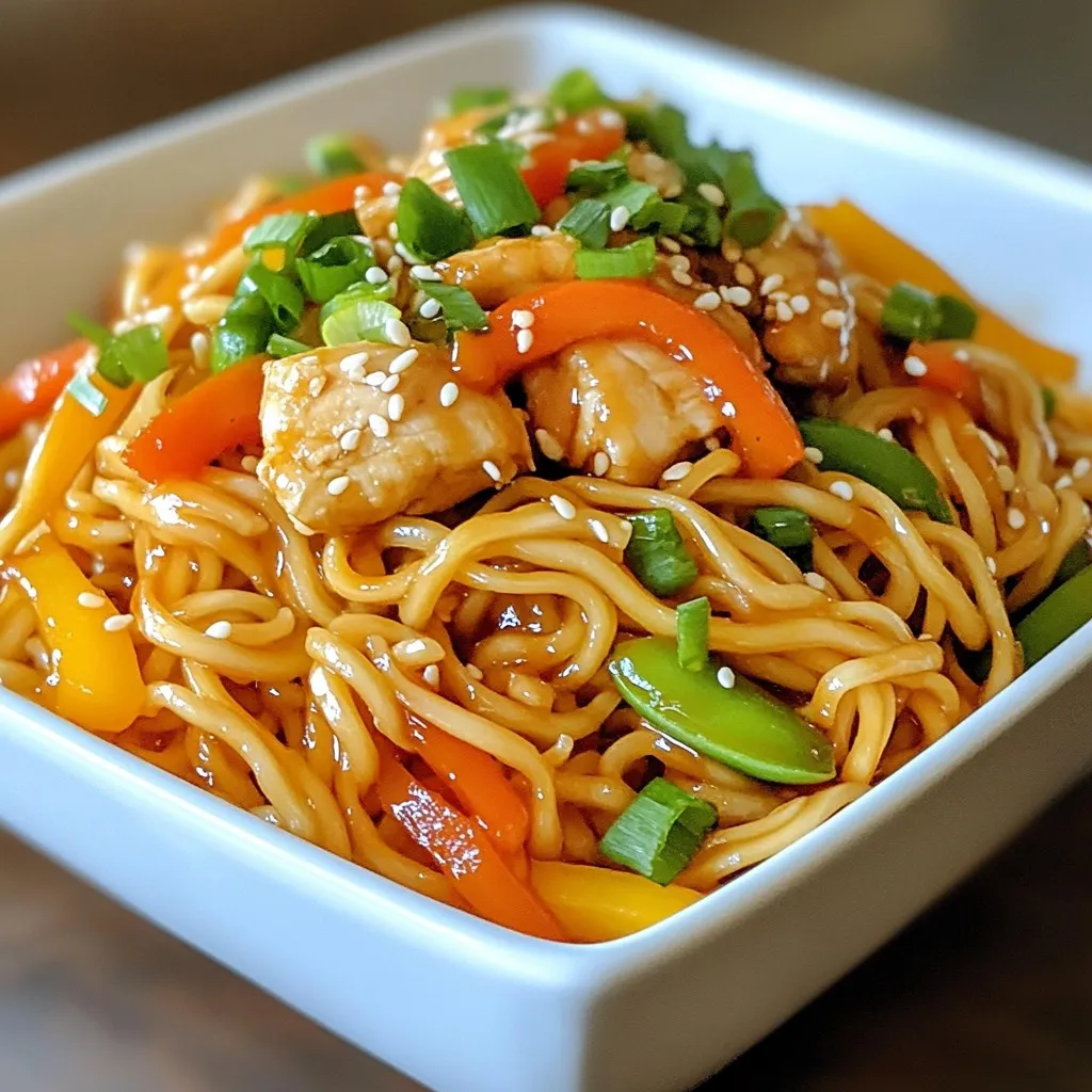 - 8 oz lo mein noodles - 1 lb boneless, skinless chicken breast, thinly sliced - 2 tablespoons soy sauce - 1 tablespoon oyster sauce - 1 tablespoon sesame oil - 1 cup bell peppers, julienned - 1 cup snap peas or snow peas - 1/2 cup carrots, julienned - 3 green onions, chopped - 2 cloves garlic, minced - 1 tablespoon fresh ginger, grated - Salt and pepper to taste - Optional: sesame seeds for garnish When choosing vegetables, look for fresh and crisp options. Bright colors mean good flavor. For bell peppers, mix red, yellow, and green for a colorful dish. You can swap snap peas with snow peas if you prefer. If you do not have lo mein noodles, use spaghetti or rice noodles. For a gluten-free version, replace soy sauce with tamari. You can skip oyster sauce or use a vegan version. If you are out of sesame oil, try using vegetable oil. These swaps will still keep your dish tasty and fun! {{ingredient_image_2}} 1. Cooking the lo mein noodles: Start by boiling salted water in a large pot. Add the lo mein noodles and cook them until they are tender, following the package instructions. This usually takes about 4 to 6 minutes. 2. Preventing sticking with sesame oil: Once cooked, drain the noodles. To keep them from sticking together, toss them with a little sesame oil. This step adds flavor and helps them stay separate. Set the noodles aside for later. 1. How to marinate properly: In a mixing bowl, combine the thinly sliced chicken with soy sauce, oyster sauce, salt, and pepper. Toss until the chicken is well-coated in the sauce. 2. Timing for marination: Let the chicken marinate for 10 to 15 minutes. This allows the flavors to soak into the meat, making it tasty and juicy. 1. Stir-frying the chicken: Heat a large skillet or wok over medium-high heat. Add 1 tablespoon of sesame oil. Once the oil is hot, add the marinated chicken. Stir-fry for 5 to 7 minutes, until the chicken turns golden brown and is fully cooked. Remove it from the pan and set it aside. 2. Cooking the vegetables: In the same skillet, add more sesame oil if needed. Add minced garlic and grated ginger, cooking for about 30 seconds until fragrant. Then, add the bell peppers, snap peas, and carrots. Stir-fry for 3 to 4 minutes until the veggies are bright and tender but still crisp. 3. Combining everything: Return the chicken to the skillet. Add the cooked lo mein noodles and gently toss everything together. Ensure the chicken and noodles are well-coated with the sauce, cooking for another 2 to 3 minutes to let the flavors blend. 1. Adding green onions: Just before serving, stir in the chopped green onions. This gives a fresh crunch to the dish. 2. Adjusting seasoning: Taste your dish and add more salt or pepper if needed. This step is key to making your Easy Chicken Lo Mein just right for your palate. - Overcooking the noodles: It's easy to cook noodles too long. Follow the package time carefully. Noodles should be al dente, not mushy. This keeps them from clumping in the stir-fry. - Ignoring the marination time: Marinating chicken is key. Let it sit for at least 10 minutes. This helps the chicken soak up flavors. Skipping this step will make your meal taste bland. - Suggestions for additional seasonings: You can add a splash of rice vinegar or chili oil for a twist. These bring a bright and spicy kick. You can also try a dash of five-spice powder for a deeper flavor. - How to achieve the best stir-fry texture: Use high heat and a good pan. A wok is ideal but any large skillet works. Keep your ingredients moving to avoid burning. This method helps everything cook evenly and stay crisp. - Recommended side dishes: Serve with spring rolls or dumplings for a full meal. A side of steamed broccoli or a simple salad also pairs well. These sides add color and balance to your plate. - Best ways to serve and present: Use a large platter for a family-style meal. For individual servings, use bowls to show off the colorful veggies. A sprinkle of sesame seeds on top adds a nice touch and crunch. Pro Tips Use Fresh Ingredients: Fresh vegetables and herbs will enhance the flavor and texture of your lo mein. Opt for seasonal produce when possible for the best taste. Don’t Overcook the Noodles: Make sure to cook the lo mein noodles just until al dente. They will continue to cook slightly when combined with the hot ingredients. High Heat is Key: Stir-frying over high heat allows the chicken and vegetables to sear quickly, locking in flavors and maintaining a crisp texture. Customize Your Protein: Feel free to swap out the chicken for shrimp, beef, or tofu to suit your taste preferences or dietary needs. {{image_4}} You can switch up the veggies in your Chicken Lo Mein. Here are some fun ideas: - Broccoli florets - Baby corn - Mushrooms - Zucchini strips Using seasonal vegetables makes your dish fresh. In summer, add tomatoes or bell peppers. In winter, use root veggies like carrots or squash. This keeps your meal exciting and healthy. Want to try something different? You can use shrimp, tofu, or beef. Here’s how: - Shrimp: Cook them for just 3-4 minutes until pink. - Tofu: Press it to remove extra water, then cube it. Cook until golden brown. - Beef: Thinly slice flank steak and stir-fry for about 3-5 minutes. Cooking times vary, so pay attention. Make sure each protein is cooked through for safe eating. Do you like heat? Add red pepper flakes or a dash of chili sauce. Start with a small amount to avoid overpowering the dish. If you prefer milder flavors, try these options: - Use less soy sauce. - Add a splash of coconut milk for creaminess. These changes make your Chicken Lo Mein just right for your taste. Enjoy experimenting! To keep Chicken Lo Mein fresh, store it in airtight containers. This helps avoid moisture loss. Let the dish cool to room temperature before sealing. Label the container with the date. This way, you know when to eat it. Use glass or sturdy plastic containers for best results. They help maintain the flavor and texture. To 