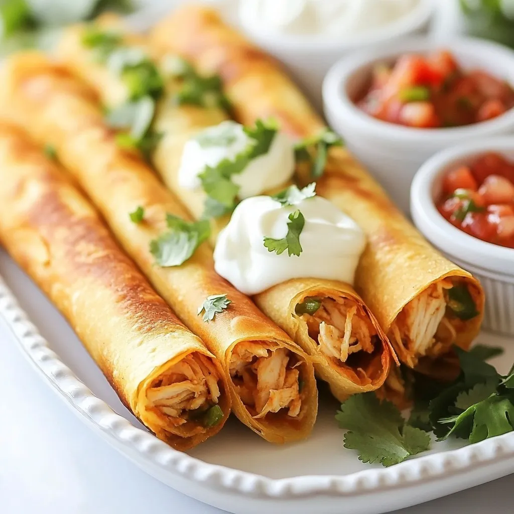 Deliciously crispy taquitos filled with shredded chicken and cheese, perfect for dipping.