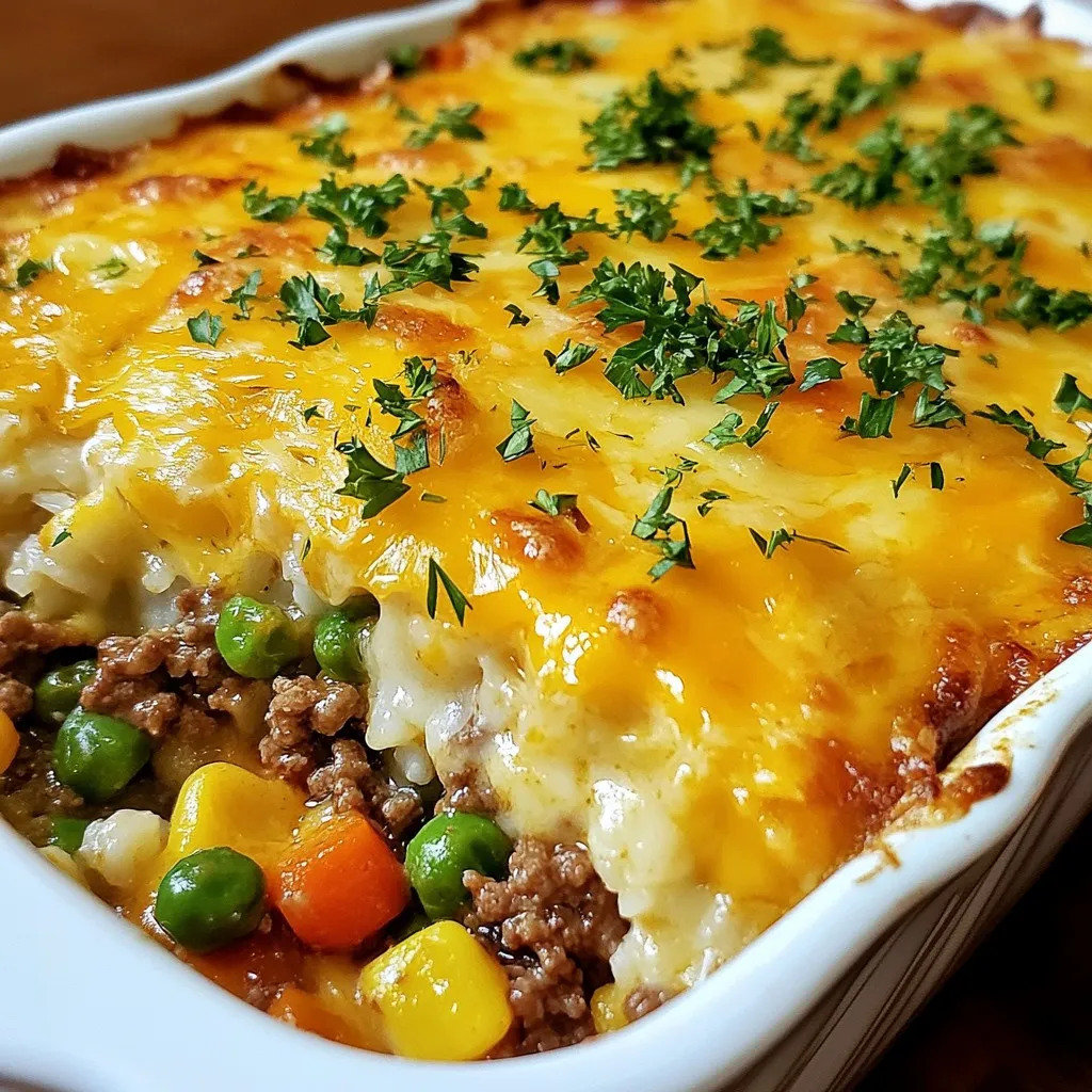 A comforting and filling casserole made with ground beef, vegetables, and cheese.
