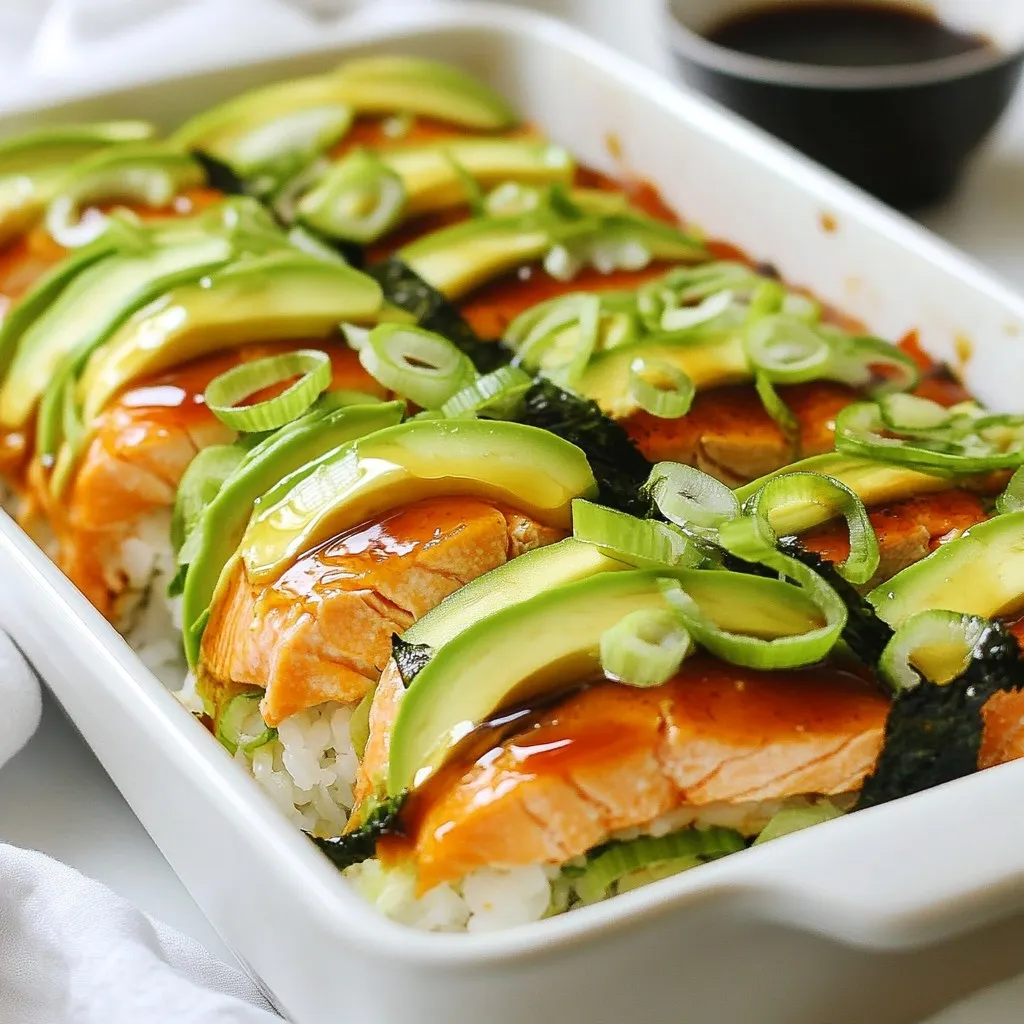 A delicious and spicy baked sushi dish featuring salmon, avocado, and seasoned rice.