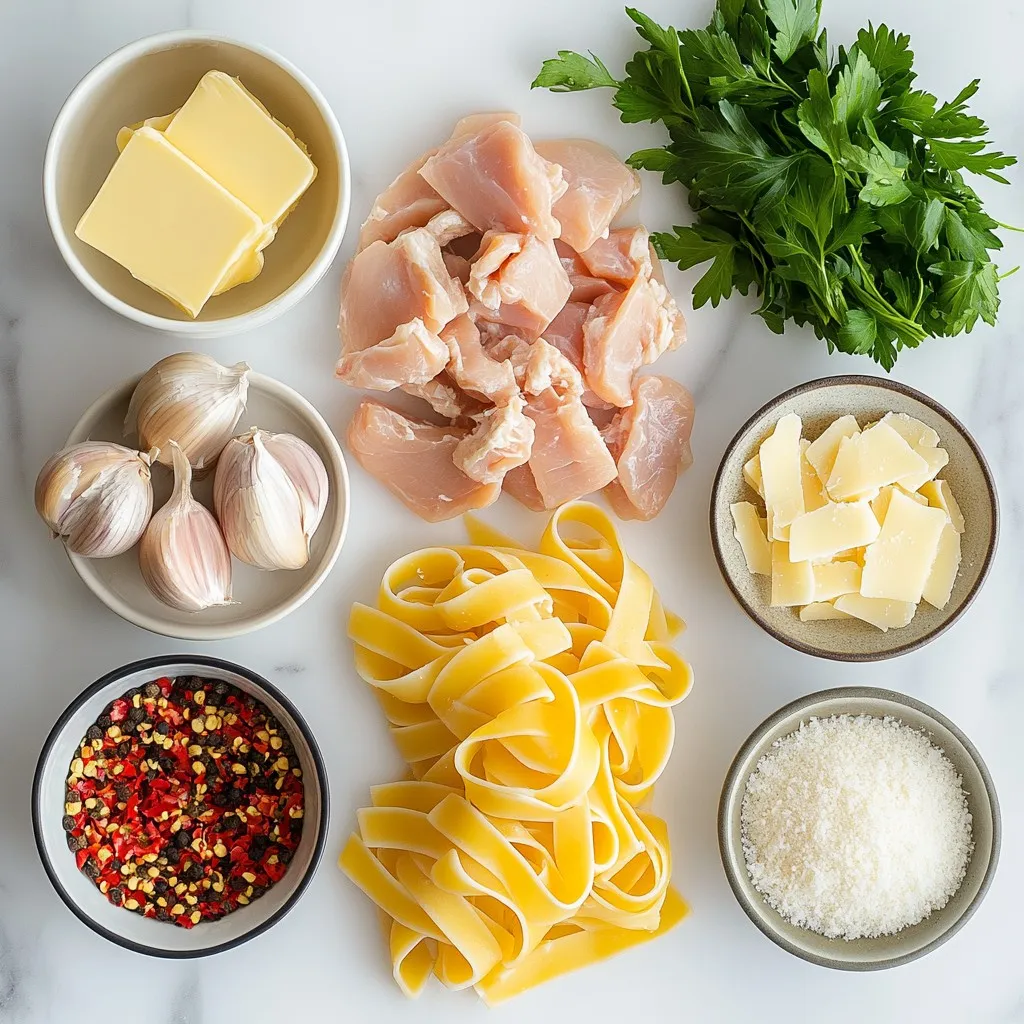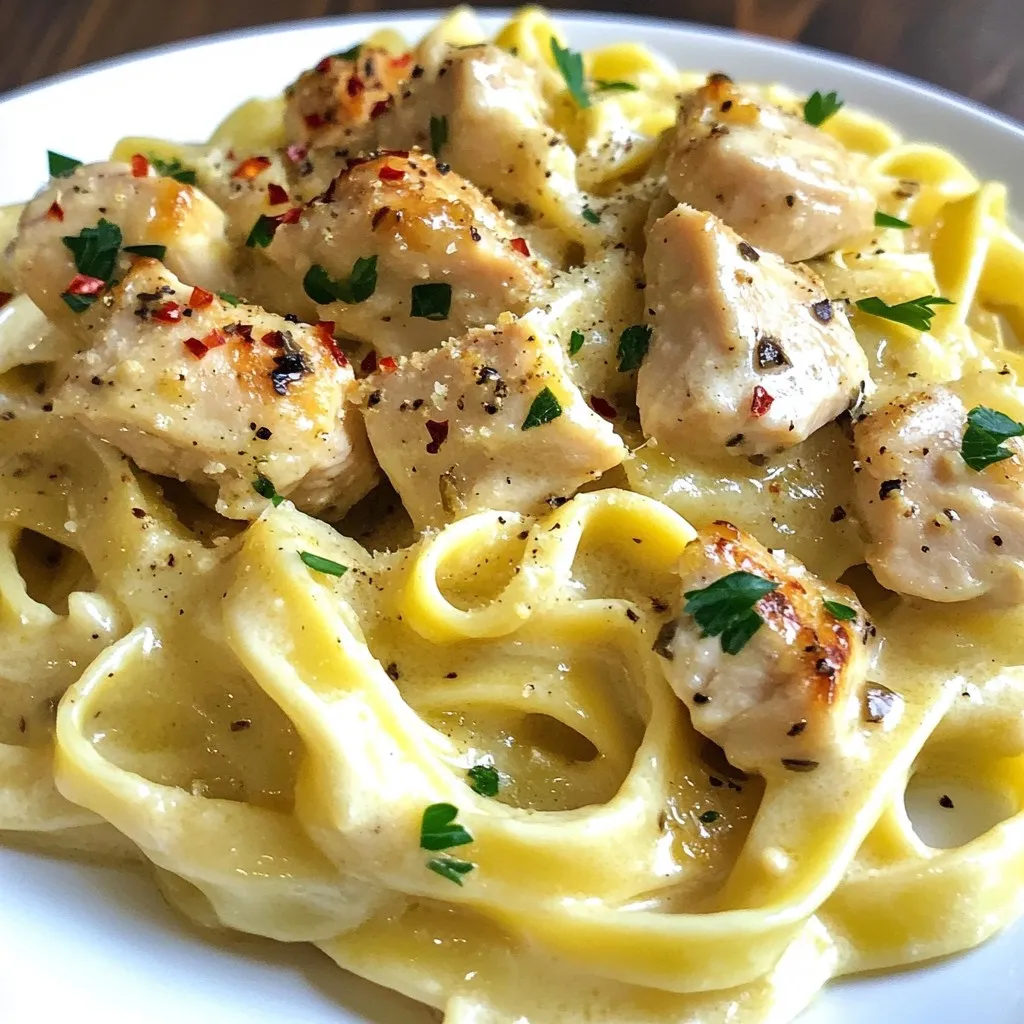 A creamy and flavorful pasta dish with tender chicken and garlic butter sauce.