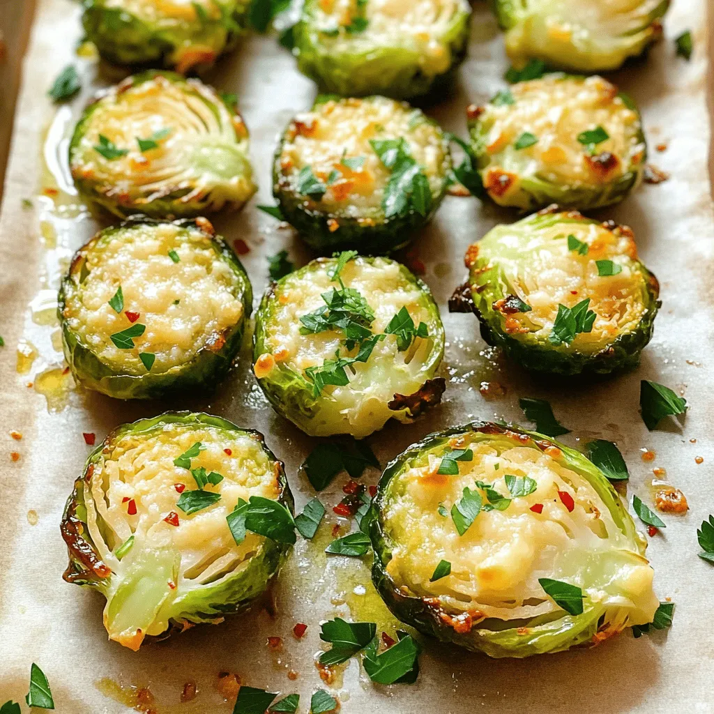 - 1 lb Brussels sprouts, trimmed and halved - 4 cloves garlic, minced - 1/4 cup finely grated Parmesan cheese - 3 tablespoons extra virgin olive oil - 1 teaspoon aged balsamic vinegar - 1/2 teaspoon sea salt - 1/4 teaspoon freshly ground black pepper - 1/4 teaspoon red pepper flakes (optional, for a spicy kick) - Fresh parsley, finely chopped (for garnish) If you cannot find Brussels sprouts, try green beans or broccoli. Instead of Parmesan, use Pecorino Romano for a sharper flavor. If you want a dairy-free option, skip the cheese or use a vegan cheese alternative. For olive oil, avocado oil works well too. You can replace balsamic vinegar with lemon juice to add brightness. Each serving of Garlic Parmesan Roasted Brussels Sprouts contains about: - Calories: 150 - Protein: 5g - Carbohydrates: 9g - Dietary Fiber: 4g - Total Fat: 12g - Saturated Fat: 2g - Sodium: 250mg These sprouts are a tasty, healthy side dish. They provide fiber, vitamins, and minerals. Enjoying them helps you eat more veggies in a fun way! First, set your oven to 425°F (220°C). While it heats, take a baking sheet. Line it with parchment paper. This helps keep the Brussels sprouts from sticking. It also makes cleanup easy. In a large bowl, add the halved Brussels sprouts. Next, add the minced garlic. Pour in the olive oil and aged balsamic vinegar. Then, add the sea salt, black pepper, and red pepper flakes if you want heat. Mix everything well. Make sure each sprout gets coated in the oil and seasonings. Now, spread the Brussels sprouts on the lined baking sheet. Make sure they are in a single layer. This spacing is key. It helps them roast well instead of steaming. Place the baking sheet in the oven. Roast for 20 to 25 minutes. Halfway through, take them out and stir. This helps them brown evenly. When they are done, they should be caramelized and fork-tender. After roasting, take them out and add the grated Parmesan cheese. Place them back in the oven for 5 minutes. This allows the cheese to melt and turn golden. Finally, transfer the Brussels sprouts to a serving dish. Garnish with chopped parsley for a fresh touch. To get the best results, follow a few key steps. First, always preheat your oven to 425°F (220°C). This high heat is crucial for crisping the Brussels sprouts. Next, ensure you cut the sprouts in half and trim them well. This helps them cook evenly. Spread them out on the baking sheet. Do not crowd them. Each sprout needs space to roast, not steam. Stir them halfway through cooking. This promotes even browning. Aim for a nice caramelization for that rich flavor. While the garlic and Parmesan shine, you can add more flavor. Try mixing in lemon zest for a bright taste. Smoked paprika can give a warm, smoky flavor. For a spicy kick, sprinkle in more red pepper flakes. You might also add some fresh herbs, like thyme or rosemary, to deepen the taste. Experiment with these options to find your perfect mix! Presentation matters, especially for this dish. Serve the Brussels sprouts warm on a nice platter. Arrange them in a circle for a beautiful display. Drizzle some aged balsamic vinegar around the plate. This adds color and enhances the dish's flavor. Finally, sprinkle freshly chopped parsley on top. This gives a pop of green and freshness. Your guests will love the look and taste! {{image_4}} You can make this dish even better by adding different cheeses. While Parmesan gives a nice flavor, try using Pecorino Romano for a sharper taste. Crumbled feta adds a creamy touch, and mozzarella brings a gooey texture. Feel free to mix and match! Cheese can change the whole dish, making it special for any meal. Brussels sprouts pair well with many veggies. Try adding carrots for sweetness or bell peppers for color. You can also include red onions for a nice bite. Mix in sweet potatoes for a hearty side dish. Each vegetable brings its own flavor, creating a more colorful plate. If you love heat, spice it up! Add jalapeños or serrano peppers to the mix. You can also use smoked paprika for a warm flavor. A drizzle of sriracha or hot sauce can take it to the next level. Just be careful not to overdo it! Spicy options make the dish exciting and fun to eat. To keep your Garlic Parmesan Roasted Brussels Sprouts fresh, place them in an airtight container. They stay good in the fridge for about 3 to 4 days. Make sure they cool down before you seal them. This helps keep the texture nice. If you have a lot, consider dividing them into smaller portions. It helps when you want to reheat just enough for a meal. When it’s time to enjoy leftovers, the oven is your best friend. Preheat your oven to 350°F (175°C). Spread the Brussels sprouts on a baking sheet. Heat them for about 10-15 minutes. This will make them crispy again. You can also use a microwave if you're in a hurry. Just place them in a microwave-safe bowl and heat for 1-2 minutes. Keep an eye on them to avoid sogginess. You can freeze Garlic Parmesan Roasted Brussels Sprouts if you want to save them longer. First, let them cool completely. Then, place them in a freezer-safe bag. Remove as much air as you can before sealing. They can last for about 2-3 months in the freezer. When you're ready to eat, just thaw them in the fridge overnight. Then, reheat in the oven for the best results. Yes, you can use frozen Brussels sprouts. Just remember to thaw them first. Drain any excess water after thawing. This helps avoid sogginess while roasting. Keep in mind that frozen sprouts may not be as crisp as fresh ones. You have many options for seasonings. Try adding lemon zest for a fresh touch. You can also use garlic powder if you want a milder garlic flavor. Other spices like paprika or Italian herbs can bring new tastes. Experiment with what you love best! Check the Brussels sprouts after 20-25 minutes in the oven. They should be golden brown and tender. A fork can help test their softness. If they are not brown enough, roast them a little longer. Keep an eye on them to pr