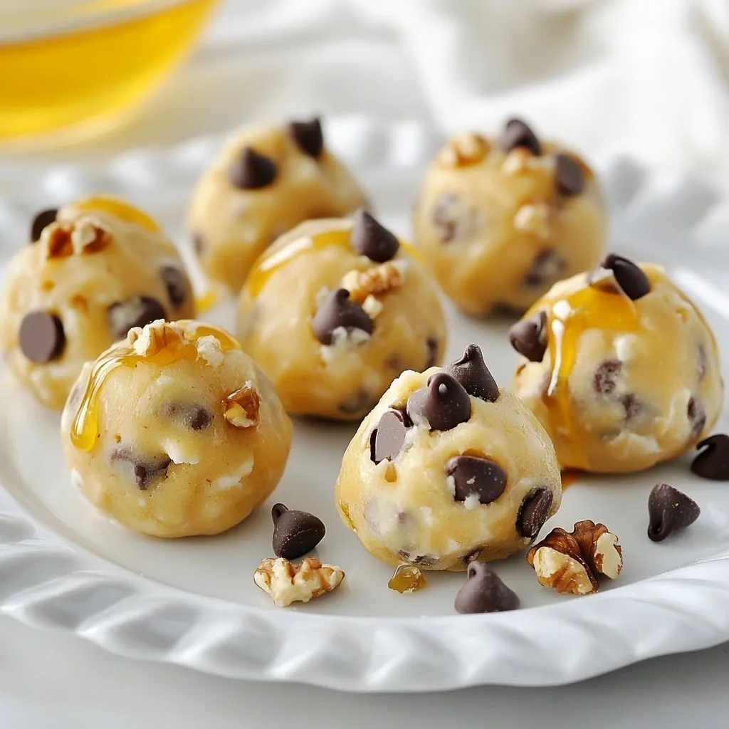 For an enticing presentation, arrange the cookie dough bites on a decorative plate. Drizzle a small amount of extra honey over the top and sprinkle additional chocolate chips for a visually appealing finish.
