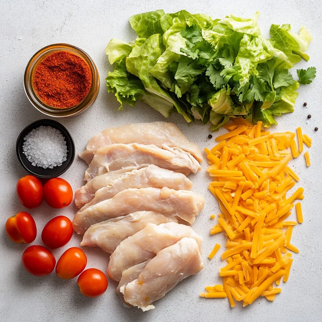 Layer the sliced chicken with a generous handful of finely shredded romaine lettuce, halved cherry tomatoes, and a sprinkle of sharp cheddar cheese for extra flavor.