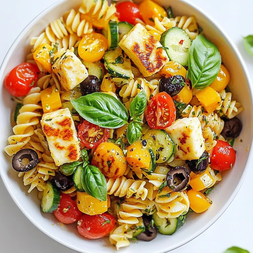 A refreshing pasta salad featuring halloumi cheese, fresh vegetables, and a zesty dressing.