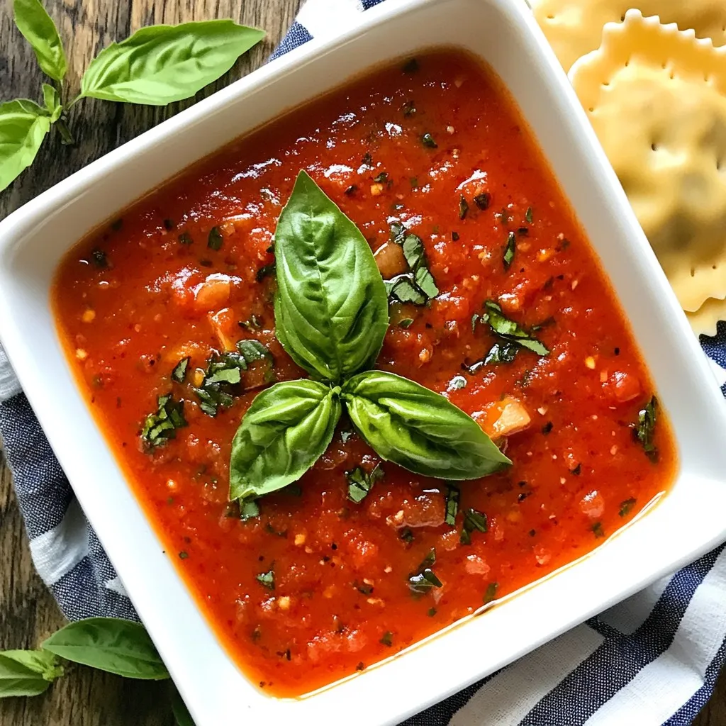 To make a rich and tasty ravioli sauce, you need the following: - 2 tablespoons extra virgin olive oil - 1 medium onion, finely chopped - 4 cloves garlic, minced - 1 can (28 ounces) crushed tomatoes - 1 tablespoon tomato paste - 1 teaspoon sugar - 1 teaspoon dried oregano - 1 teaspoon dried basil - Salt and freshly ground black pepper to taste - Fresh basil leaves for garnish You can swap some items if needed: - Use cooking oil instead of olive oil. - Sweet onion can replace the regular onion. - Canned diced tomatoes work well instead of crushed tomatoes. - Use fresh herbs if you have them. Just add more for a stronger taste. - For a vegan option, ensure the sugar is vegan-friendly. - Extra Virgin Olive Oil: This adds a fruity note. Choose a good quality for best flavor. - Onion: A finely chopped onion gives sweetness and depth. - Garlic: Fresh garlic is key. It gives the sauce its wonderful aroma. - Crushed Tomatoes: Look for high-quality brands for a bright taste. - Tomato Paste: This thickens the sauce and adds richness. - Sugar: A small amount helps balance the acidity of tomatoes. - Dried Herbs: Use dried herbs for a more concentrated flavor. Adjust based on your taste. - Salt and Pepper: Season well. This enhances all the flavors in the sauce. These ingredients and tips will help you create a sauce that pairs perfectly with your homemade ravioli. Enjoy the rich and comforting taste! {{ingredient_image_2}} To make a hearty tomato basil marinara, start by gathering your ingredients. In a large saucepan, heat 2 tablespoons of extra virgin olive oil over medium heat until it shimmers. Next, add 1 finely chopped medium onion. Sauté the onion for about 5 to 7 minutes. You want it soft and translucent. Now, stir in 4 minced garlic cloves. Cook this mix for 1 to 2 minutes. Be careful! If you brown the garlic, it can taste bitter. After that, pour in 28 ounces of crushed tomatoes and 1 tablespoon of tomato paste. Stir well to combine all the flavors. Next, add 1 teaspoon of sugar, 1 teaspoon of dried oregano, and 1 teaspoon of dried basil. Mix everything together. This helps the herbs spread their flavor throughout the sauce. Then, season it with salt and freshly ground black pepper to taste. Increase the heat until the sauce begins to simmer. Once it simmers, reduce the heat to low. Let it cook uncovered for about 20 to 25 minutes. Stir occasionally to stop it from sticking. This simmering allows the flavors to meld beautifully. When the sauce thickens, remove it from the heat. Allow it to cool slightly before serving. Sautéing garlic and onion can make or break your sauce. Start with medium heat. Too high, and your onion may burn. Cook the onion for 5 to 7 minutes until it is soft and clear. When you add garlic, watch it closely. Cook it for just 1 to 2 minutes. You want it fragrant but not brown. If it turns brown, it can taste bitter, ruining your sauce. The total cooking time for this sauce is about 40 minutes. Prep time is around 10 minutes. - Sauté the onion for 5 to 7 minutes. - Cook the garlic for 1 to 2 minutes. - Simmer the sauce for 20 to 25 minutes. These times help develop rich flavors in your sauce. Stir occasionally to keep it from sticking. Enjoy the process and the wonderful aroma filling your kitchen! To make your homemade ravioli sauce stand out, use fresh ingredients. Fresh herbs like basil can boost flavor. I recommend using good-quality olive oil. It adds richness and depth to the sauce. When cooking onions, let them soften fully. This step builds a sweet base for your sauce. Adding sugar to the sauce helps balance acidity from the tomatoes. Stir in the sugar after the tomatoes. It makes a big difference. For a deeper flavor, let the sauce simmer longer. This allows the flavors to meld beautifully. One common mistake is overcooking garlic. If it burns, it can make the sauce bitter. Keep an eye on it as you cook. Another error is not seasoning enough. Taste your sauce as it cooks. Adjust the salt and pepper to your liking. Avoid using canned tomatoes that are not crushed. Whole or diced tomatoes can change the texture. Stick to crushed tomatoes for a smooth sauce. Lastly, don't skip the simmering step. It helps thicken the sauce and deepen the flavor. When serving your ravioli, add a generous scoop of sauce on top. This helps the pasta soak up the flavor. For a nice touch, sprinkle fresh basil leaves over the dish. A drizzle of olive oil adds shine and richness. You can also serve with grated cheese, like Parmesan. It adds a salty, nutty flavor. Pair your ravioli with a side salad or garlic bread for a complete meal. Explore different ravioli fillings too, like cheese or spinach. Each filling complements the marinara sauce in its own way. Pro Tips Use Fresh Ingredients: Fresh basil and high-quality crushed tomatoes can significantly enhance the flavor of your marinara sauce. Adjust the Consistency: If you prefer a thicker sauce, let it simmer longer, and if you like it thinner, add a splash of water or broth. Flavor Enhancements: Consider adding a pinch of red pepper flakes for a subtle heat or a splash of red wine for depth. Storage Tips: This sauce can be made in advance and stored in the refrigerator for up to a week or frozen for up to three months. {{image_4}} You can easily make this sauce vegan. Start by using olive oil, as usual. Instead of adding any cheese, consider using nutritional yeast. This will give a nice cheese-like flavor. You can also add more vegetables. Try bell peppers or mushrooms for extra depth. They add great taste and texture. For gluten-free ravioli sauce, focus on the ingredients. The base sauce is naturally gluten-free. Just ensure your ravioli is gluten-free too. Look for brands that use rice or corn flour. This way, you can enjoy your meal without worry. Want to add a kick? You can spice up the sauce easily. Add red pepper flakes for heat. Start with a pinch and adjust to your taste. If you want more flavor, consider fresh herbs. Add