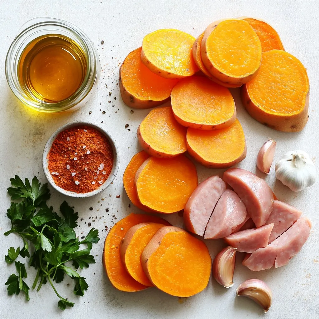 Sweet potatoes are the star of this dish. They bring a sweet and creamy texture. Chicken or turkey sausage adds a savory touch. Honey gives a sweet glaze, while garlic adds depth. Olive oil helps everything roast perfectly.