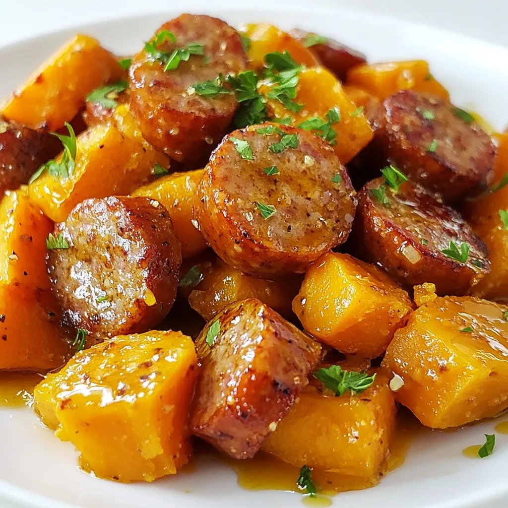 A delicious medley of roasted sweet potatoes and honey garlic sausage, perfect for a hearty meal.