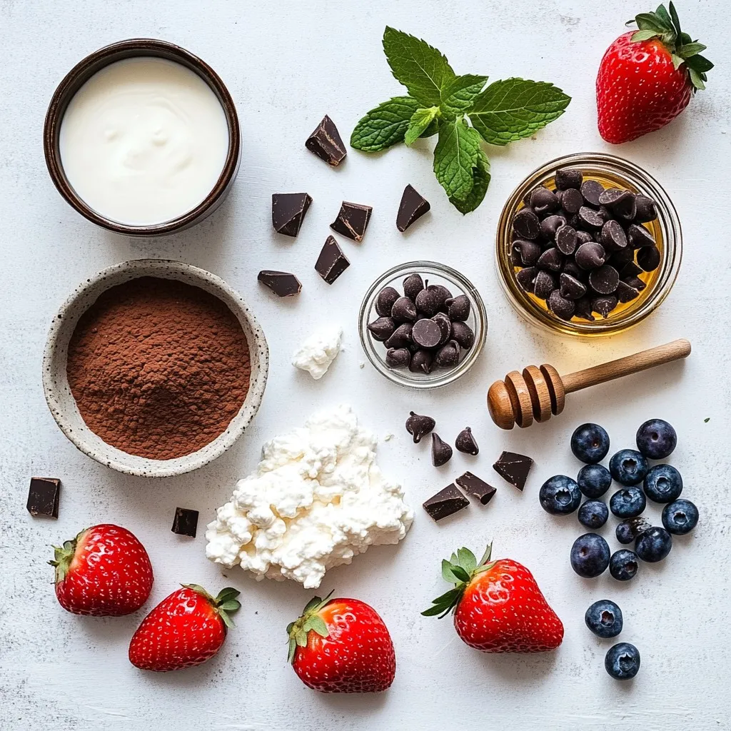 To make this cottage cheese chocolate mousse, gather these key ingredients. Fresh cottage cheese gives the mousse a creamy texture. Cocoa powder provides rich chocolate flavor. Honey or maple syrup sweetens the mix, but adjust it to your taste. Pure vanilla extract enhances the overall flavor, while sea salt balances the sweetness.